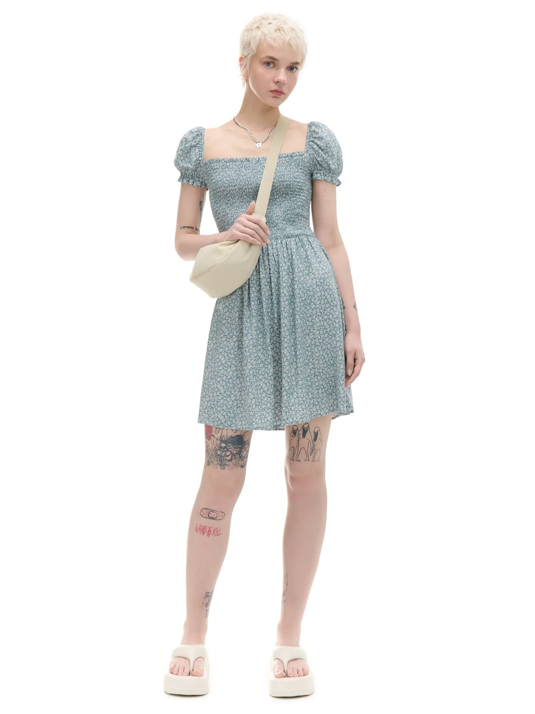 Sukienka mini z bufiastymi rękawami i kwiatowym nadrukiem