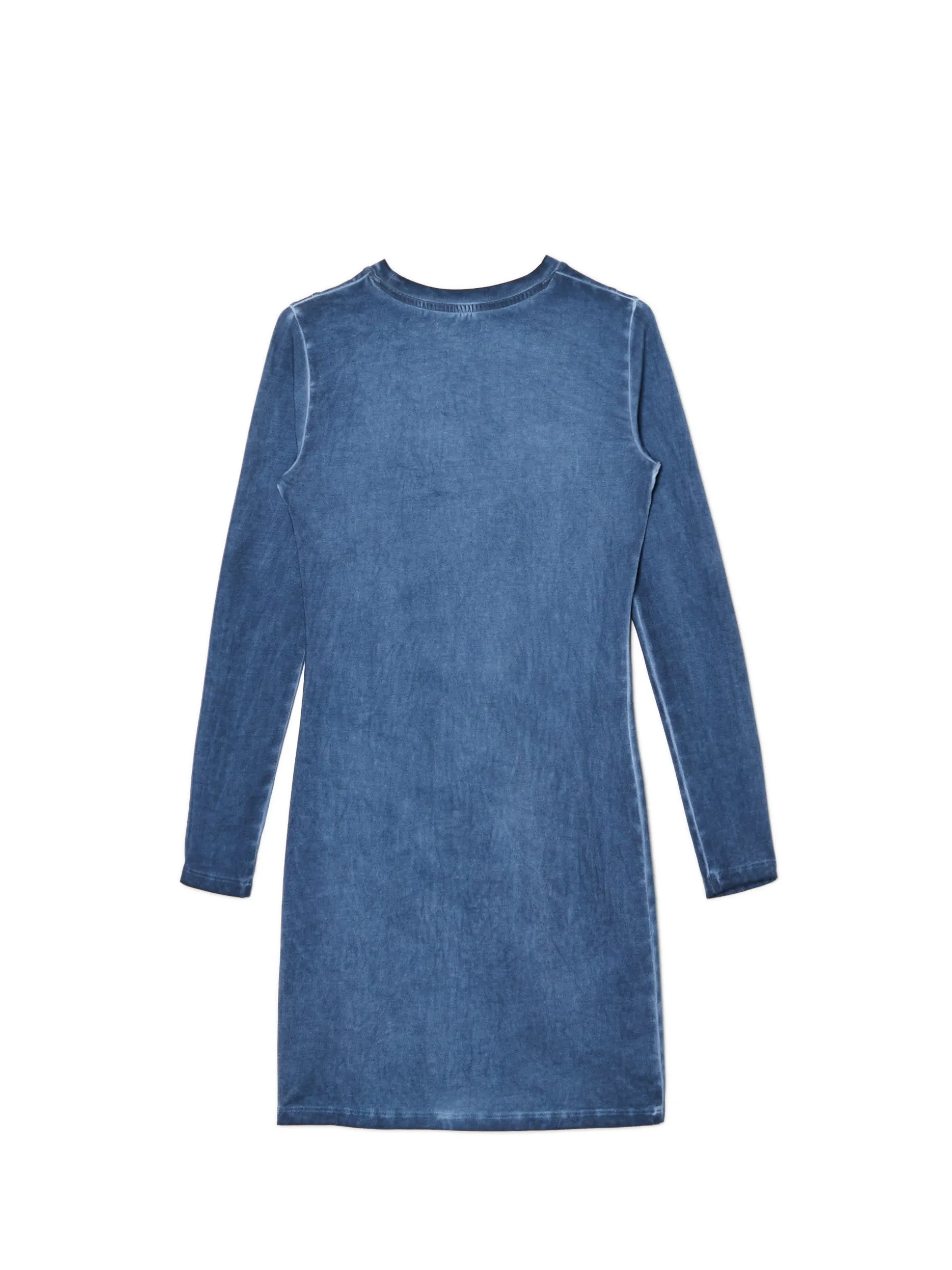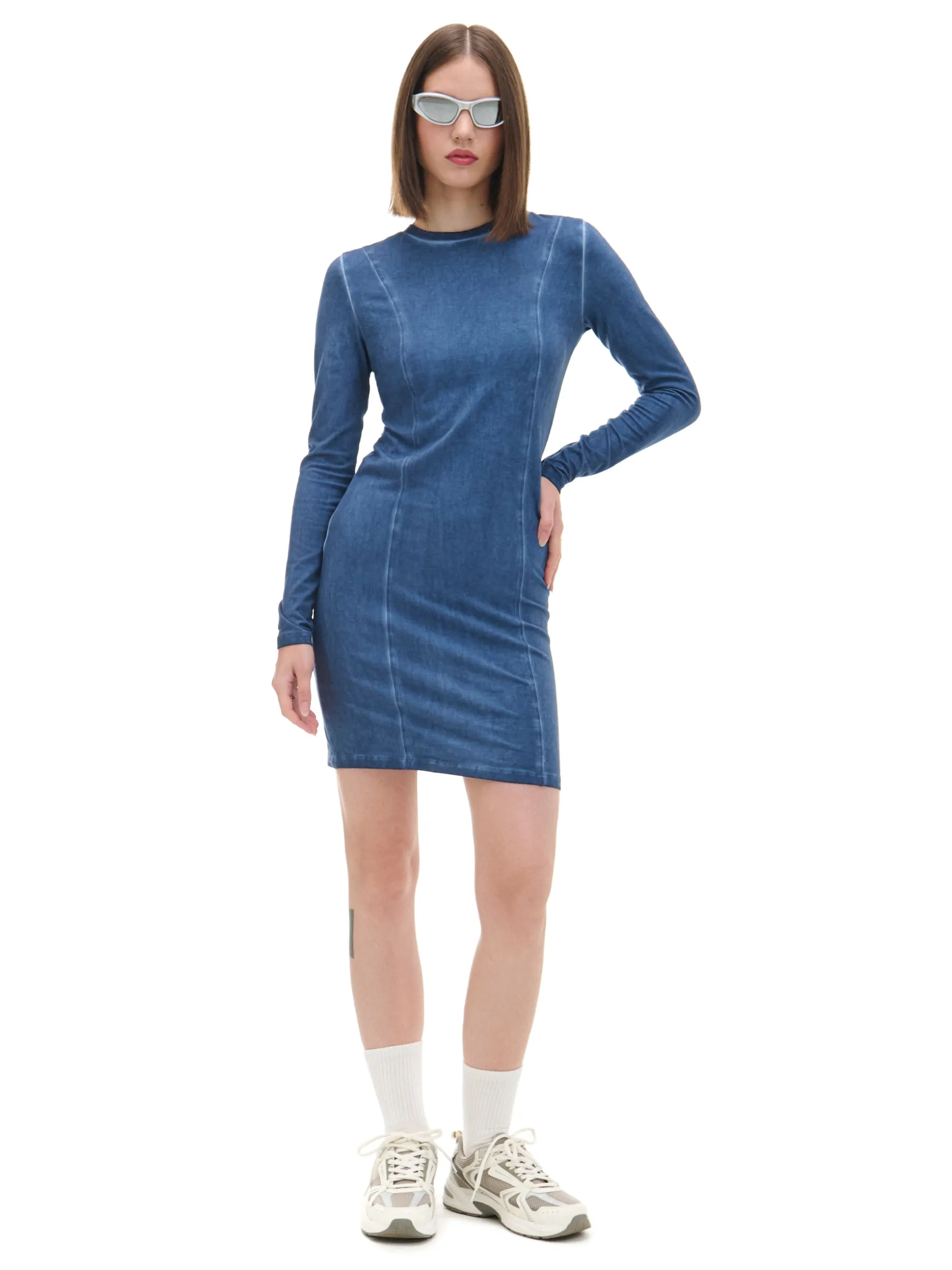 Damska sukienka uszyta z bawełny z domieszką elastycznych włókien w kolorze denimu. Ozdobą tego modelu jest efekt sprania na całości metodą oil wash. bawełna z dodatkiem elastycznych włókien dopasowany krój podkreślający sylwetkę długość mini zabudowany, okrągły dekolt z lamówką długie, dopasowane rękawy ozdobne przeszycia efekt sprania oil wash Wzrost modelki: 172 cm