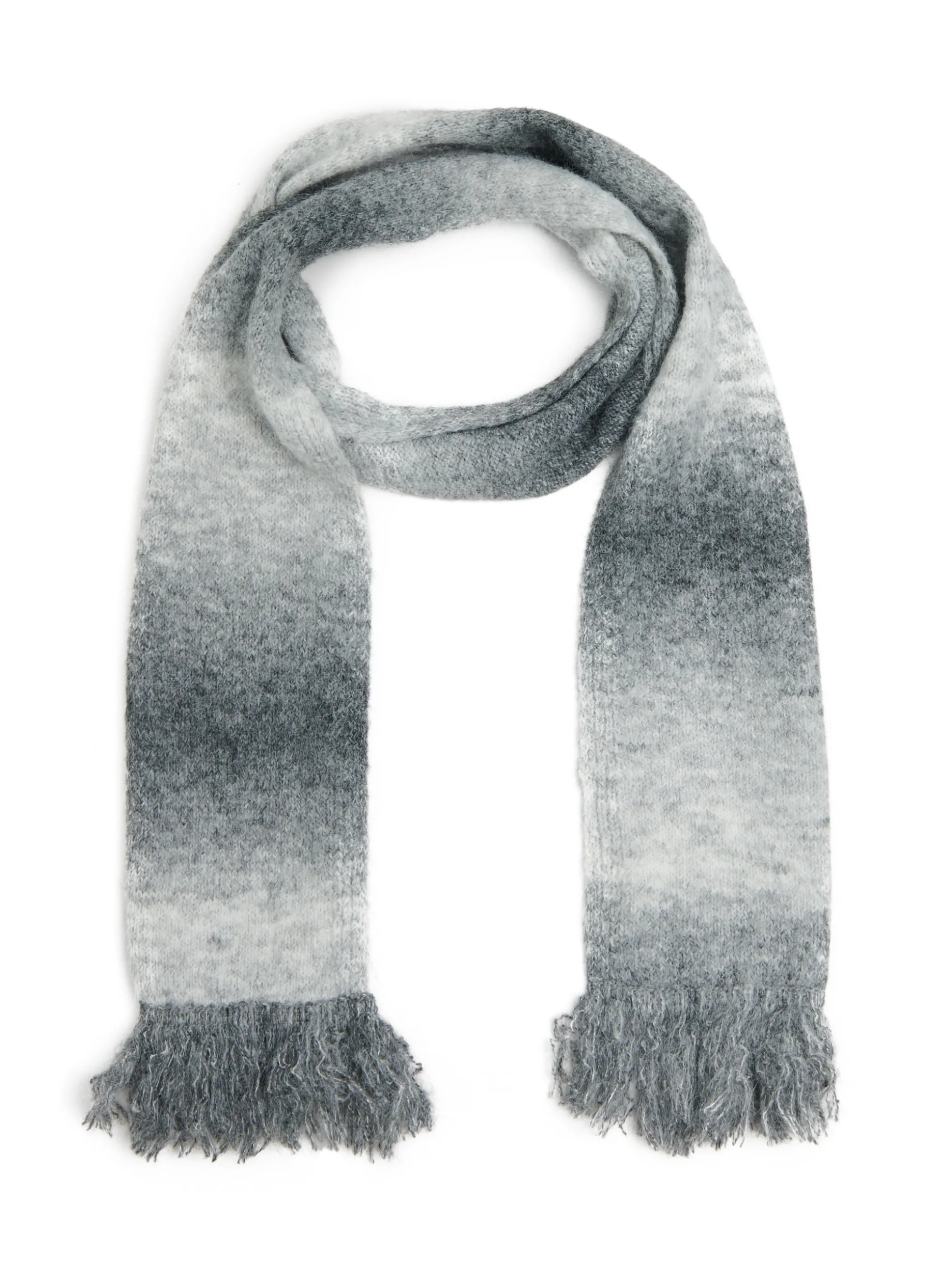 Łap damski szalik uszyty z mieszanki dzianin z dodatkiem wełny. Przyjemny w dotyku materiał i ozdobne frędzle na końcach nawiązują do klasycznego designu. Dekoracyjne cieniowanie na materiale, to znak nowoczesnego looku! uszyty z dzianiny zawierającej domieszkę wełny prosty krój długie, dekoracyjne frędzle na brzegach