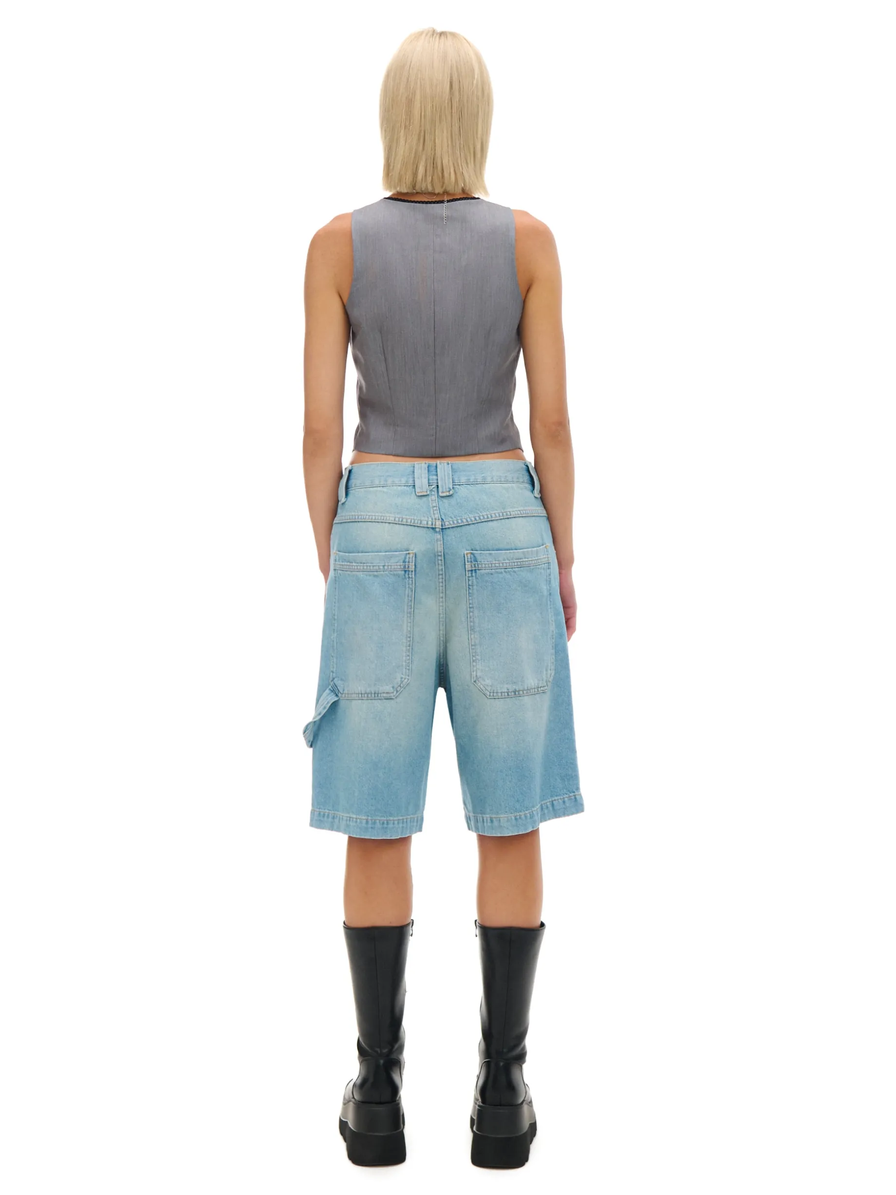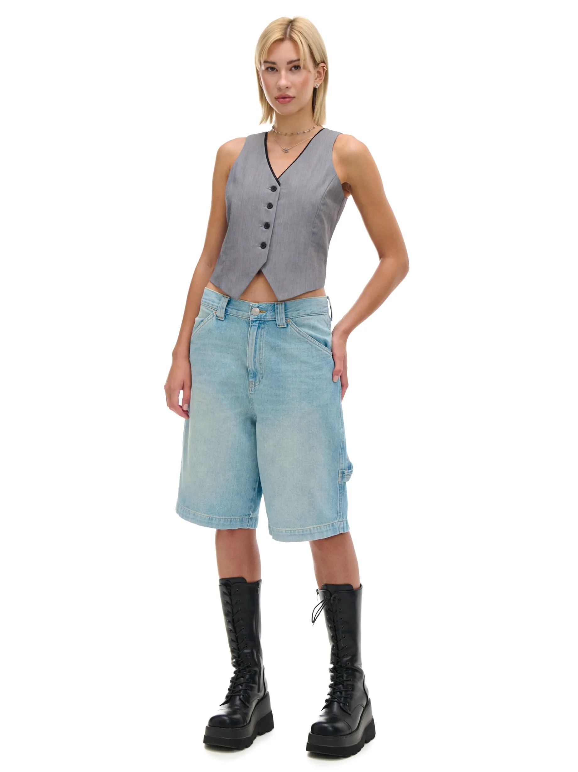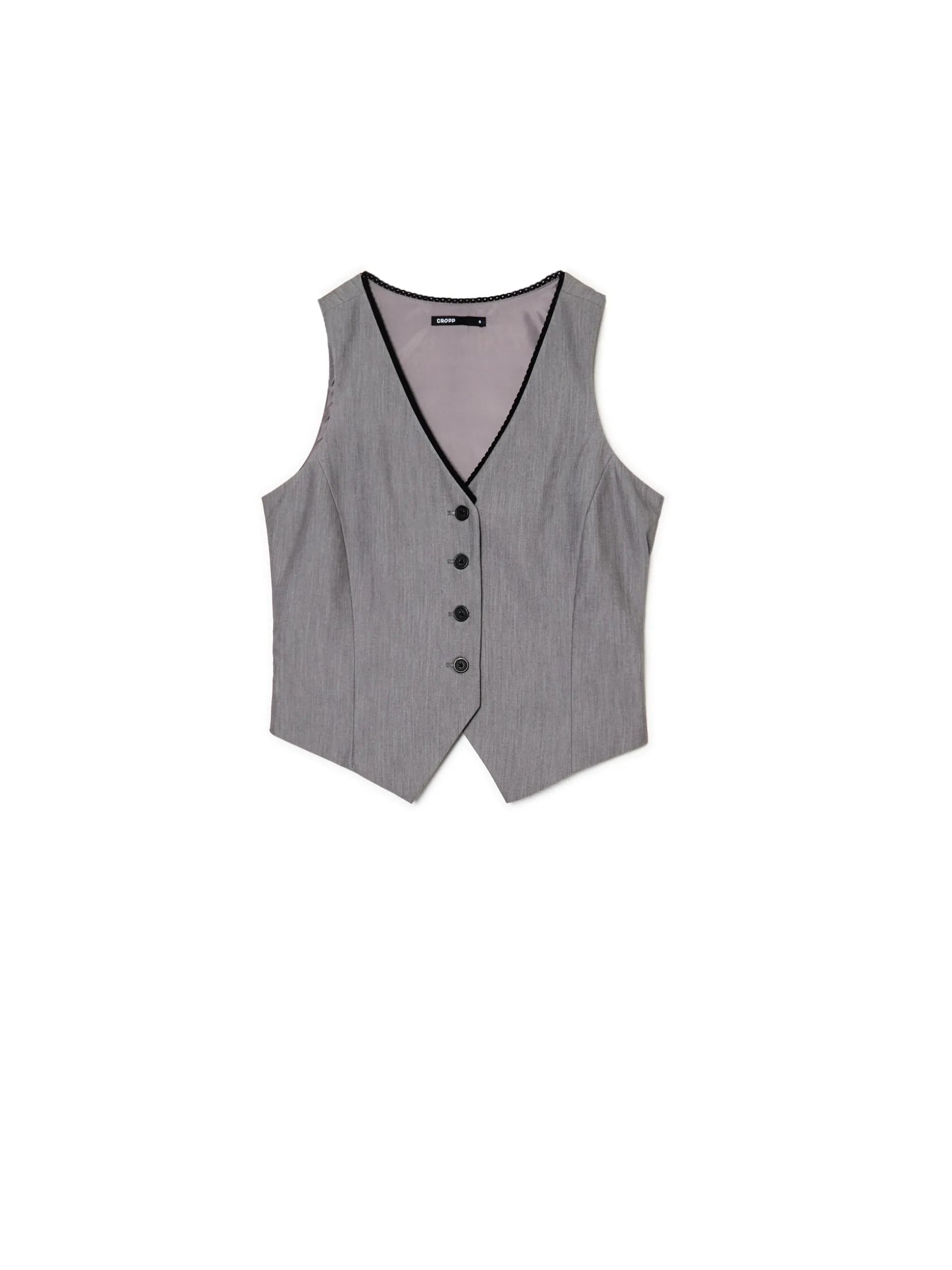 Damska szara kamizelka, uszyta z gładkiej tkaniny zawierajcej wiskozę. krótki krój zapinana na czarne guziki brzegi dekoltu z ozdobnym wykończeniem pionowe przeszycia, modelujące sylwetkę Wzrost modelki: 177 cm