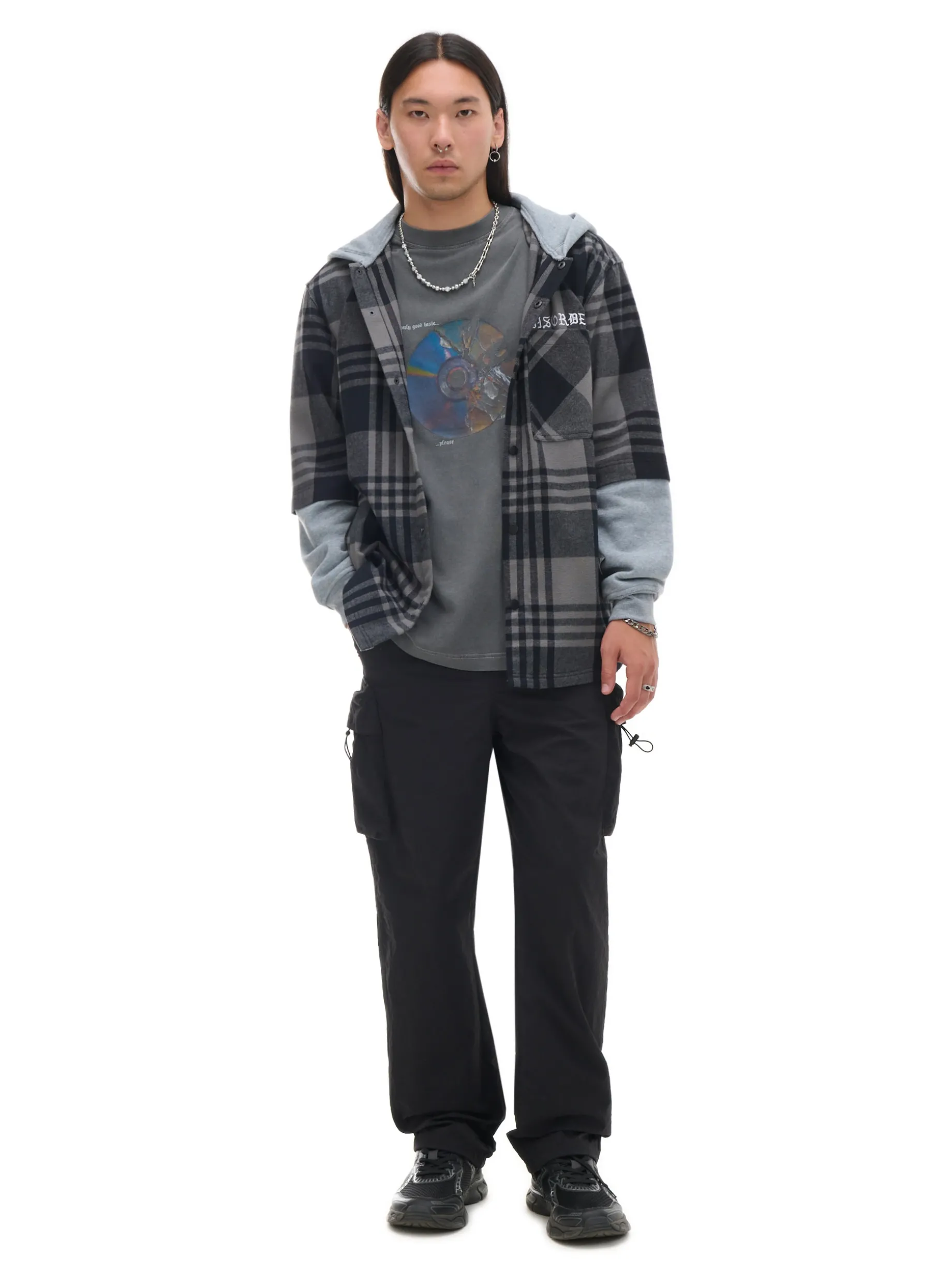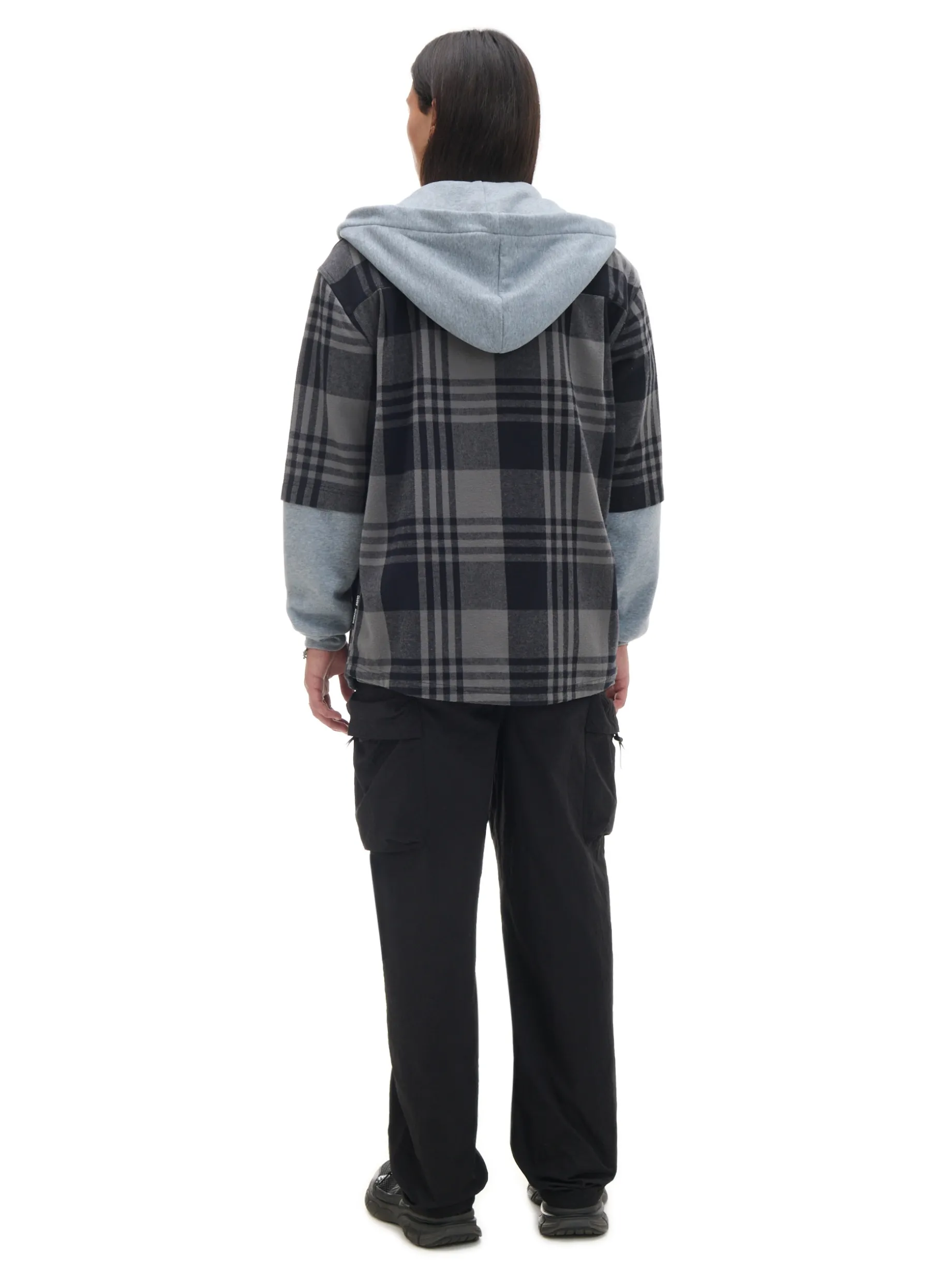 Męska koszula uszyta z grubszej tkaniny z rękawami i kapturem charakterystycznymi dla bluz typu hoodie. Look & vibe! uszyta z tkaniny z dodatkiem wiskozy swobodny, luźny krój praktyczne zapięcie na zatrzaski obszerny kaptur długie rękawy wykończone ściągaczami skośne kieszenie po bokach naszywana kieszeń na piersi ozdobne wstawki niewielki haft z przodu wzór w kratę
