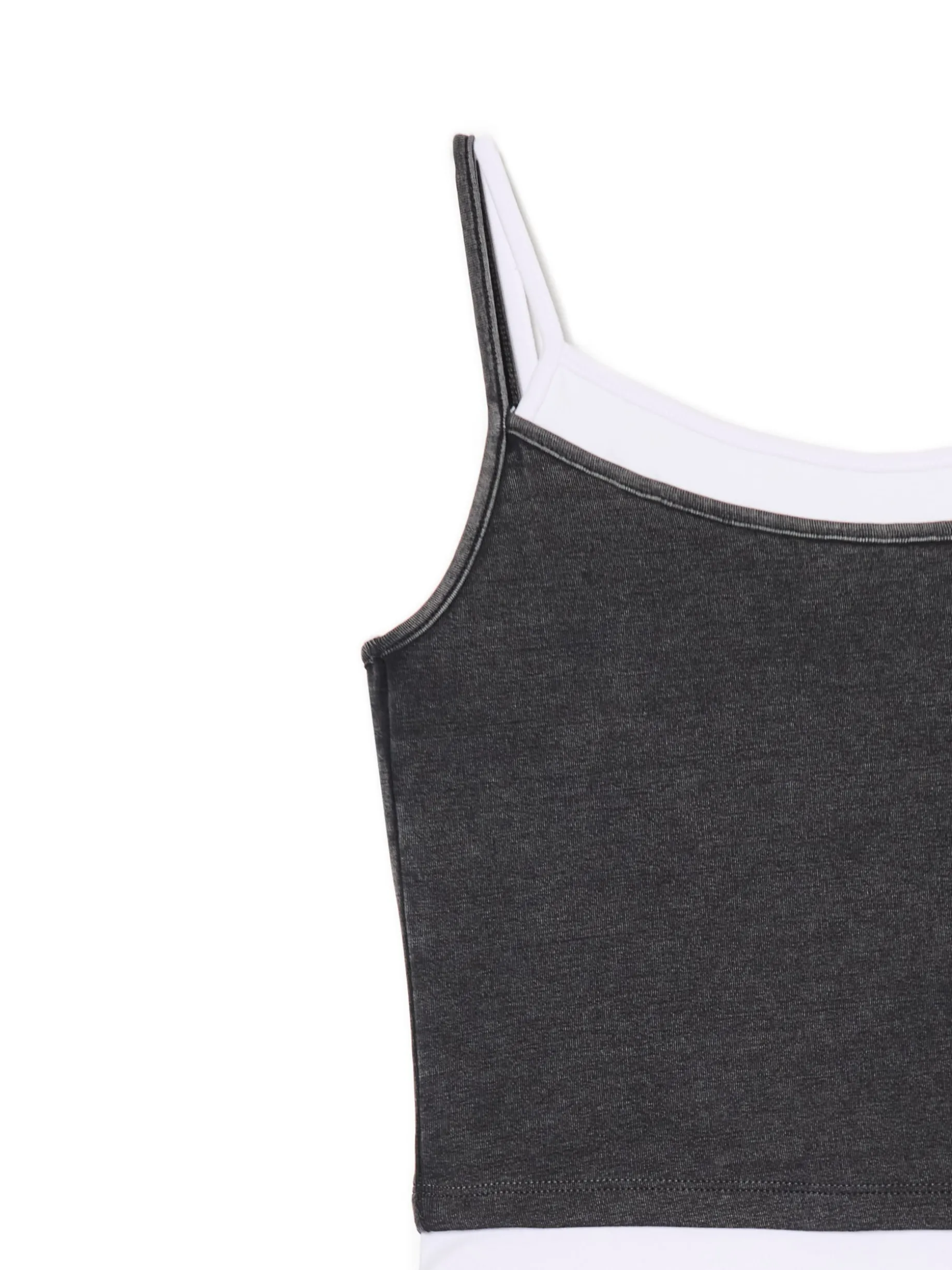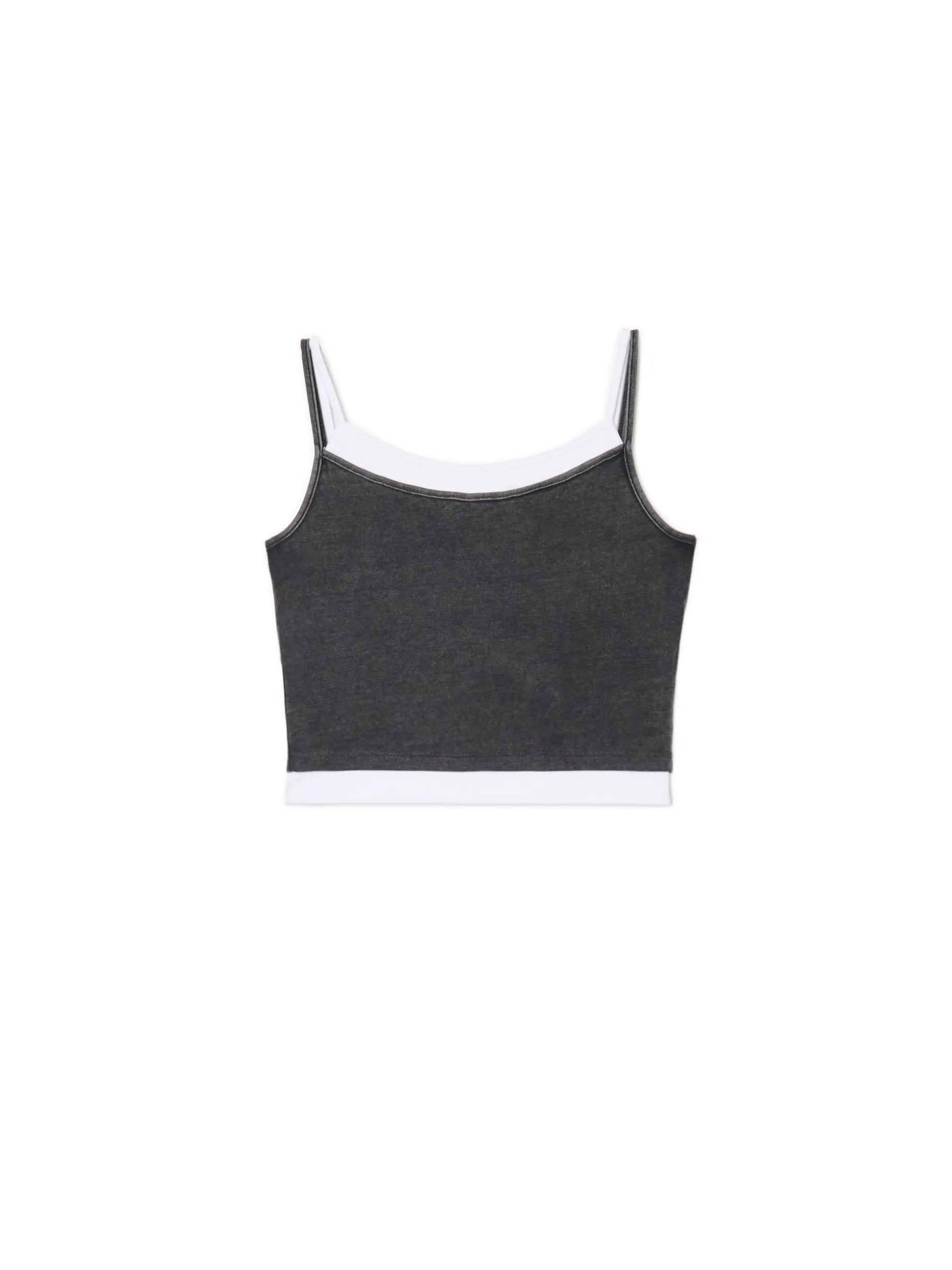 Damska koszulka na ramiączkach uszyta z elastycznej mieszanki dzianin. Dodatkowe wstawki na brzegach imitują podkoszulkę. Oryginalny casual, który fituje z bluzami i szerokimi spodniami. bawełna z dodatkiem elastycznych włókien dopasowany krój podkreślający sylwetkę cienkie ramiączka ozdobne wstawki Tworzy zestaw z modelem 591AR-90M . Wzrost modelki: 177 cm