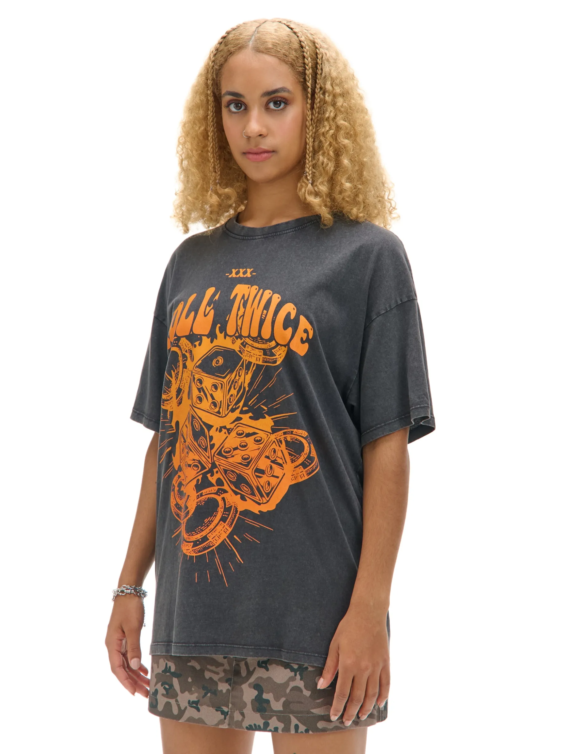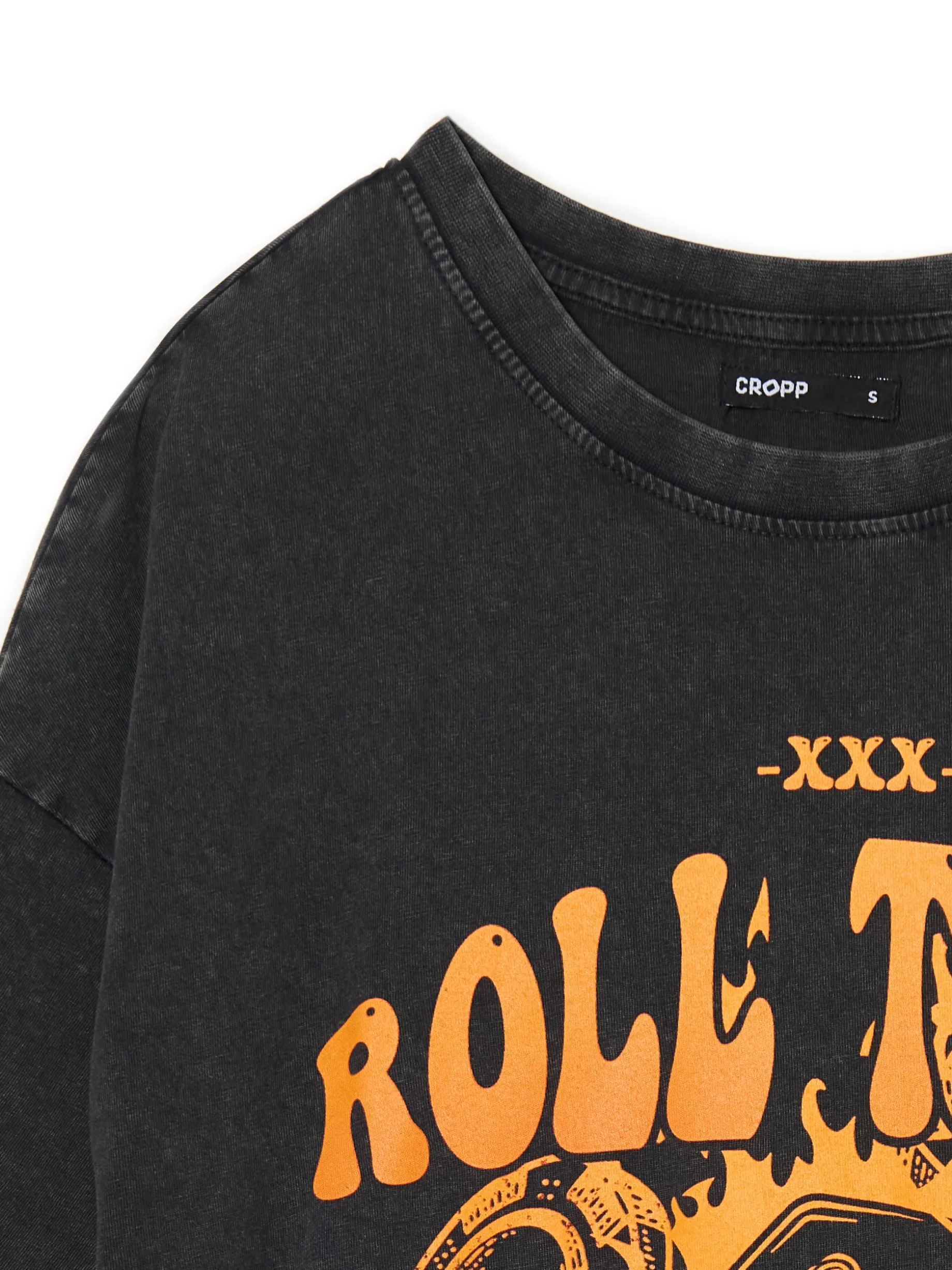 Bawełniana damska koszulka uszyta z dzianiny w kolorze szarym i efektem sprania. Na przodzie duży nadruk z motywem kości. 100% bawełny krój oversize krótkie, swobodne rękawy delikatnie obniżona linia ramion półokrągły dekolt z lamówką efekt sprania na całości duży nadruk z przodu