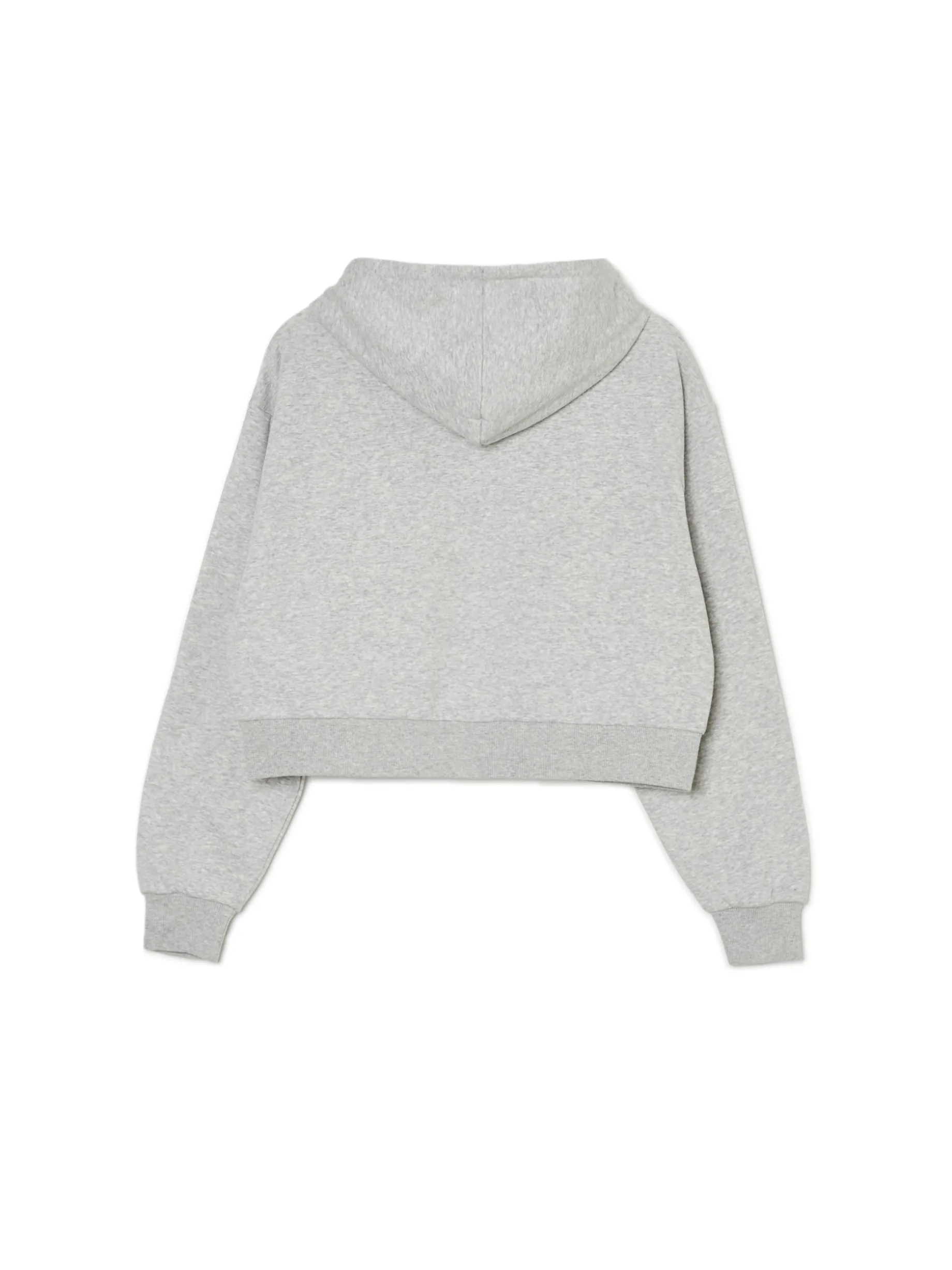 Jasnoszara, melanżowa damska bluza o krótkim kroju, uszyta z mieszanki dzianin zawierającej bawełnę. Must have na letnie wypady z ekipą! krótki krój typu crop zapięcie na zamek na całej długości szeroki kaptur z trokami dwie kieszenie z przodu dolny brzeg i rękawy wykończone ściągaczem ozdobna denimowa aplikacja w kształcie motyla