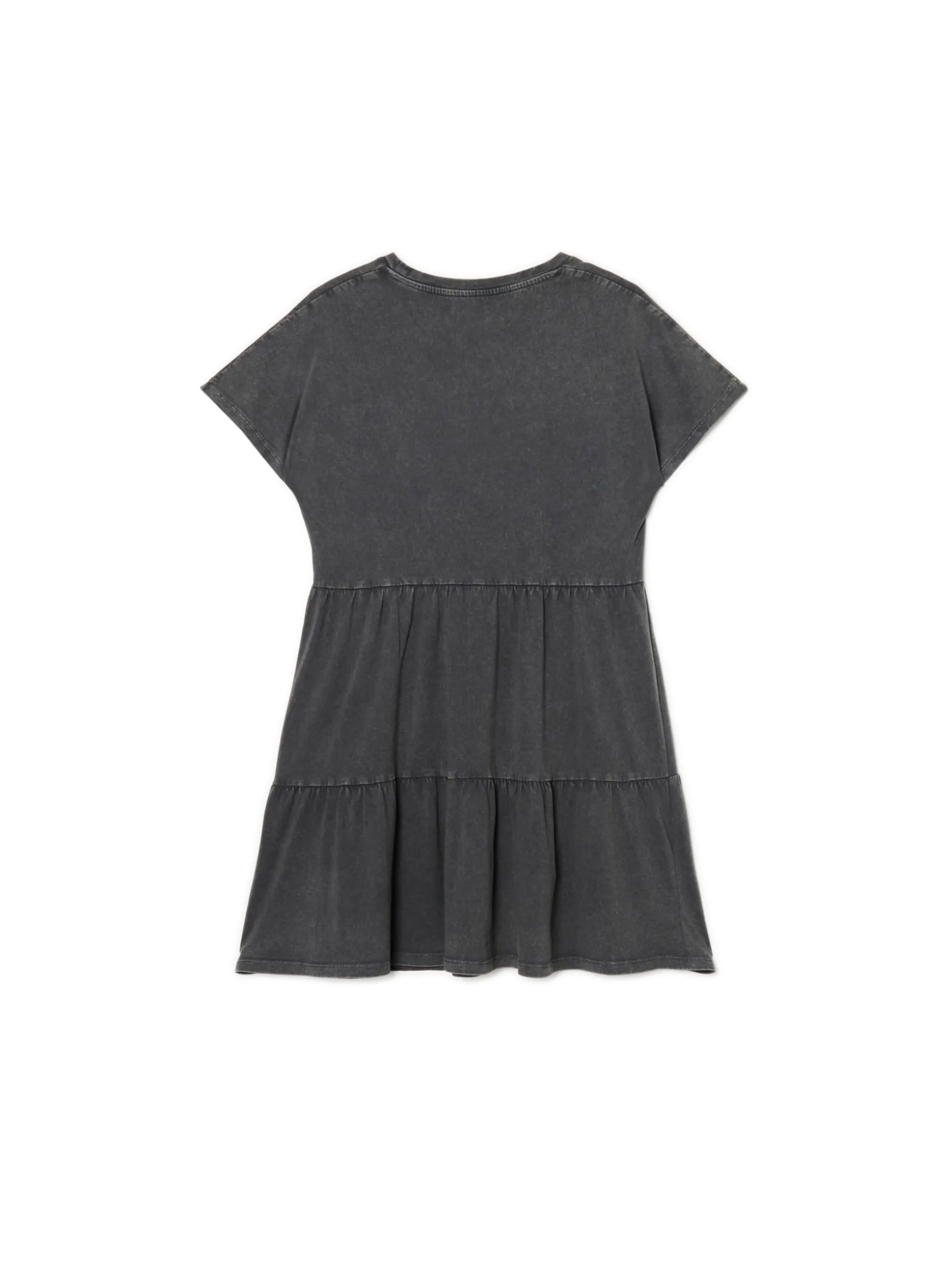 Bawełniana sukienka mini w szarym odcieniu z ozdobnymi falbanami i marszczeniami. Fituje z każdym rodzajem obuwia! 100% bawełny długość mini proste, krótkie rękawy efekt sprania na całości ozdobne falbany i marszczenia