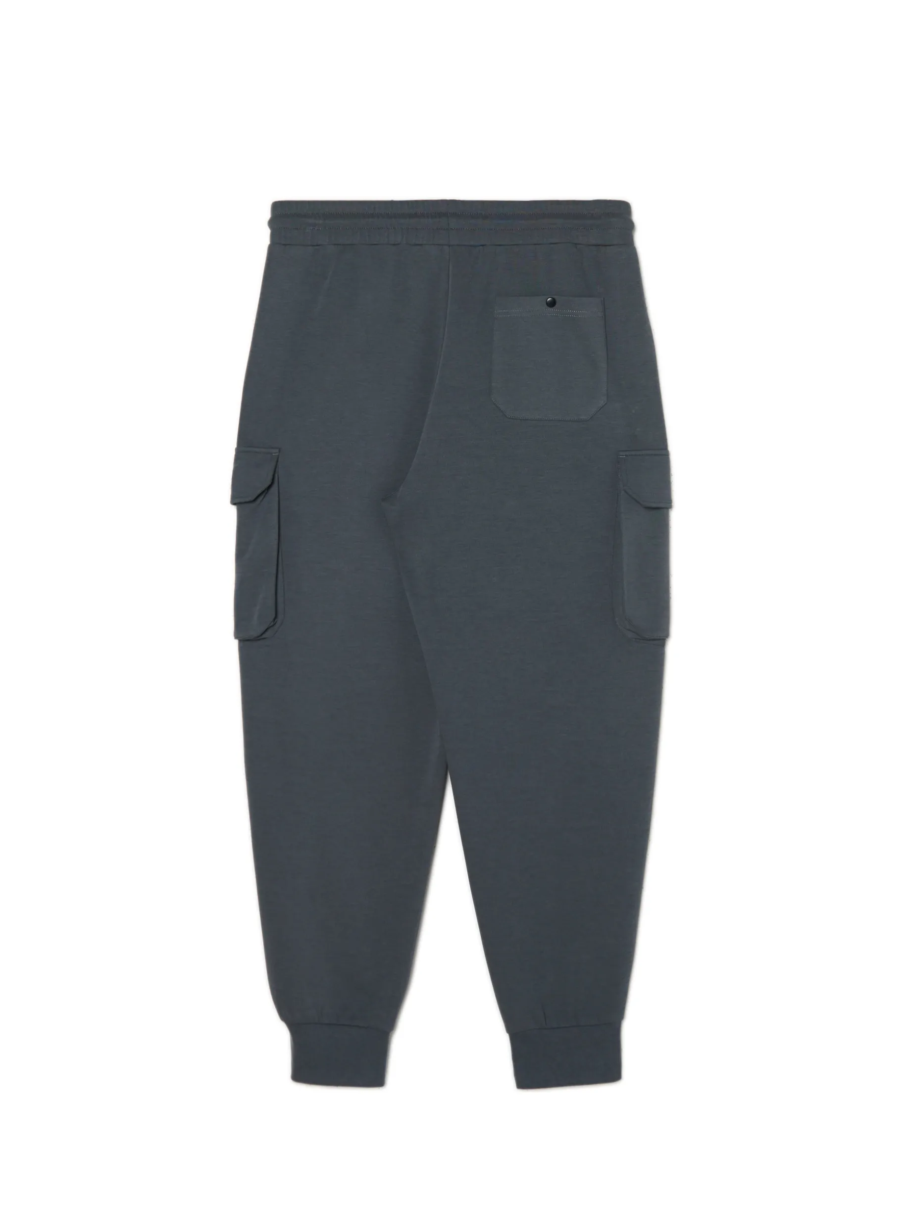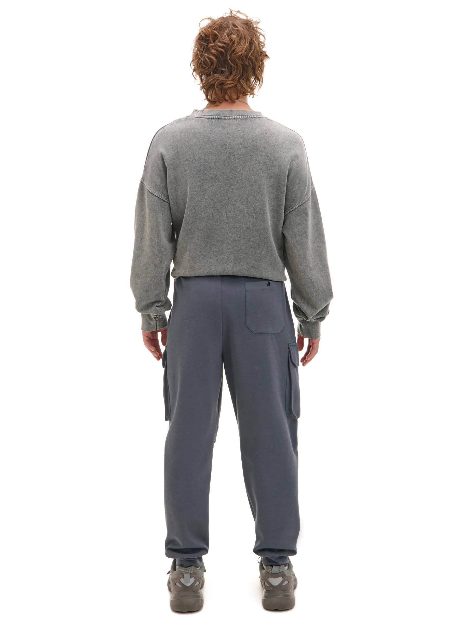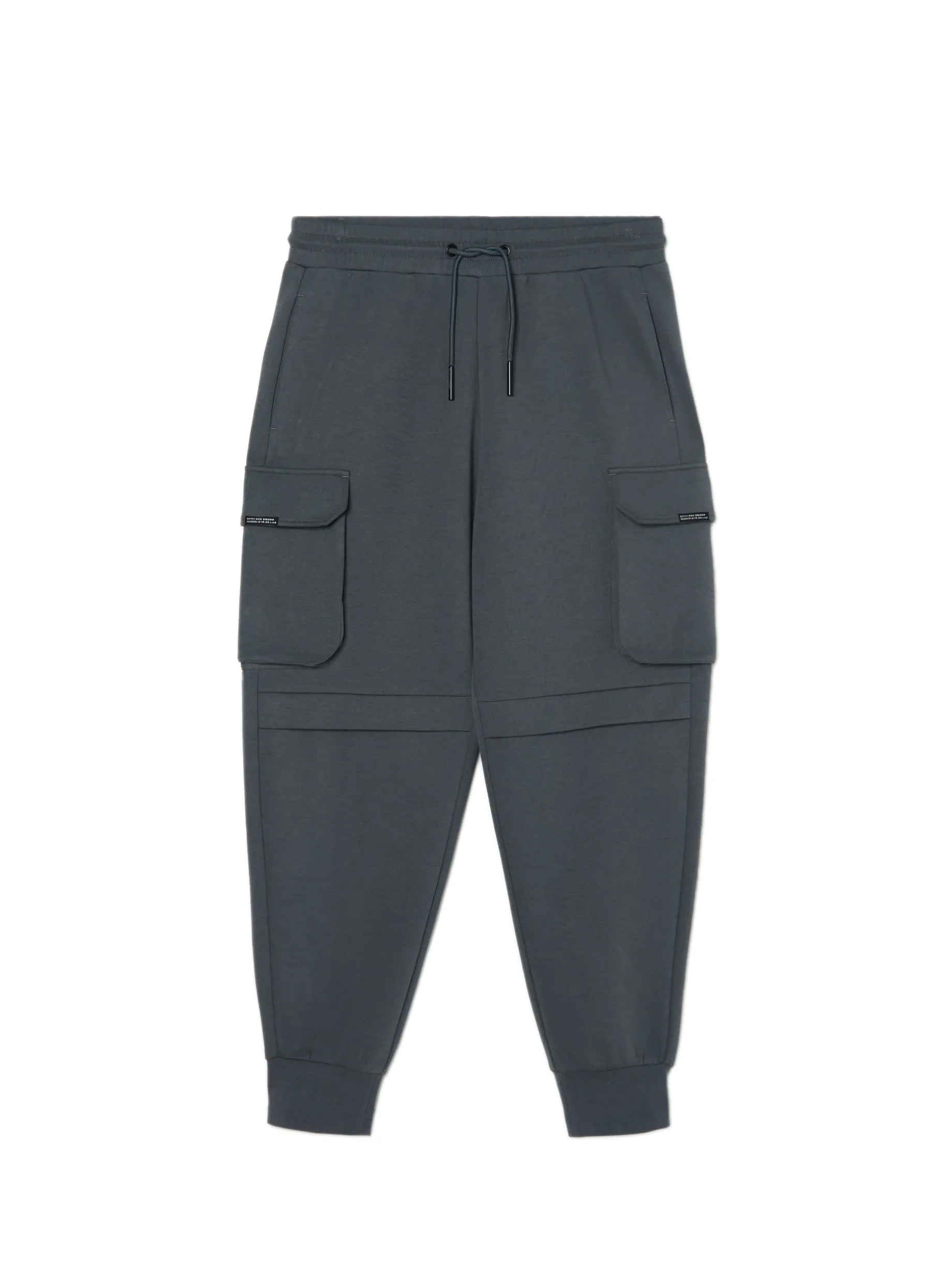 Szare męskie dresy uszyte z dżersejowej dzianiny zawierającej bawełnę. Regularny stan, komfortowe zapięcie i co najważniejsze duża ilość kieszeni to must have tej jesieni. dzianina z dodatkiem elastycznych włókien regularny stan guma w pasie ze sznurkiem do regulacji długie nogawki wykończone ściągaczem 7 kieszeni, w tym jedna z zapięciem na zatrzask otwarte kieszenie po bokach 4 kieszenie z patkami na nogawkach efekt sprania na całości ozdobne wstawki na nogawkach naszywki na kieszeniach