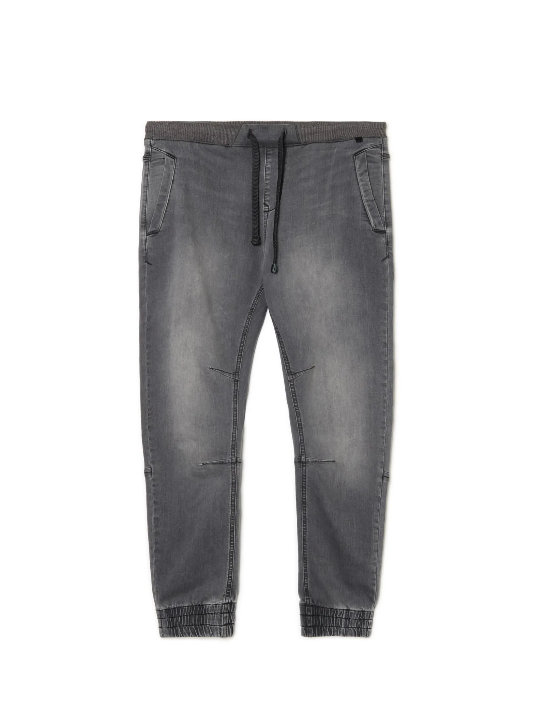 Męskie szare spodnie jeansowe typu jogger chino, uszyte z dzianiny zawierającej bawełnę. sportowy krój regularny stan, w pasie elastyczna gumka i sznurek do regulacji nogawka zakończona ściągaczem z wszytą elastyczną gumką cztery kieszenie efekt sprania materiału