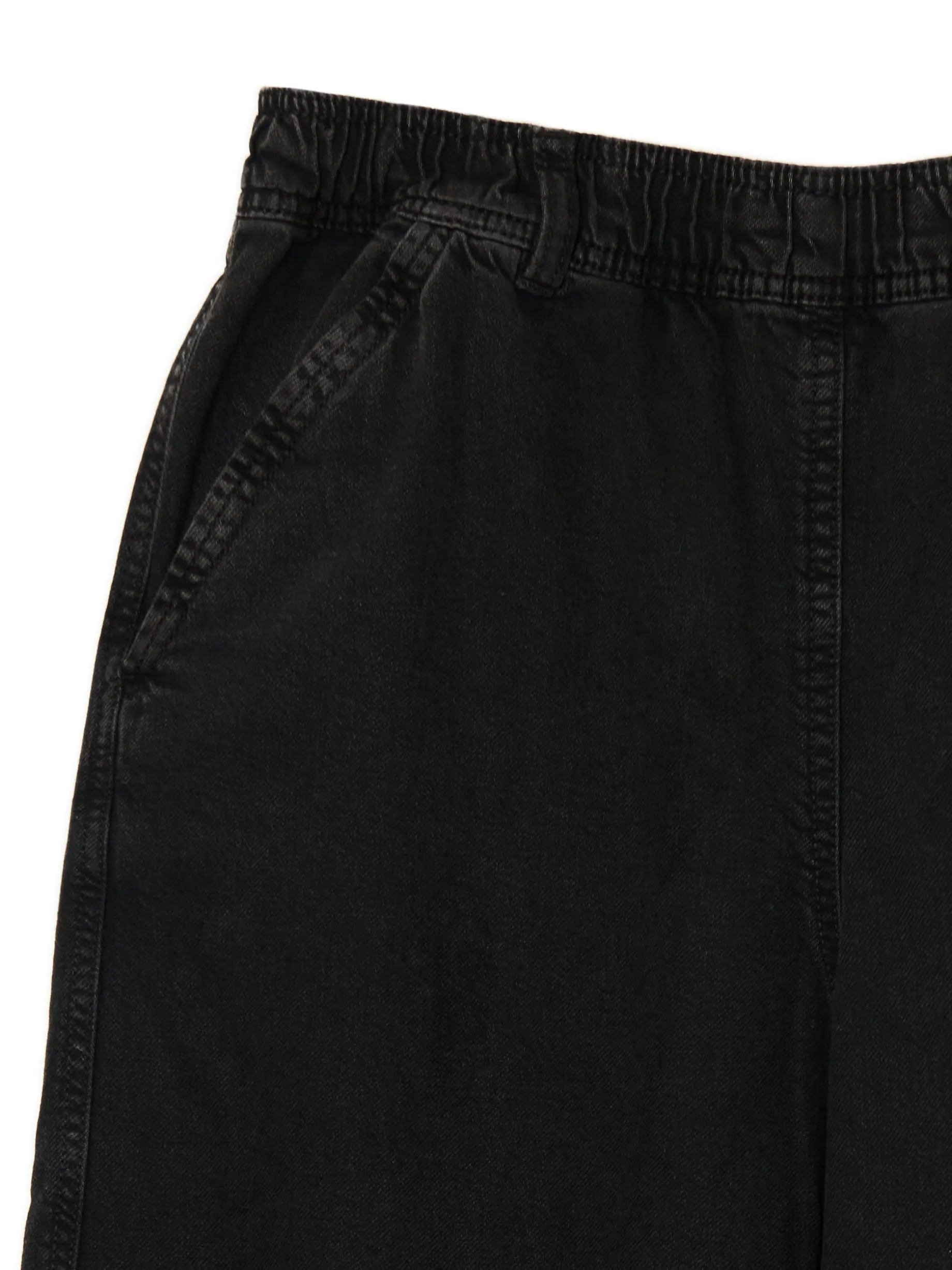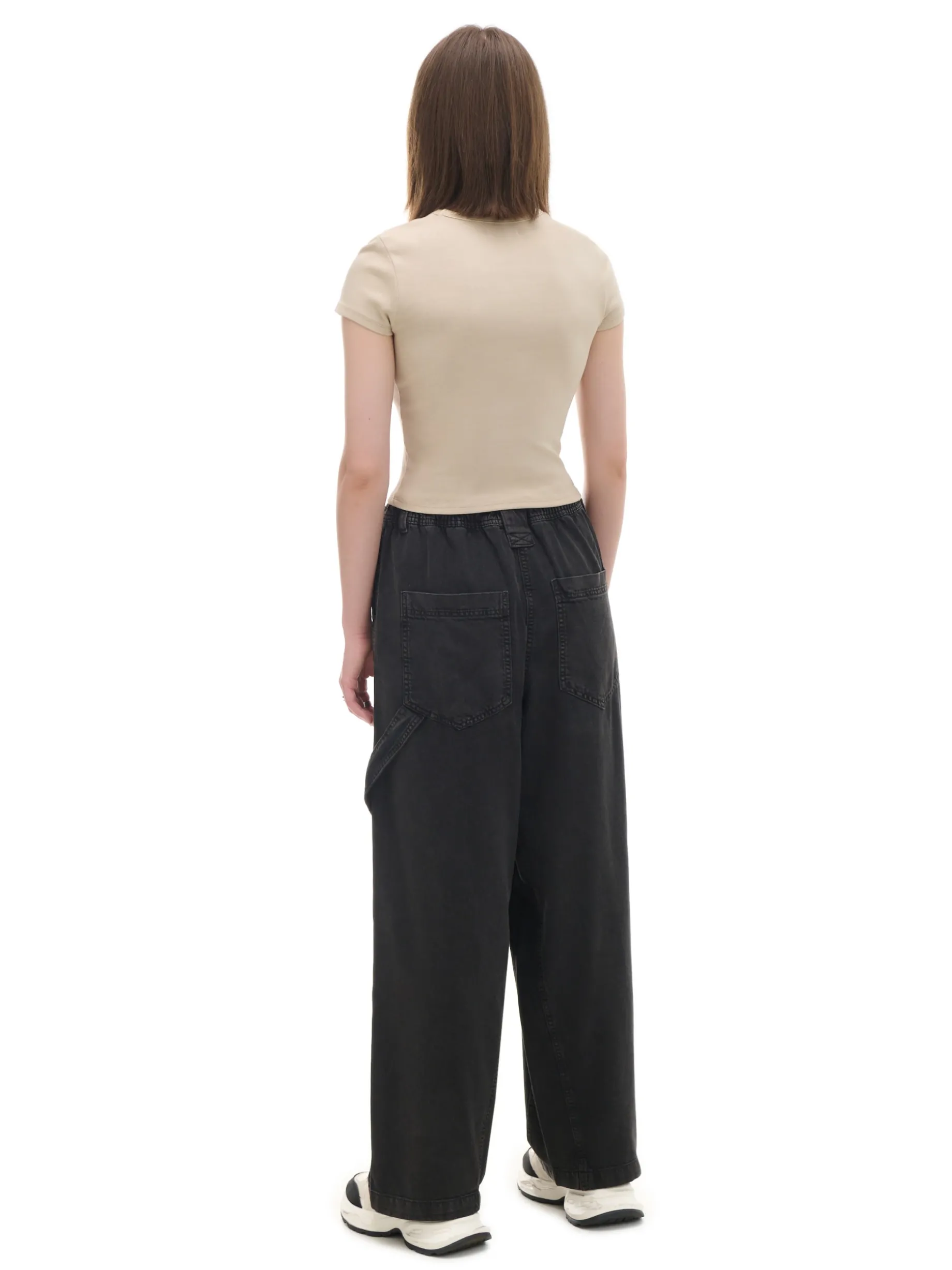 Damskie szare spodnie, uszyte z bawełnianego, wytrzymałego diagonalu. luźny krój baggy bardzo szeroka nogawka wysoki stan, w pasie elastyczna gumka cztery kieszenie ukośne przeszycia na wysokości kolan dodatkowy pasek typu carpenter szerokie szlufki na pasek delikatny efekt sprania materiału Wzrost modelki: 172 cm