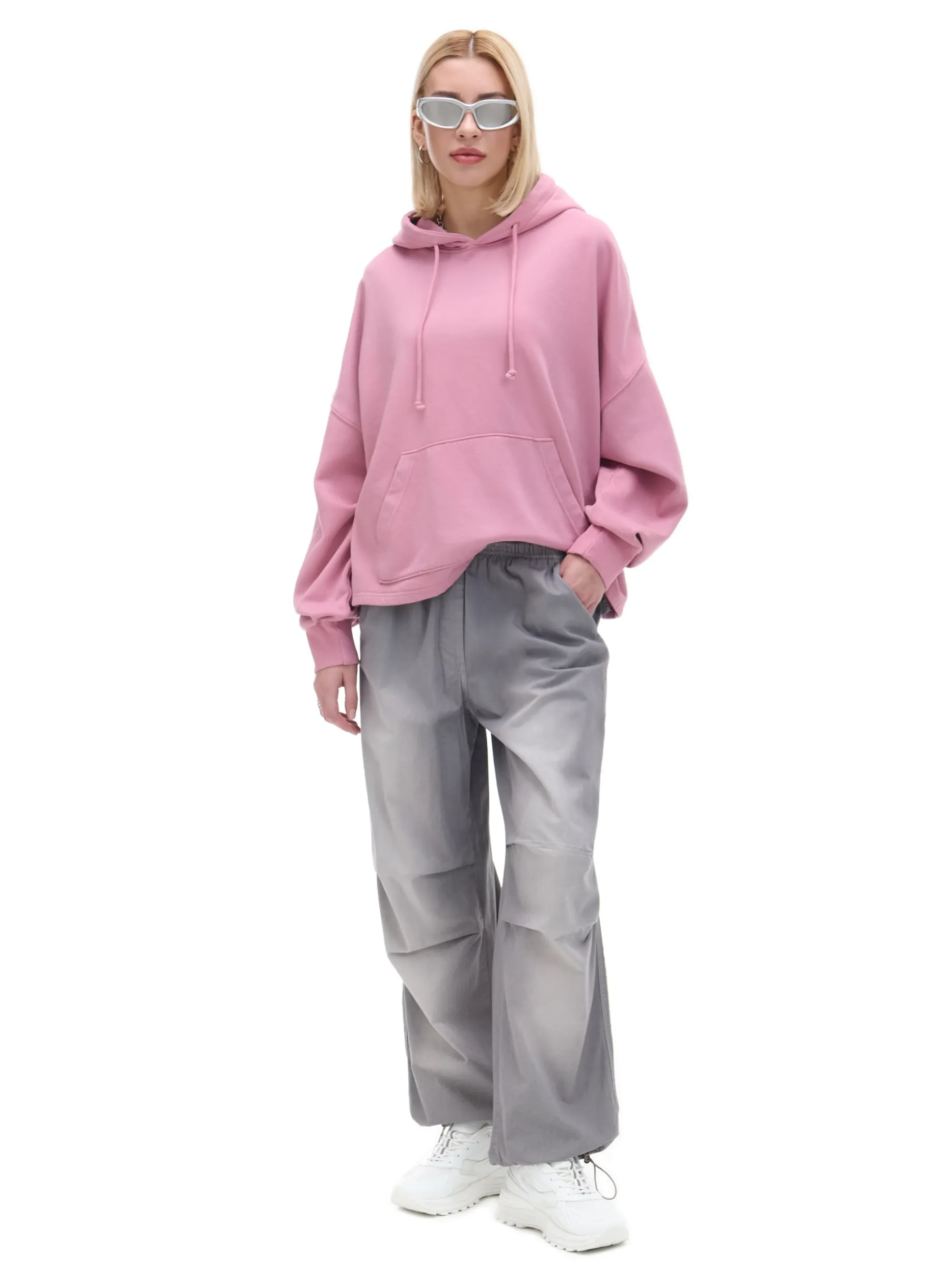Spodnie damskie w stylu parachute, nazywane też spadochronowymi. Uszyte z bawełnianej tkaniny. luźny fason w pasie elastyczna gumka ze stoperami do regulacji 4 kieszenie swobodne nogawki z regulacją u dołu dostępne inne warianty kolorystyczne Wzrost modelki: 177 cm