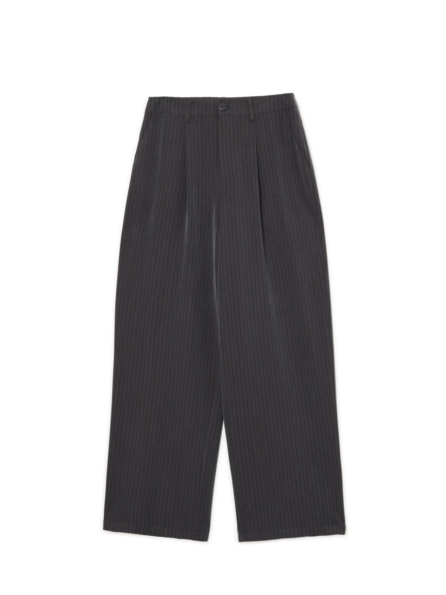 Damskie spodnie uszyte z trwałego materiału z dodatkiem wiskozy. Ten klasyczny model jest idealnym dodatkiem do mniej lub bardziej eleganckich stylizacji. wyjątkowo mocny, a jednocześnie wygodny materiał swobodny, luźny krój zapięcie na zamek i guzik długie, szerokie nogawki skośne kieszenie z przodu dwie naszyte kieszenie tylnie szlufki na pasek modelujące zakładki z przodu wzór w paski na całości