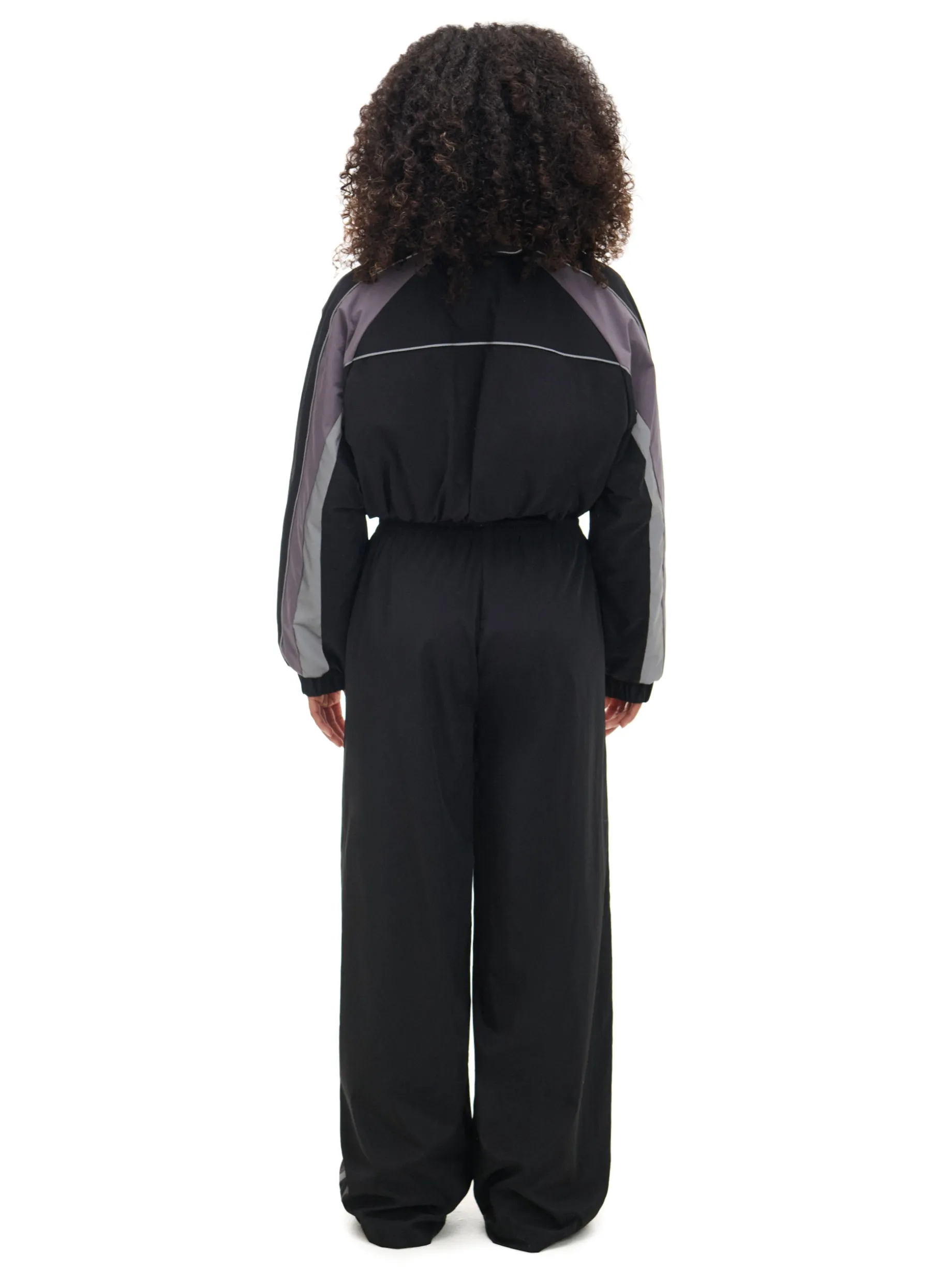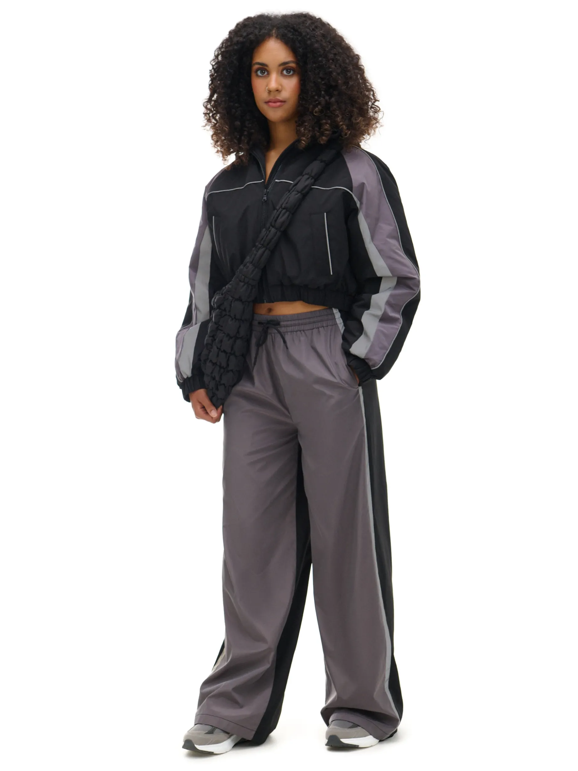 Damskie spodnie o kroju wide leg, wykonane z lekkiej i miłej w dotyku nylonowej tkaniny. Materiał odporny na gniecenia, wytrzymały i szybkoschnący. Idealny item do szkoły, na studia, czy pracy. regularny stan guma w pasie ze sznurkiem do regulacji długie, szerokie nogawki ozdobne biało-czarne lampasy Tworzy zestaw z modelem 177AR-99X .