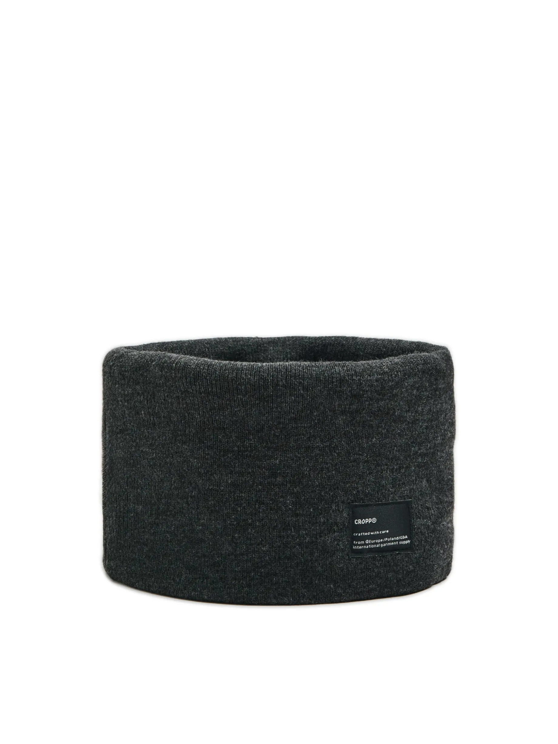 Wygodny męski komin typu basic, uszyty z dzianiny w kolorze szarym z brandową naszywką.