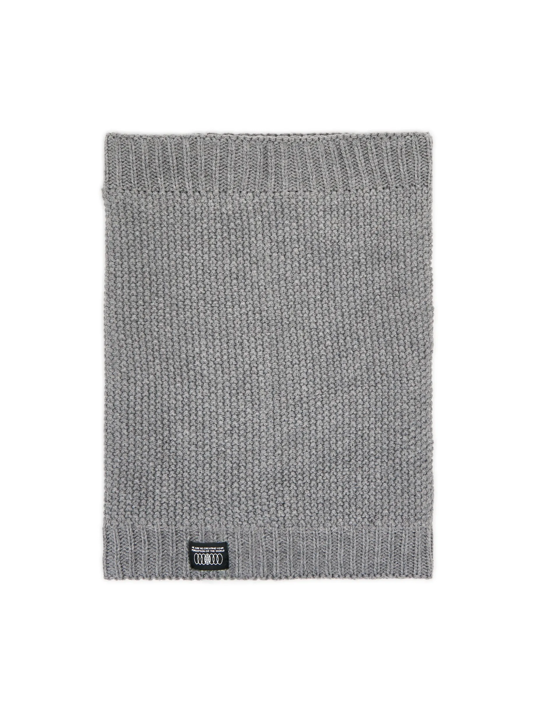 Szary męski szalik typu komin, uszyty z grubej, mięsistej dzianiny o ciekawym splocie. U dołu ozdobiony niewielką metką z napisami. Praktyczne must-have na zimne miesiące!