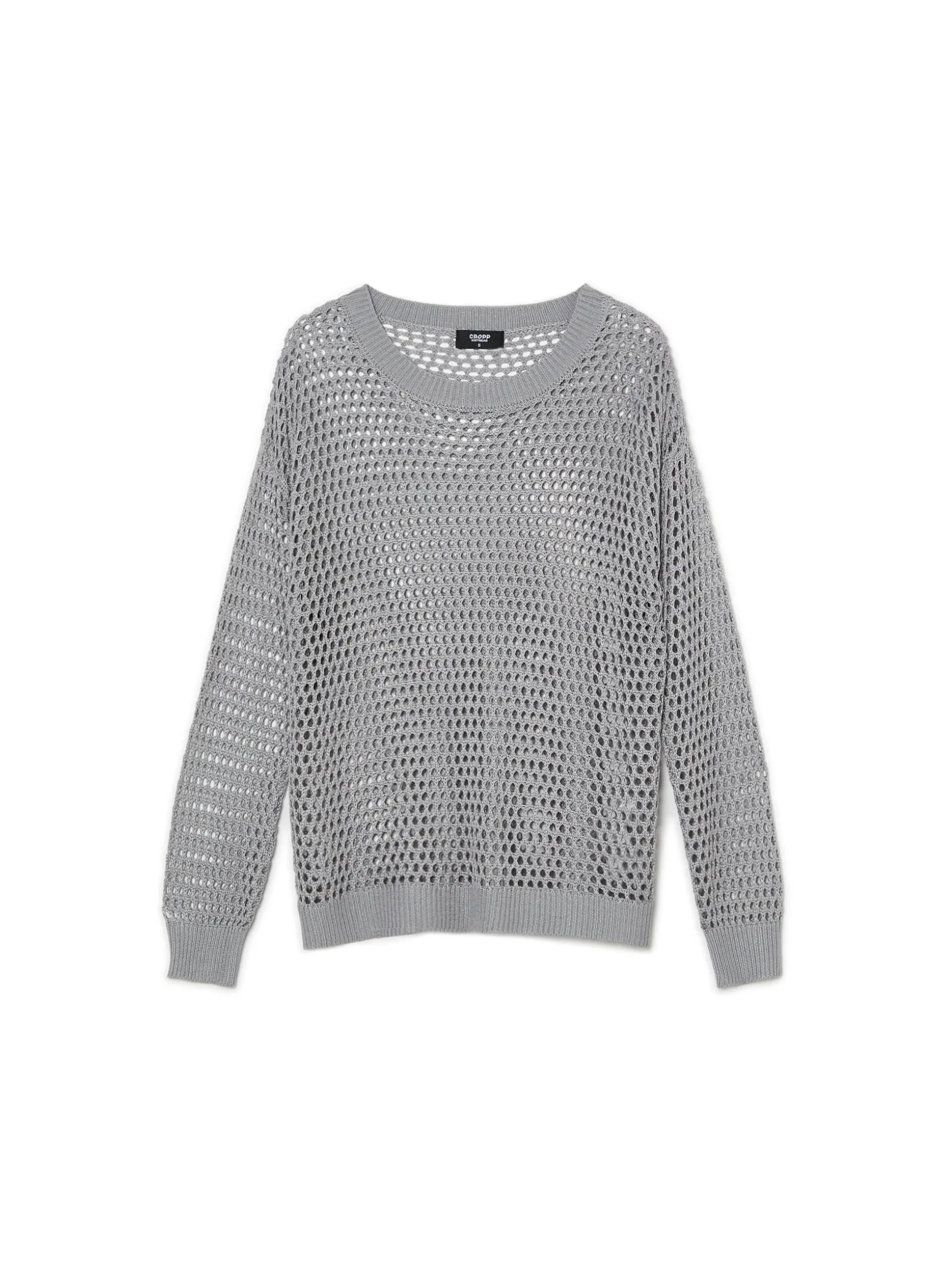 Damski szary sweter, uszyty z wiskozowej dzianiny. regularny krój długie rękawy splot o dużych oczkach Wzrost modelki: 177 cm
