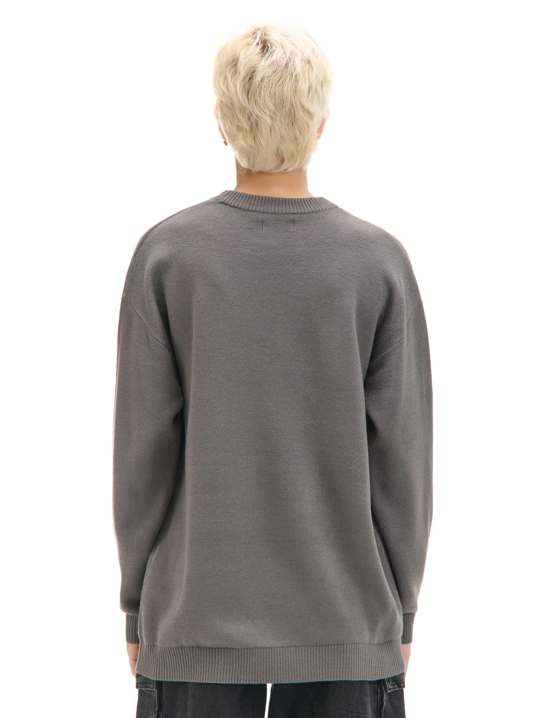 Damski sweter o kroju oversize uszyty z dzianiny w szarym kolorze. Na przodzie artystyczny nadruk z motywem twarzy. Ten item jest przyjemny w dotyku, więc otuli Cię w chłodne wieczory! uszyty z dzianiny o drobnym splocie krój oversize okrągły dekolt z lamówką dół i rękawy wykończone prążkowanym ściągaczem delikatny efekt sprania oryginalny print