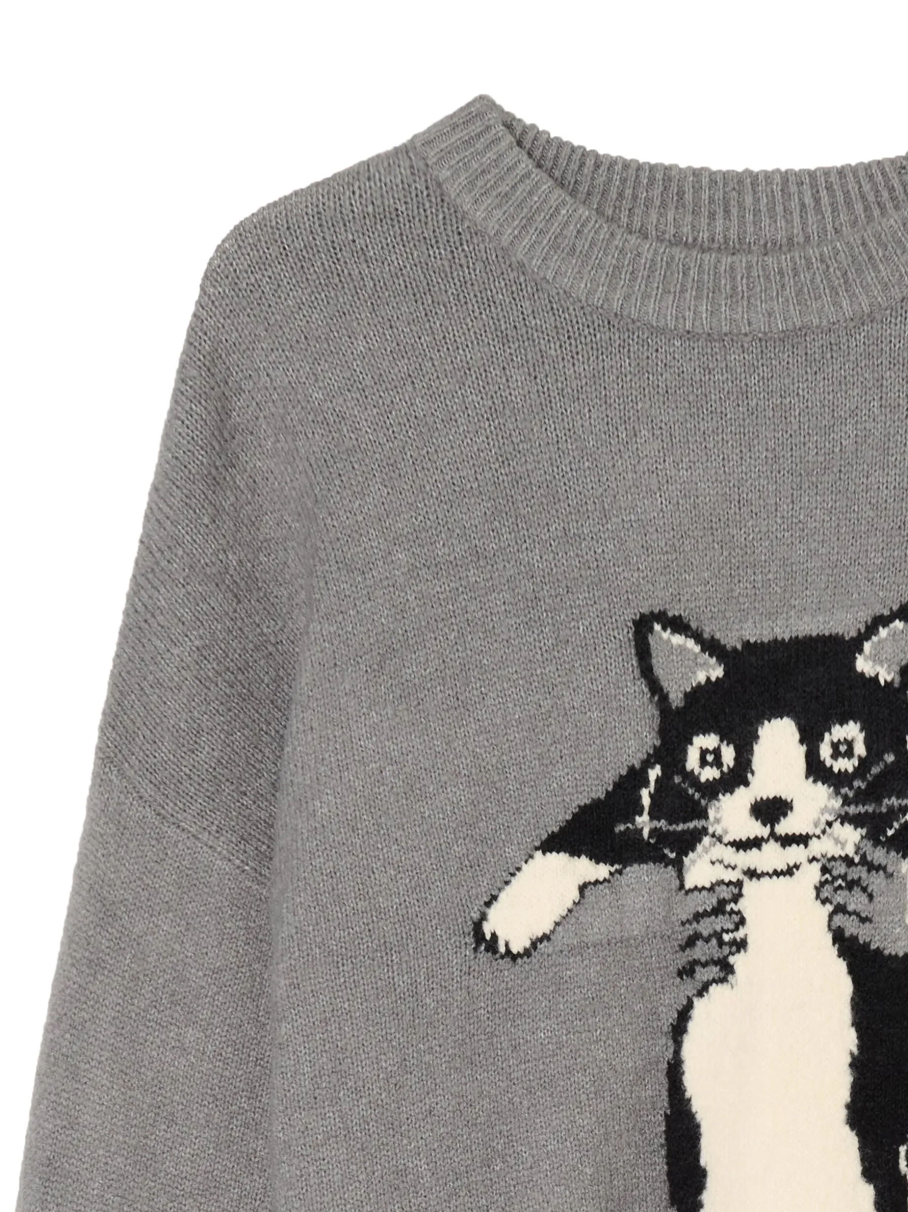 Kocyk, herbatka i ciepły sweter to idealny mix na jesień! Damski item uszyty z przyjemnej w dotyku dzianiny w szarym kolorze matchuje z tą wizją. Łap kotka i do koszyka! dzianina z domieszką elastycznych włókien regularny krój okrągły dekolt z lamówką długie rękawy z obniżoną linią ramion dół i rękawy wykończone prążkowanym ściągaczem z przodu grafika z kotem