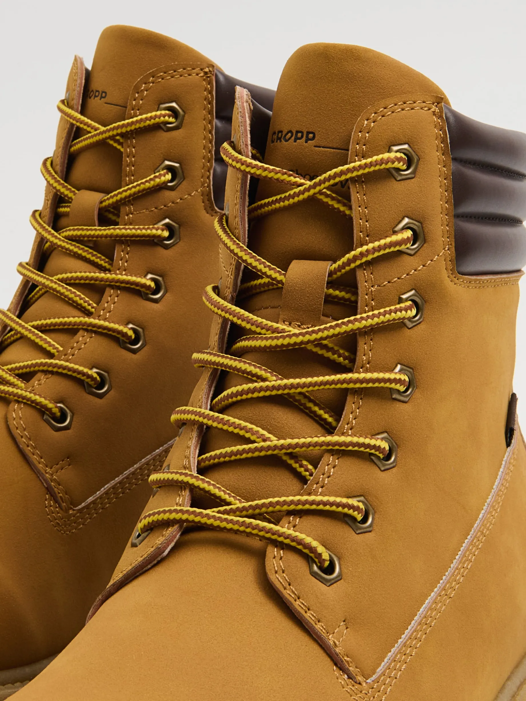 Winter is coming! Męskie buty trekkingowe typu worker wykonane ze sztucznej nubukowej skóry. Do tego kolorowe sznurówki, miękka wkładka i dekoracyjne przeszycia. Wejdź w zimowy vibe z naszymi butami! botki za kostkę cholewka z imitacji skóry lekkie gąbkowanie wokół kostki wiązane na sznurówki metalowe przelotki zapobiegające uszkodzeniu materiału traperowa podeszwa wykonana z gumy termoplastycznej naszywka Cropp