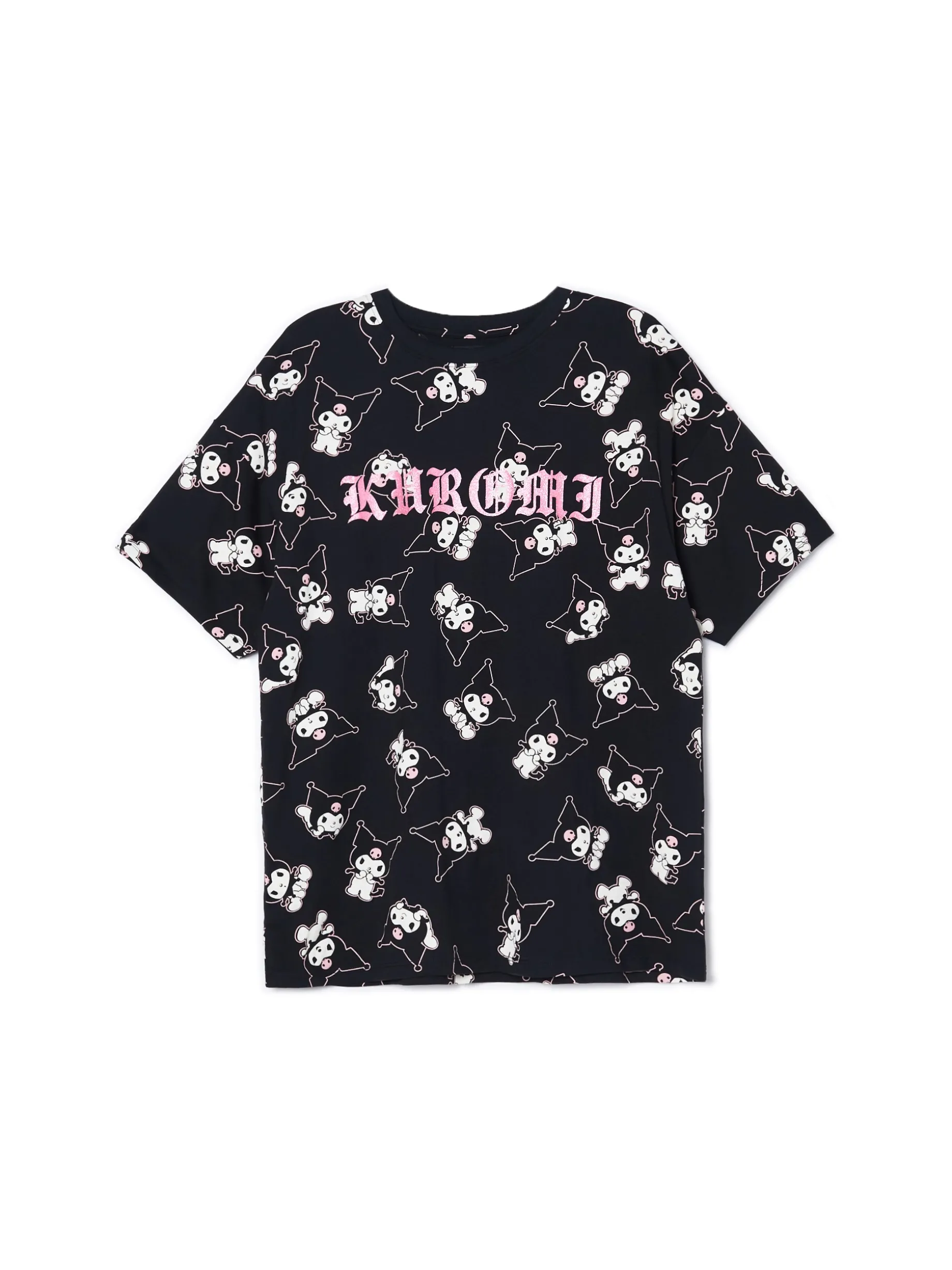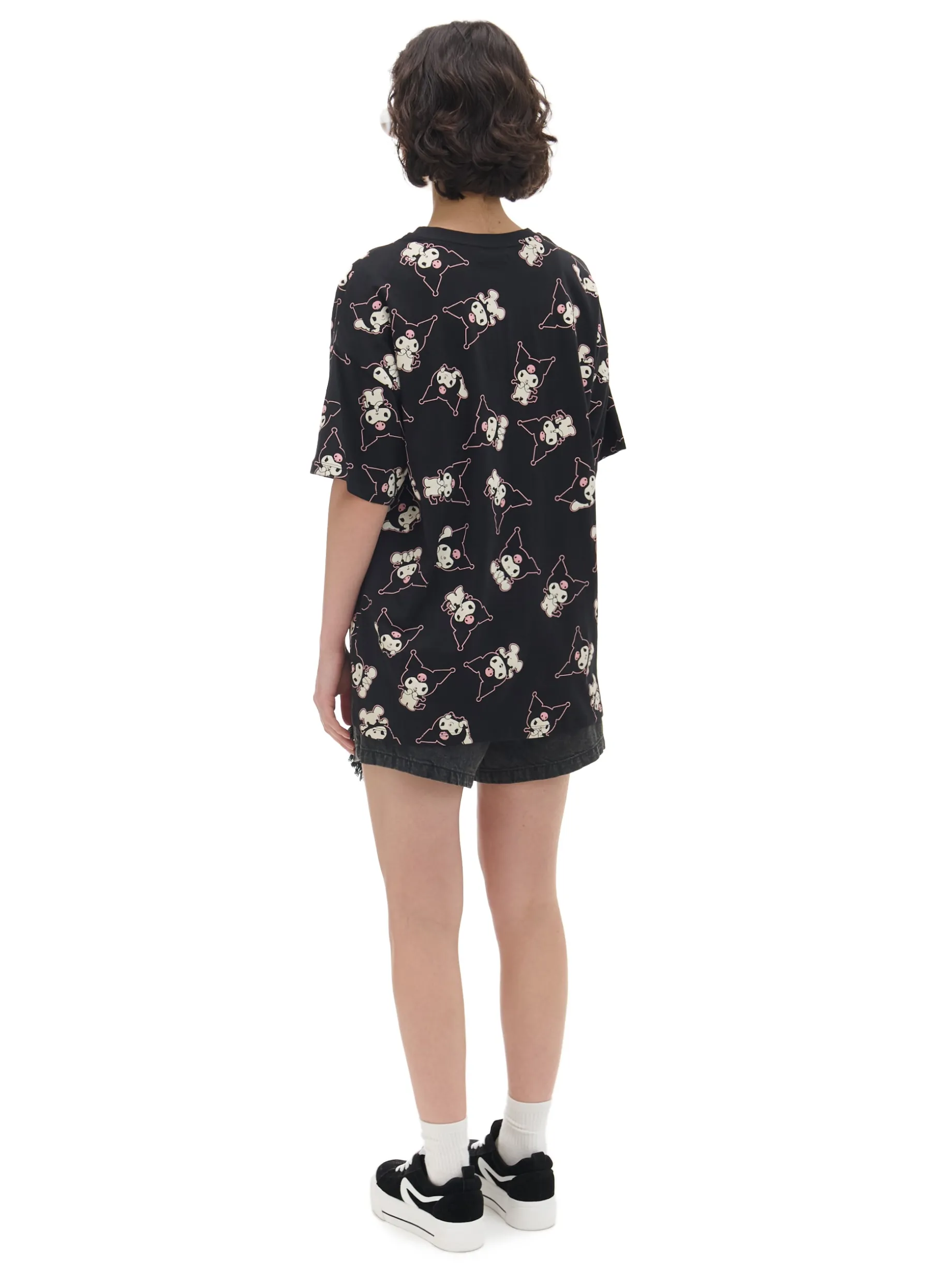 Czarna damska koszulka, uszyta w 100% bawełny. fason oversize krótkie rękawy nadruk z motywem Kuromi all over z przodu błyszczący różowy napis Wzrost modelki: 172 cm © 2024 SANRIO CO., LTD.