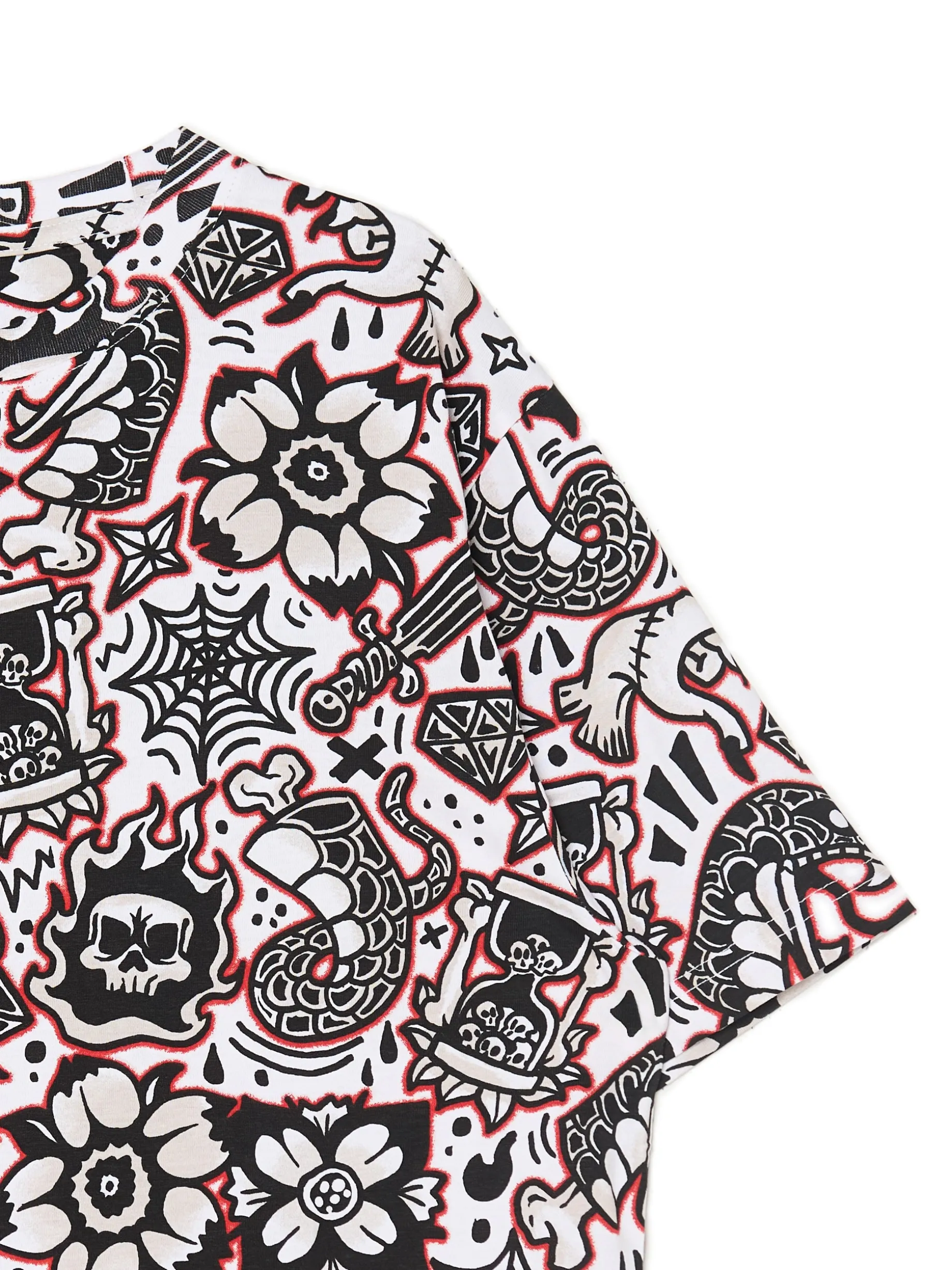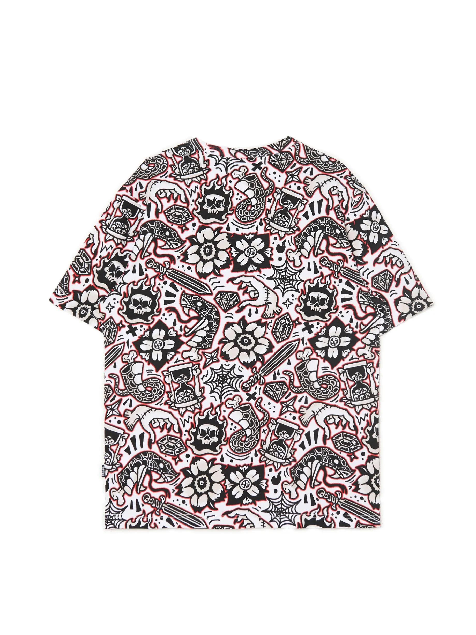 Bawełniana męska koszulka z krótkim rękawem i unikatowym nadrukiem na całej powierzchni w kolorze czarnym i czerwonym. 100% bawełny regularny krój okrągły dekolt z lamówką krótkie, swobodne rękawy nowoczesny nadruk all over