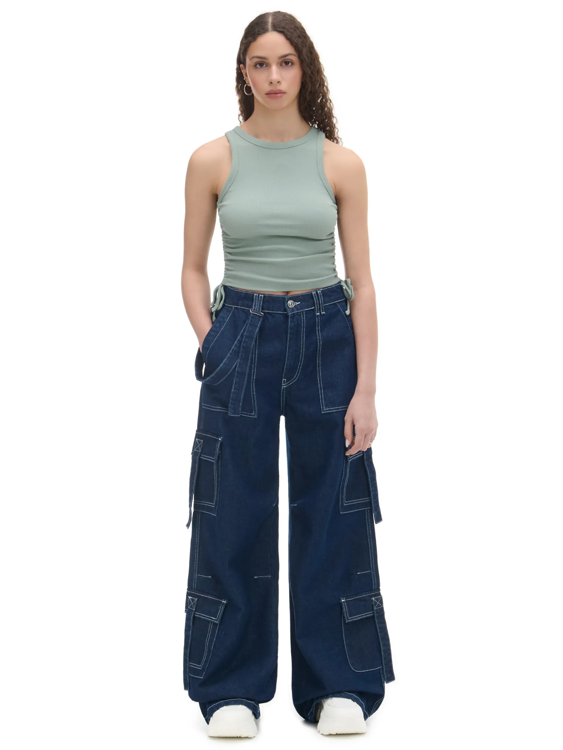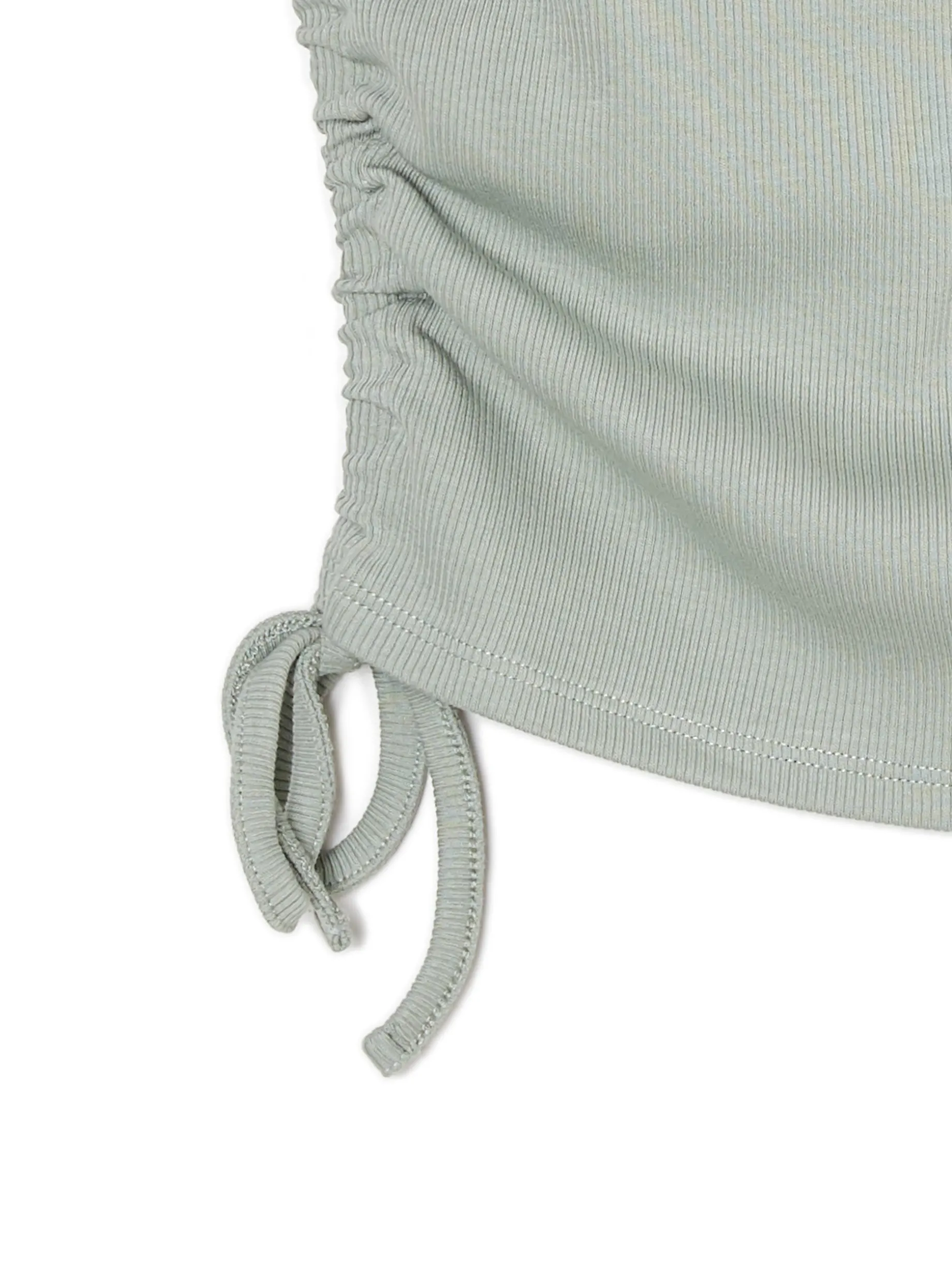Zielony damski top, uszyty z dzianiny o wysokiej zawartości bawełny. mocno dopasowanu krój dekolt typu halterneck grube ramiączka po bokach marszczenia i wiązania Wzrost modelki: 170 cm