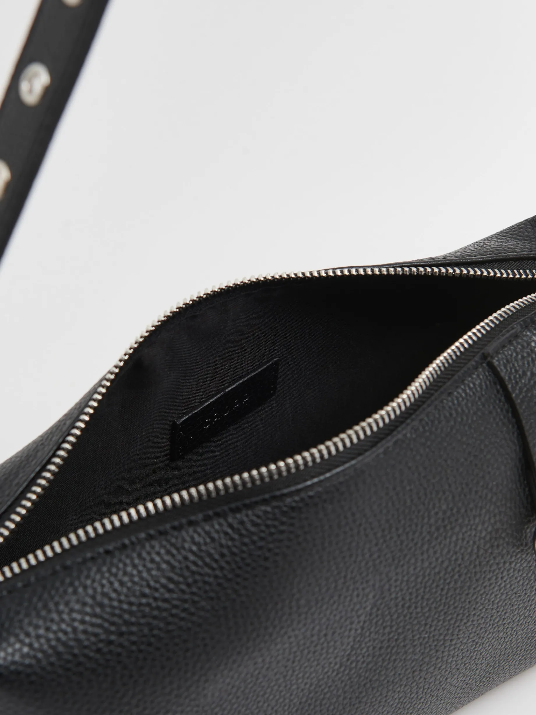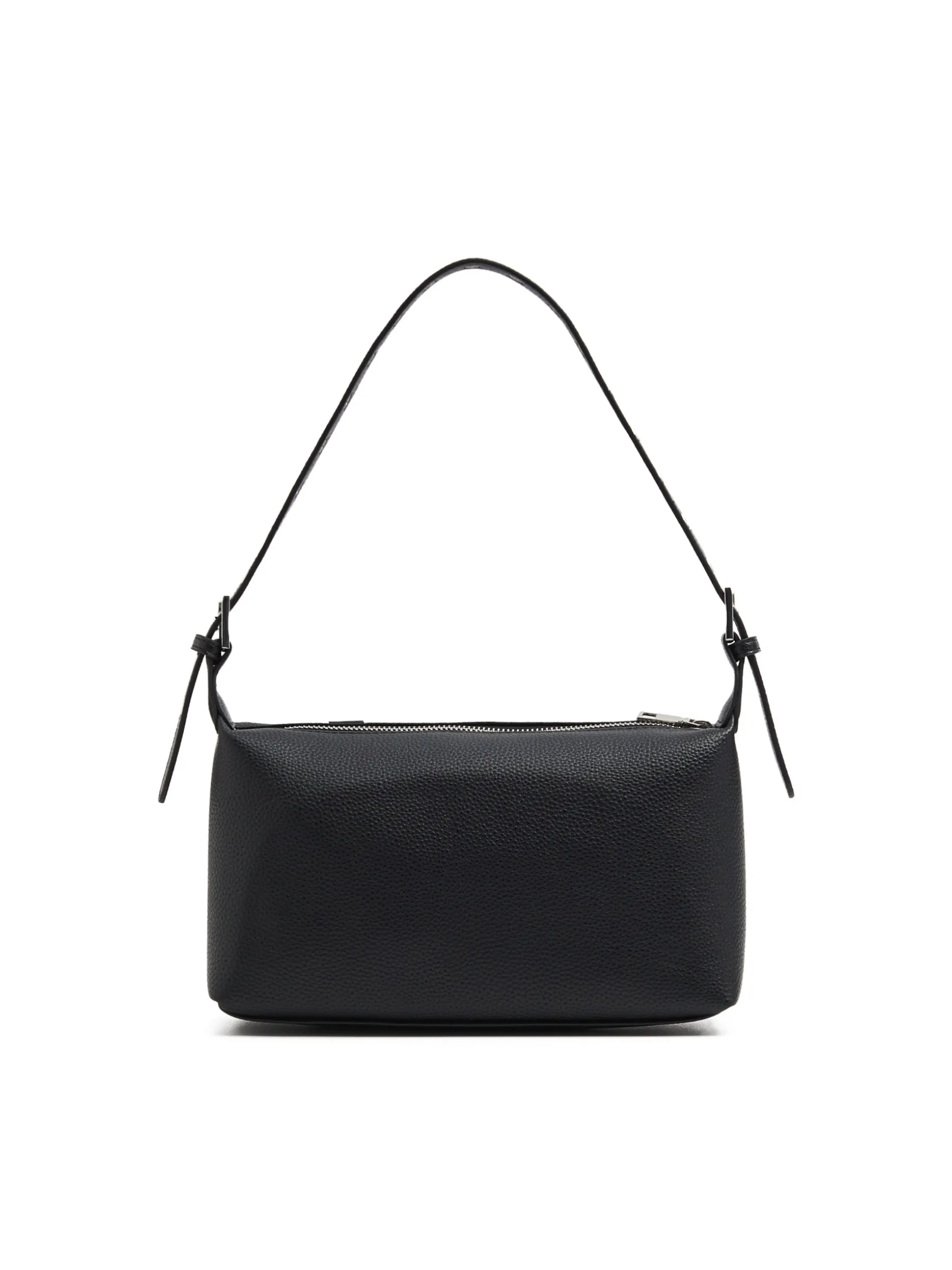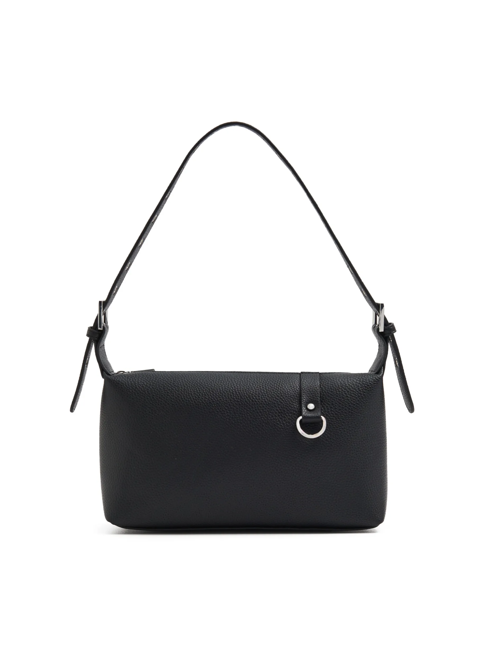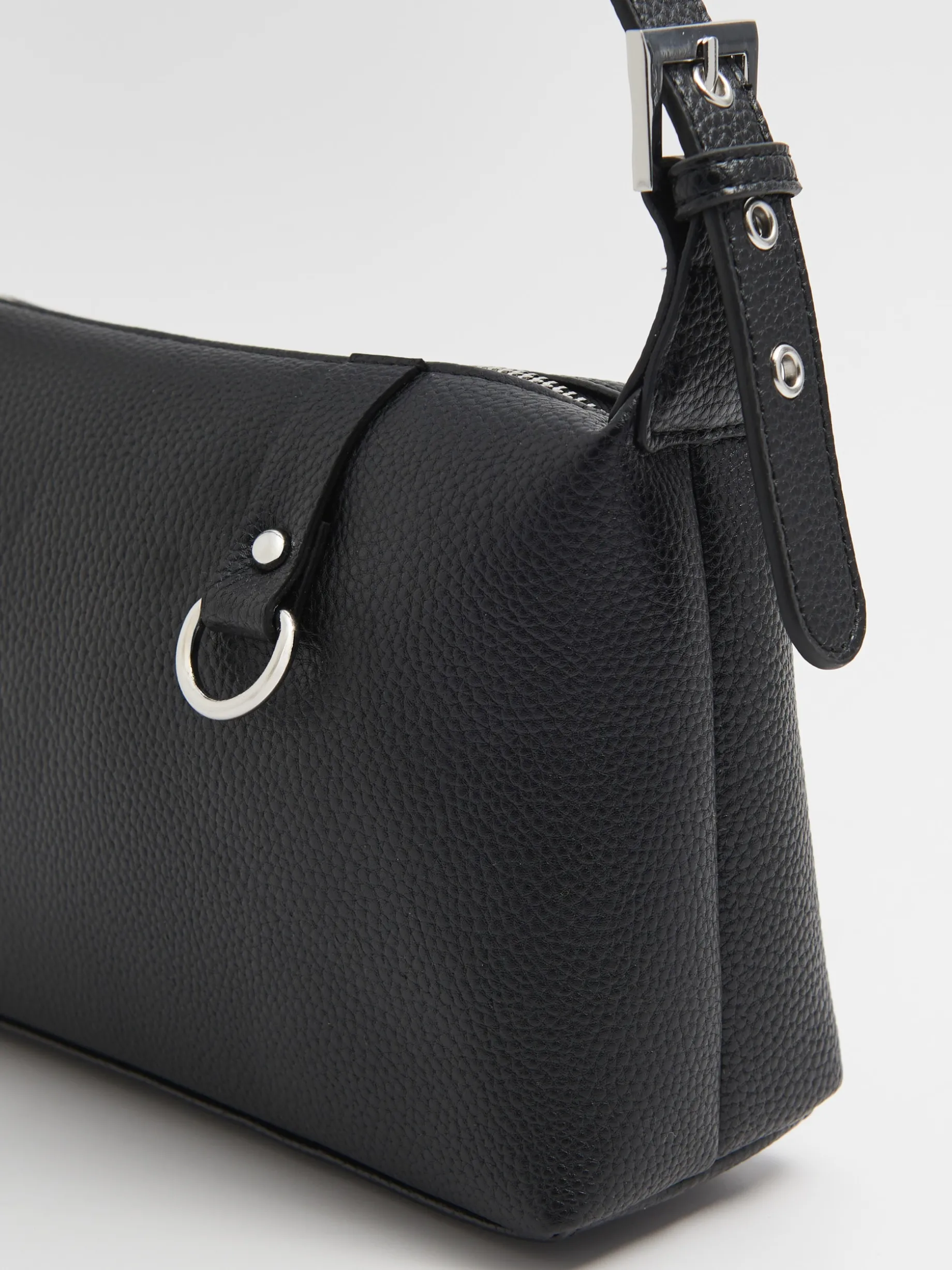 Mała damska torebka, uszyta z tkaniny imitującej skórę w czarnym kolorze. Regulowany pasek i dodatkowe detale w srebrnym kolorze dopasują się do imprezowych stylizacji. uszyta z materiału imitującego skórę mała torebka typu camera bag pasek z regulacją długości główna komora z zapięciem na zamek karabińczyk do mocowania kluczy lub innych akcesoriów Wymiary torebki: 13cm x 26cm x 8cm