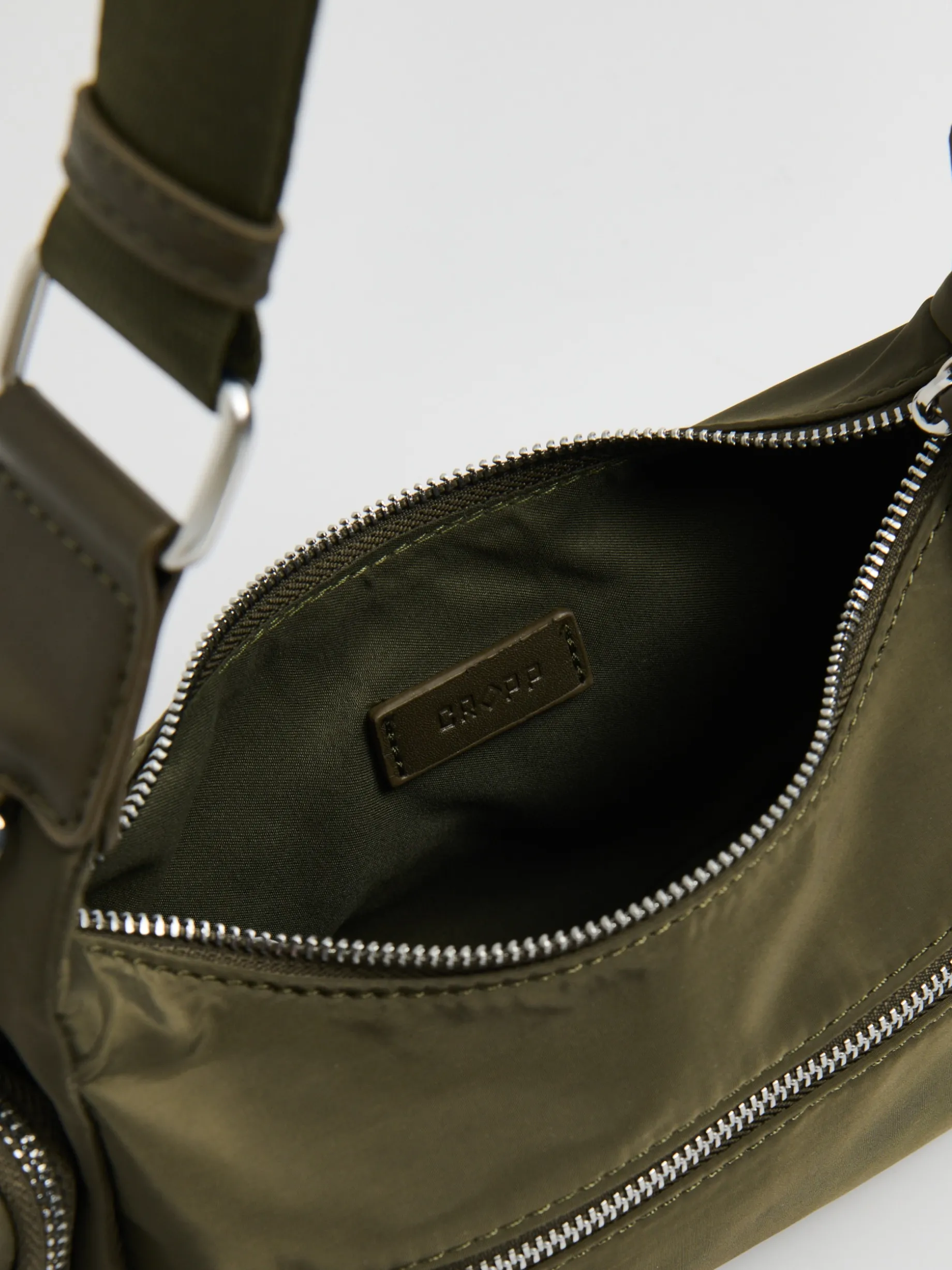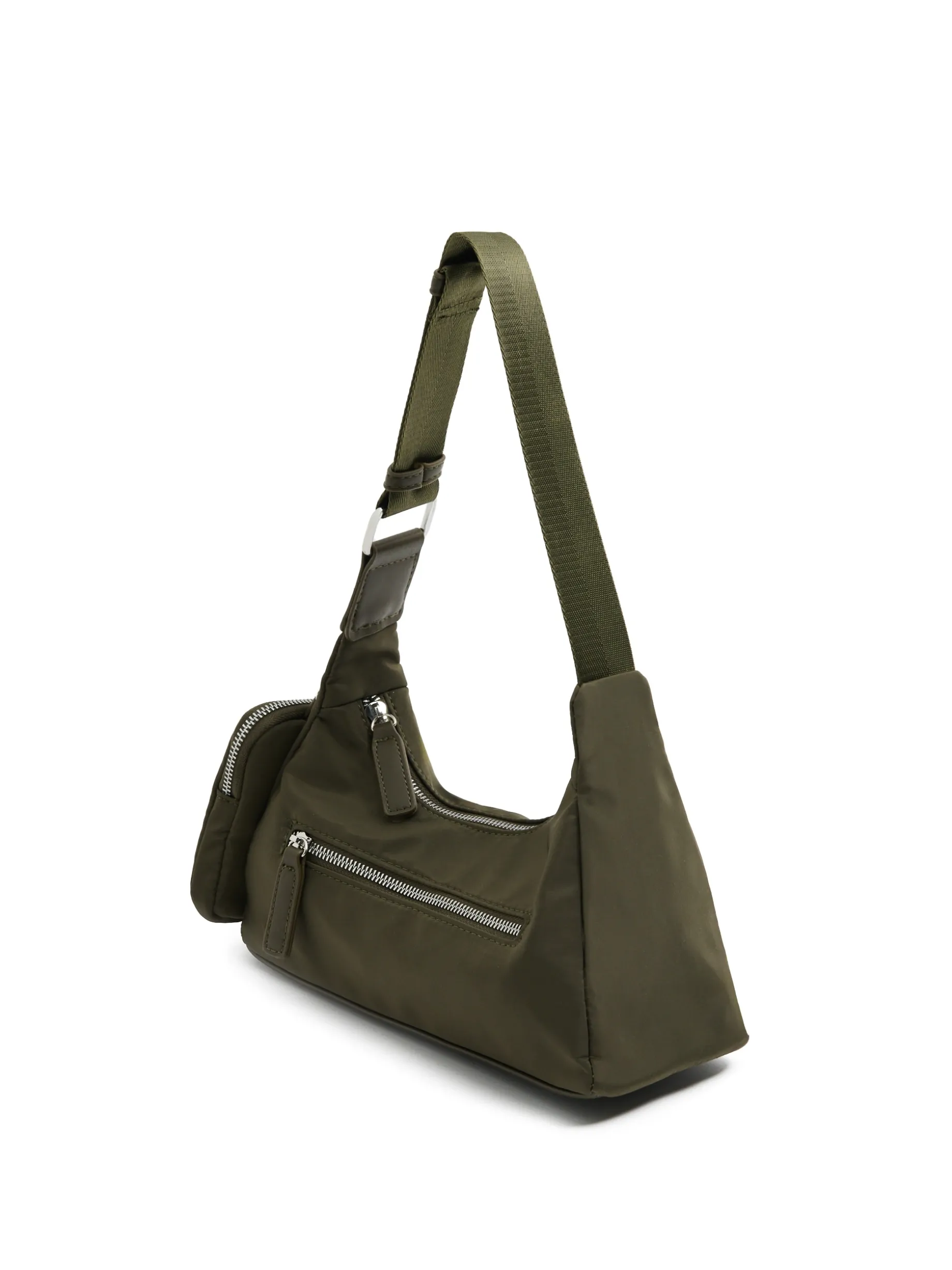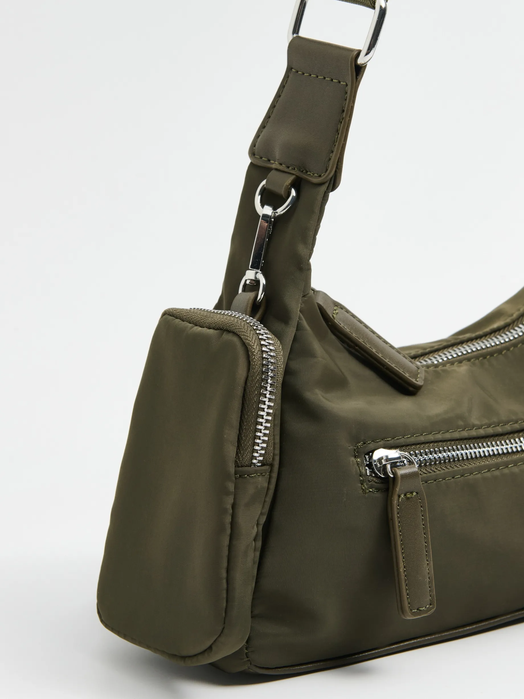 Damska torebka o kształcie hobo, uszyta z mieszanki tkanin. Dodatkiem jest mała saszetka na kosmetyki lub klucze, z możliwością przypięcia na karabińczyk. wykonana z łączonych materiałów pasek z regulacją długości środkowa komora zapinana na zamek dodatkowa kieszeń zewnętrzna z zapięciem na zamek organizer na karabińczyk z zapięciem na suwak