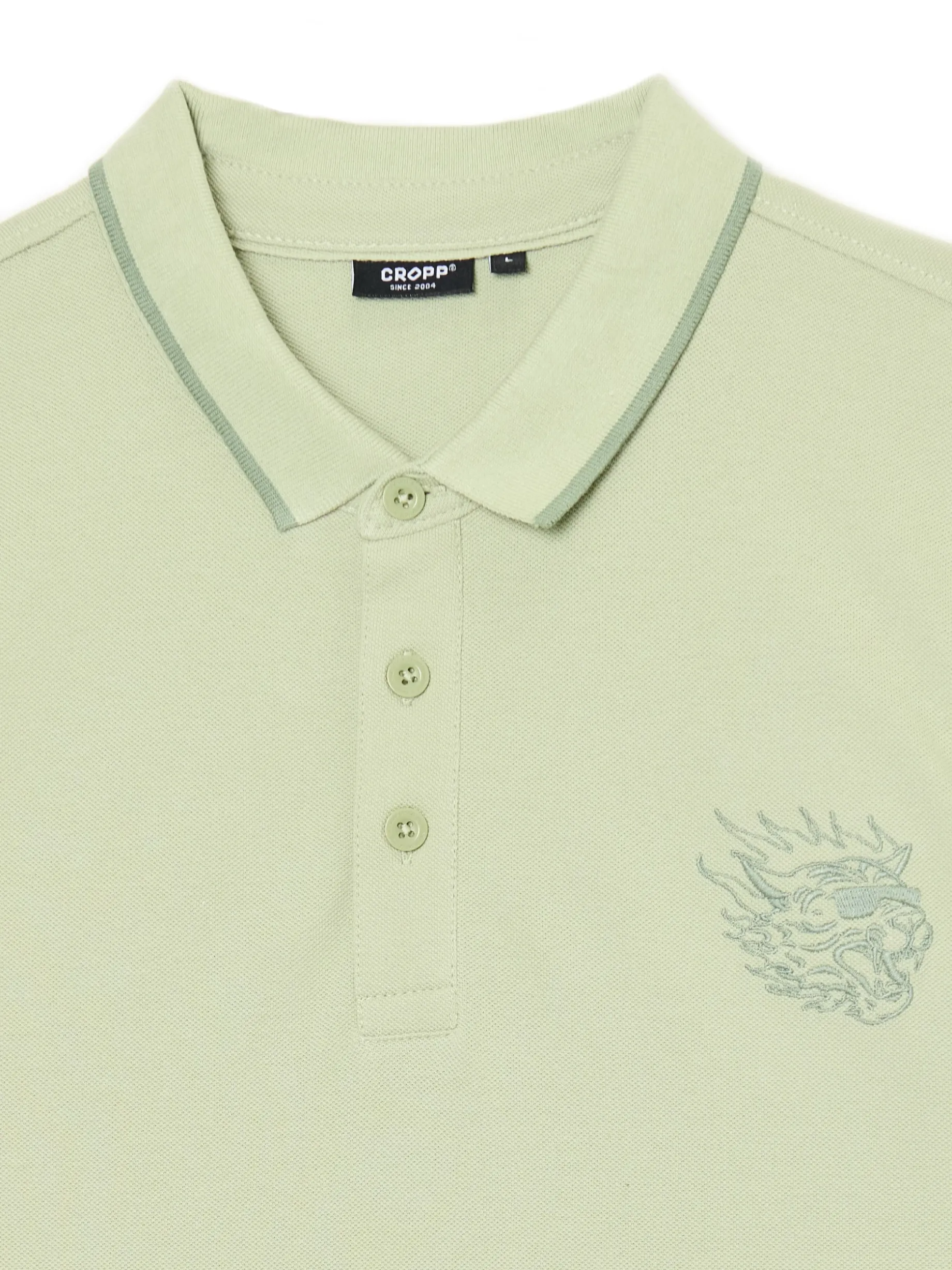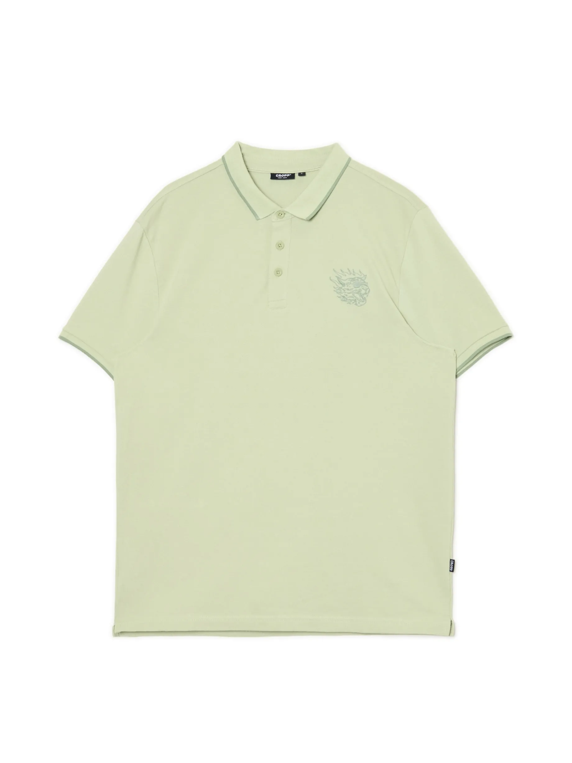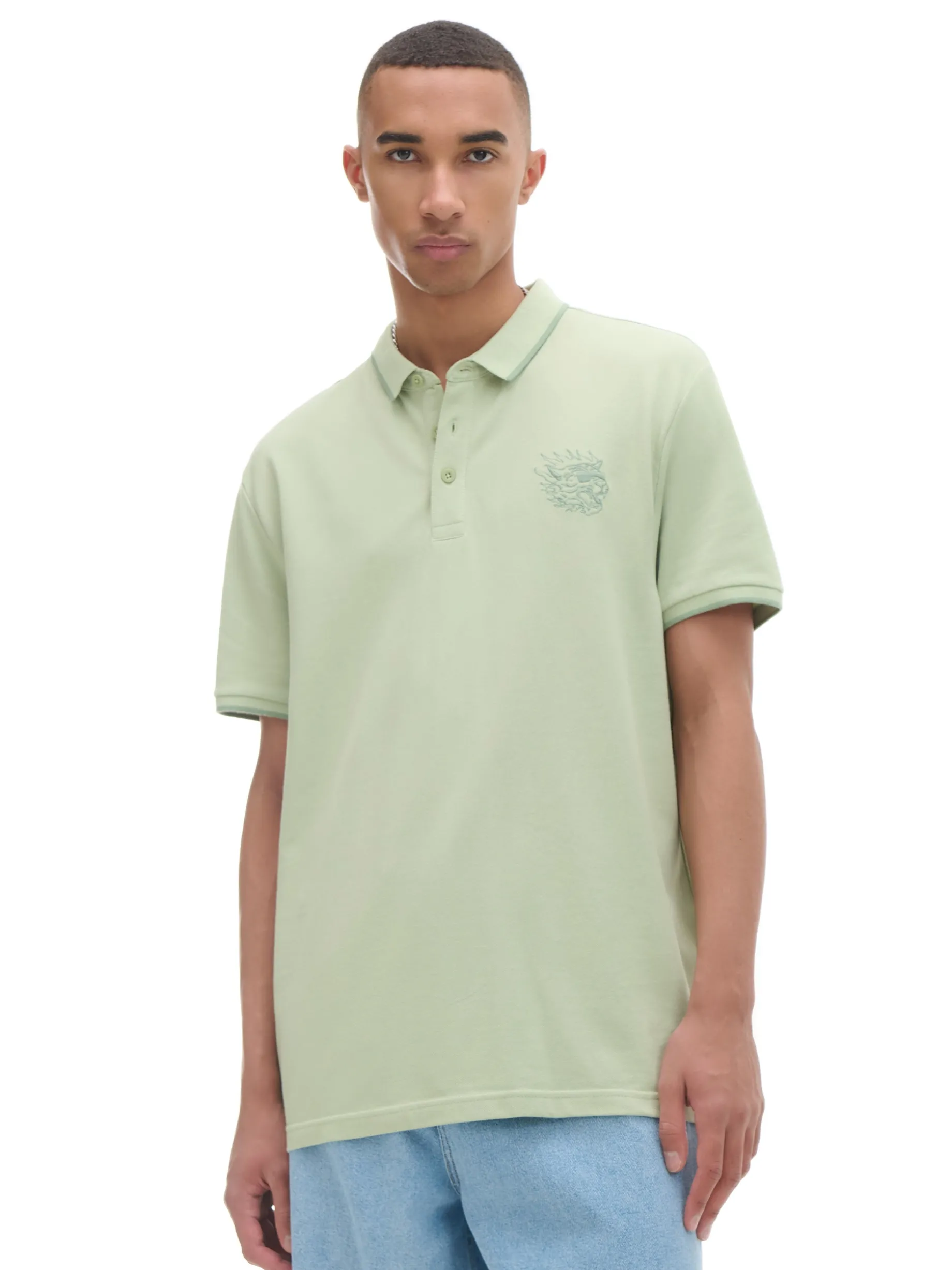 Jasnozielona męska koszulka polo, uszyta w 100% z bawełny. Dowód na to, że mix streetwearu i old money wygląda genialnie! regularny krój kołnierzyk polo i guziki krótkie rękawy z ciekawym wykończeniem na piersi haft z motywem tygrysa Wzrost modela: 185 cm