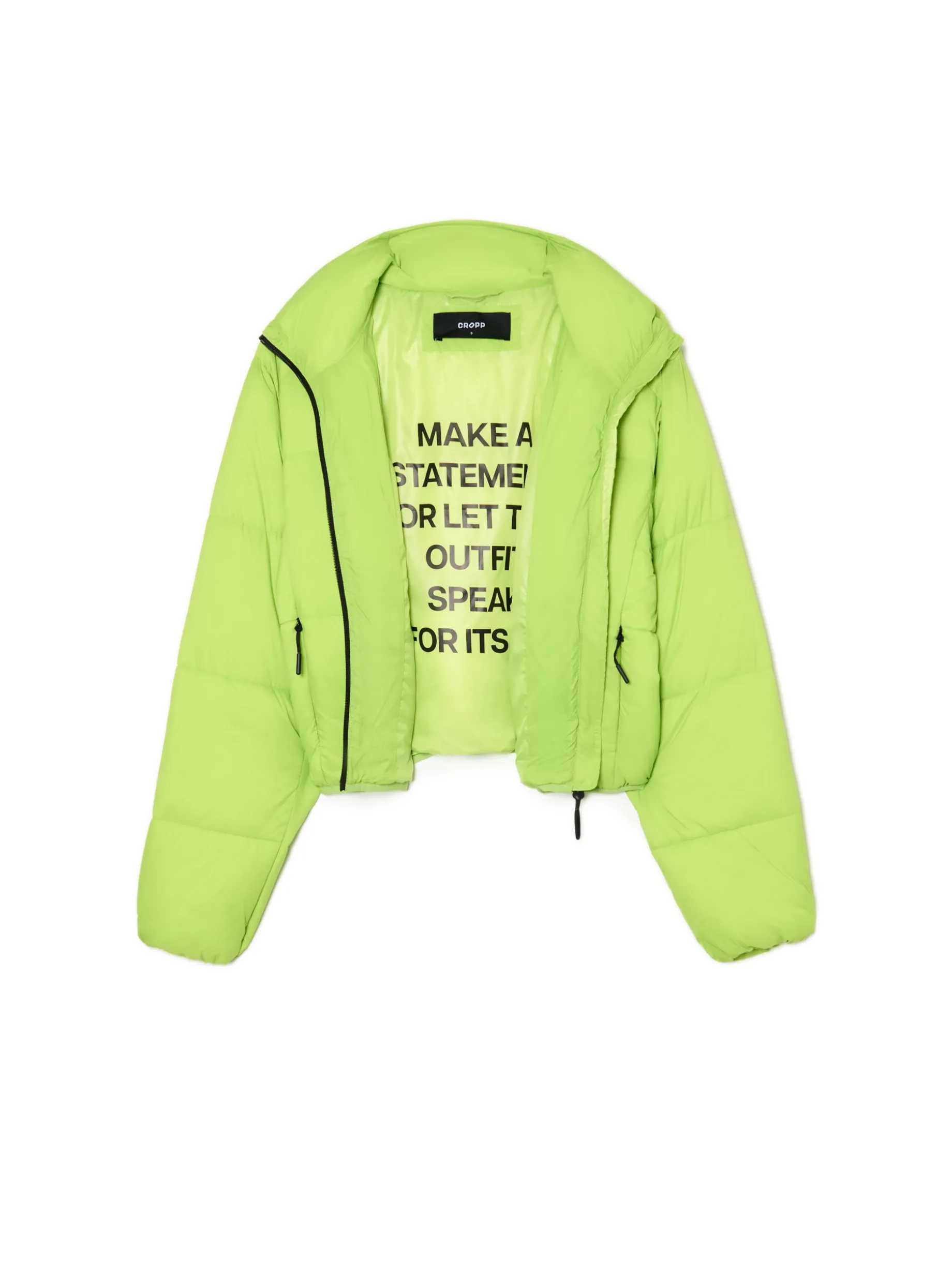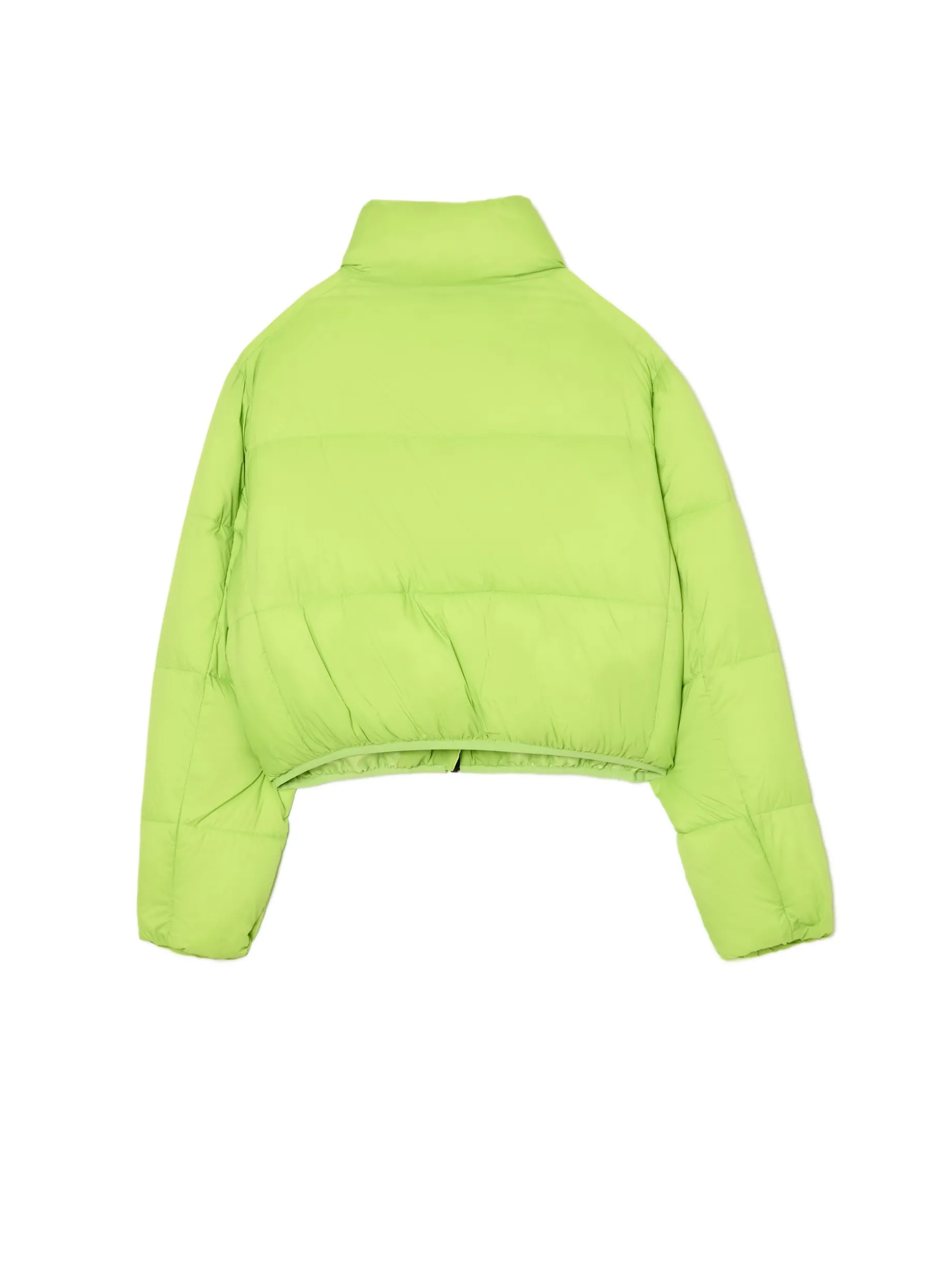 Pikowana damska kurtka typu puffer, uszyta z tkaniny w kolorze zielonym. Wewnątrz ocieplenie z recyklingowanego puchu syntetycznego. Ten outerwear ogrzeje Cię w sezonie zimowym! basicowa kurtka typu puffer zapinana na zamek na całej długości wewnątrz wykończenie na podszewce ocieplenie wysoki kołnierz dół i rękawy zakończone elastycznymi gumkami kieszenie boczne z zamkami zapięcia z wygodnymi pullerami