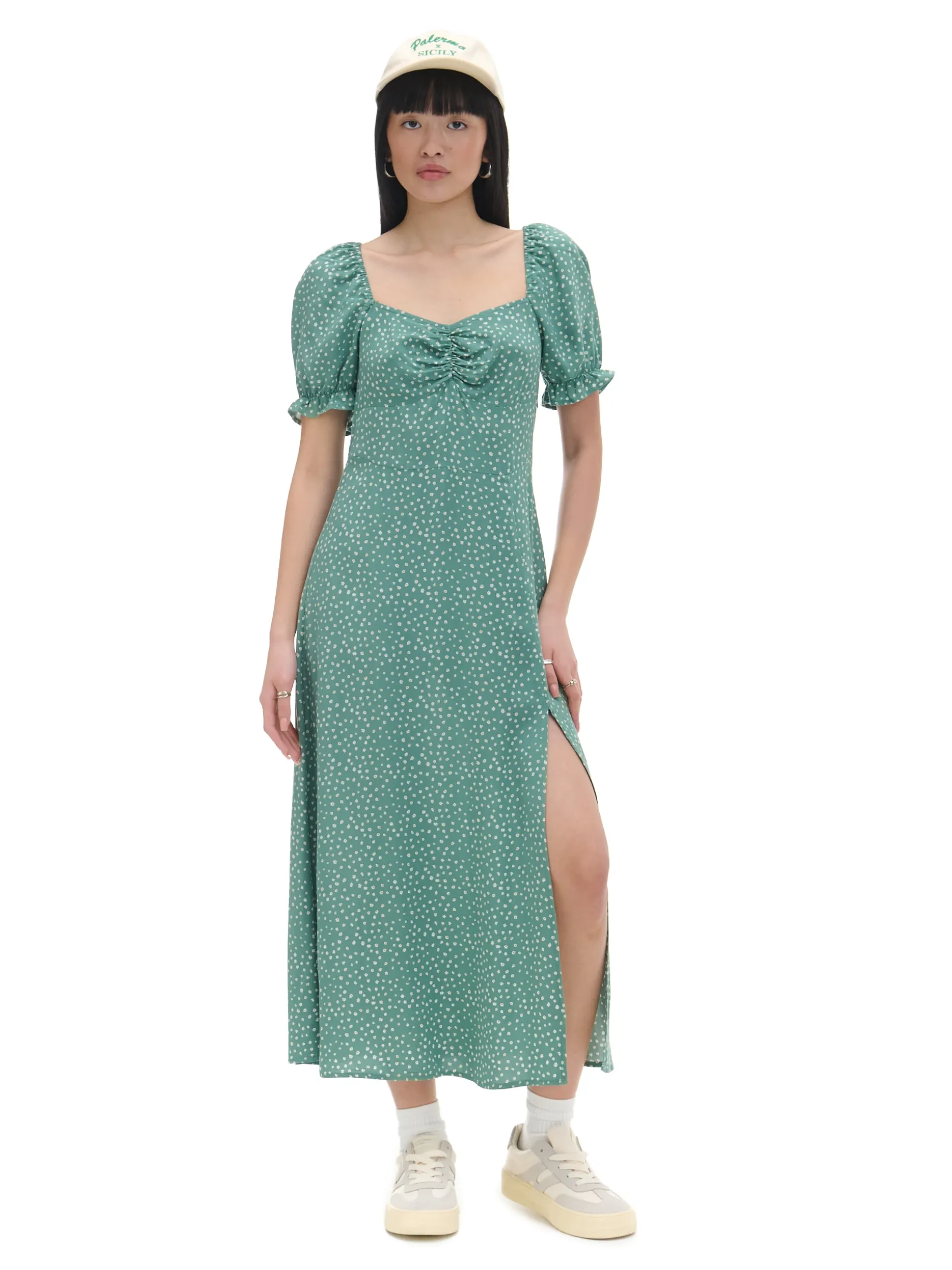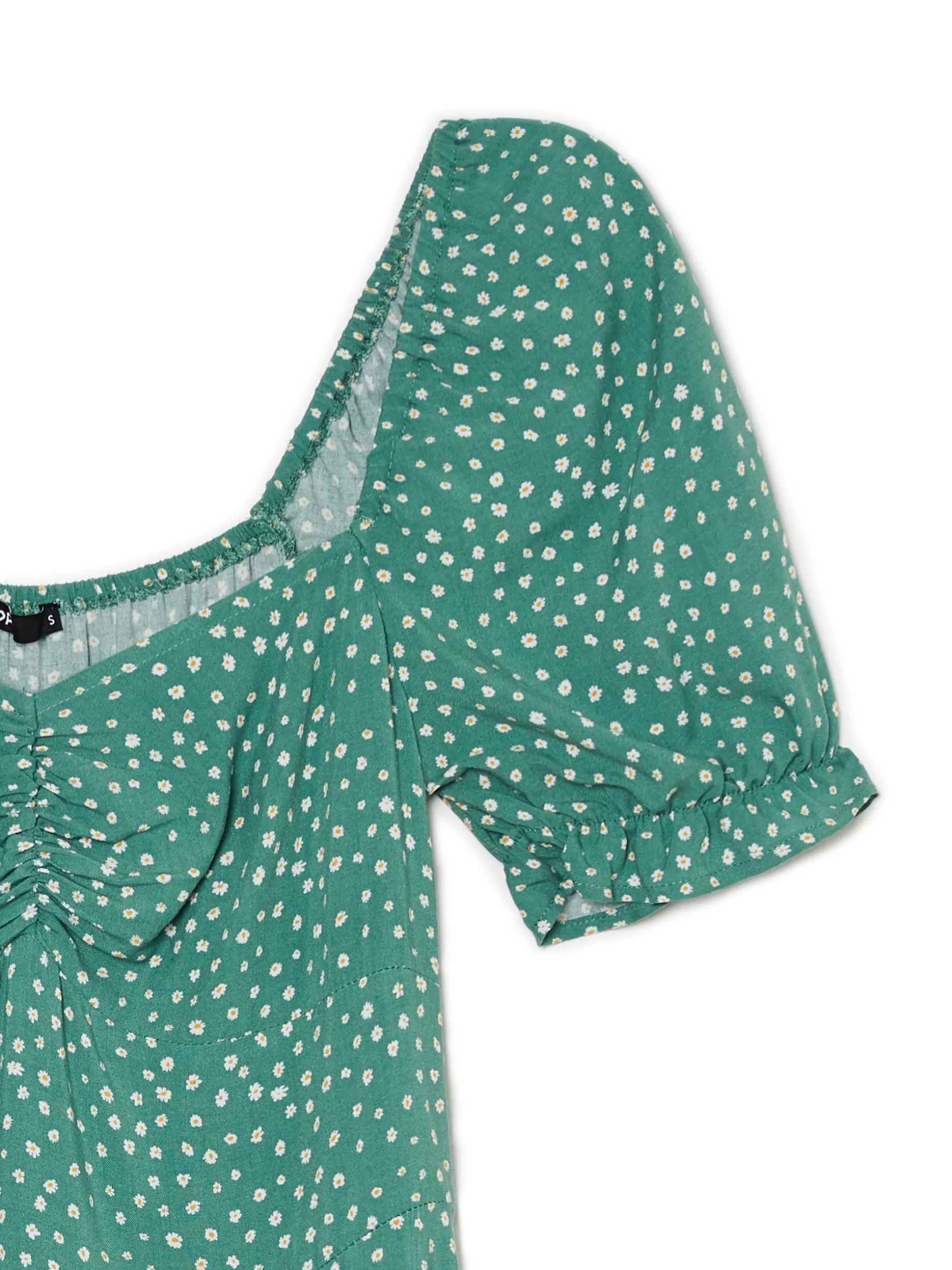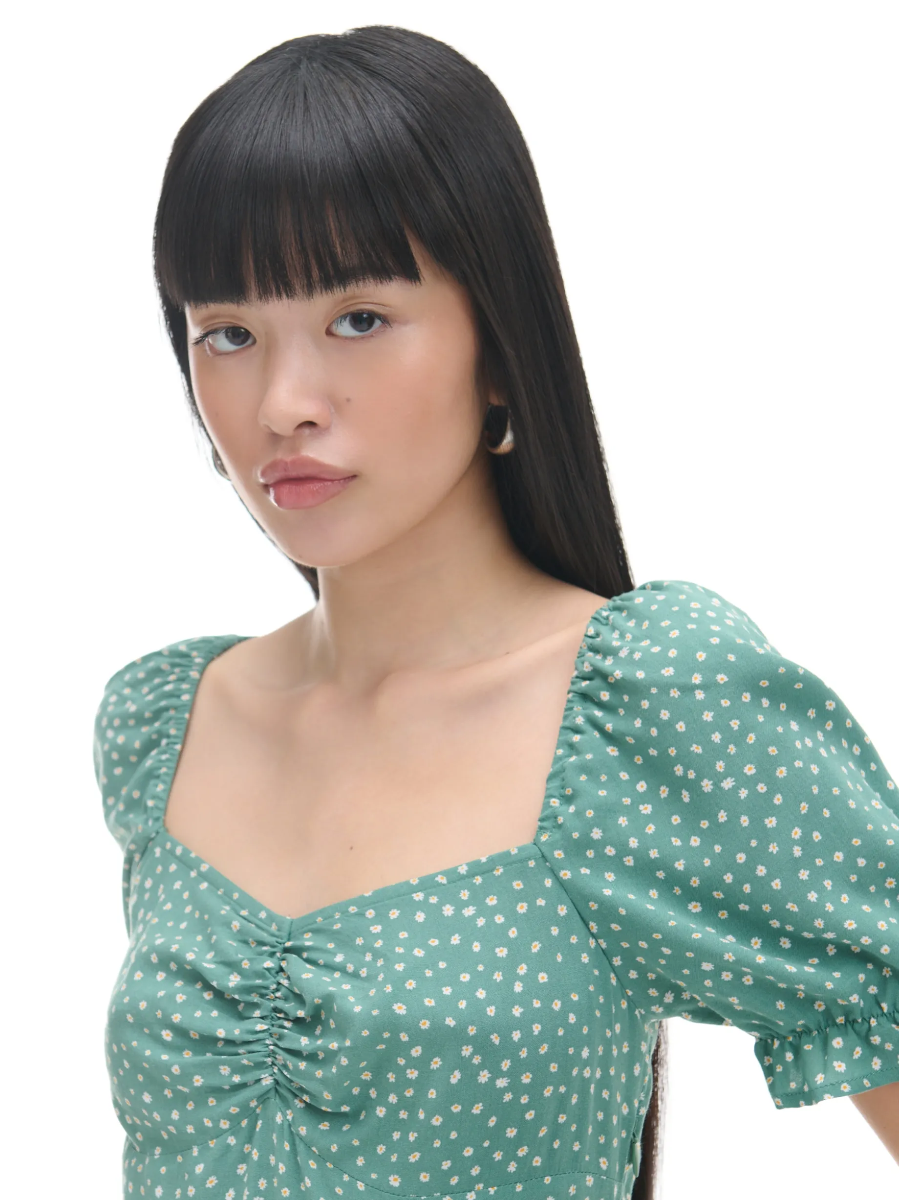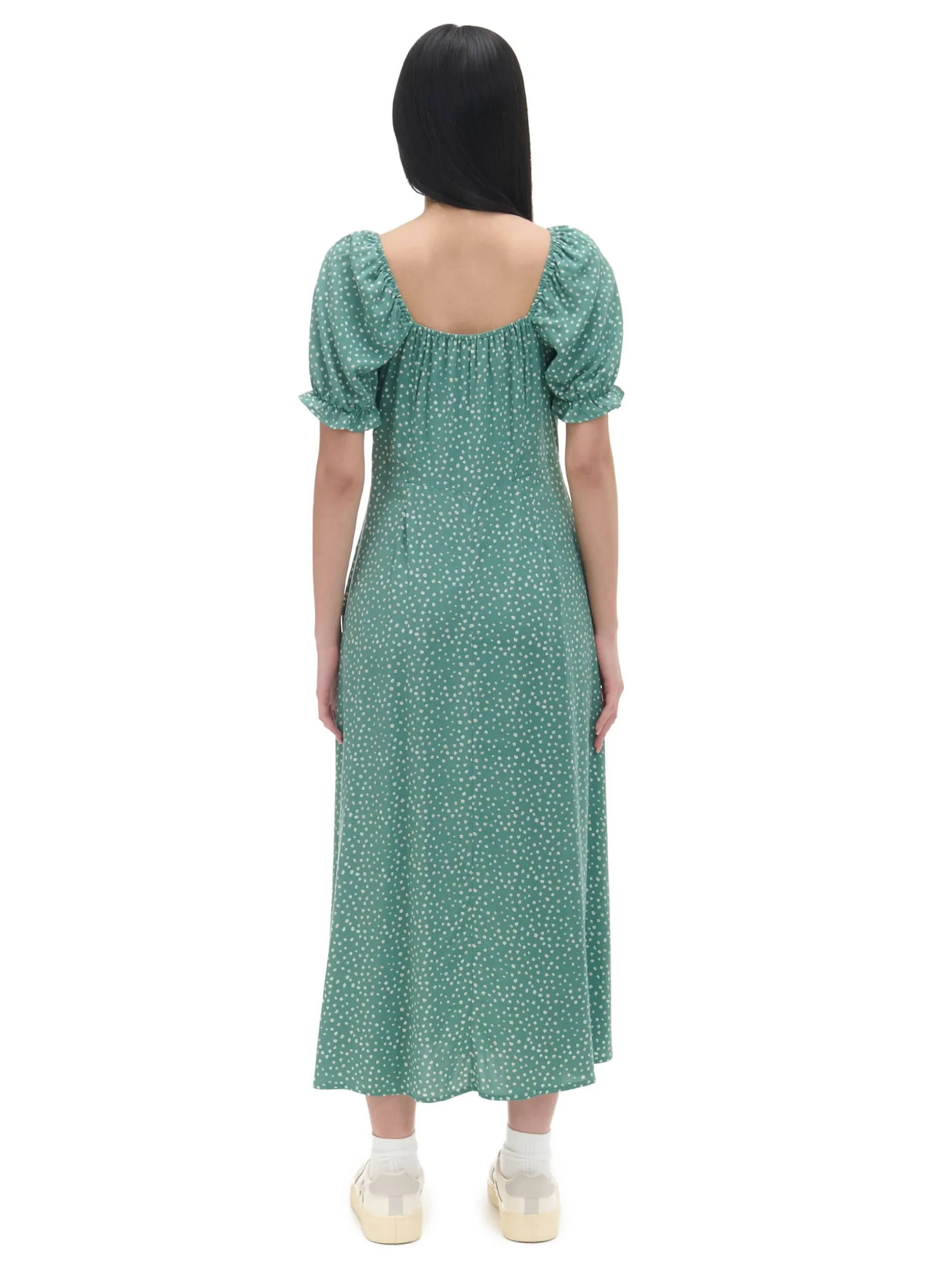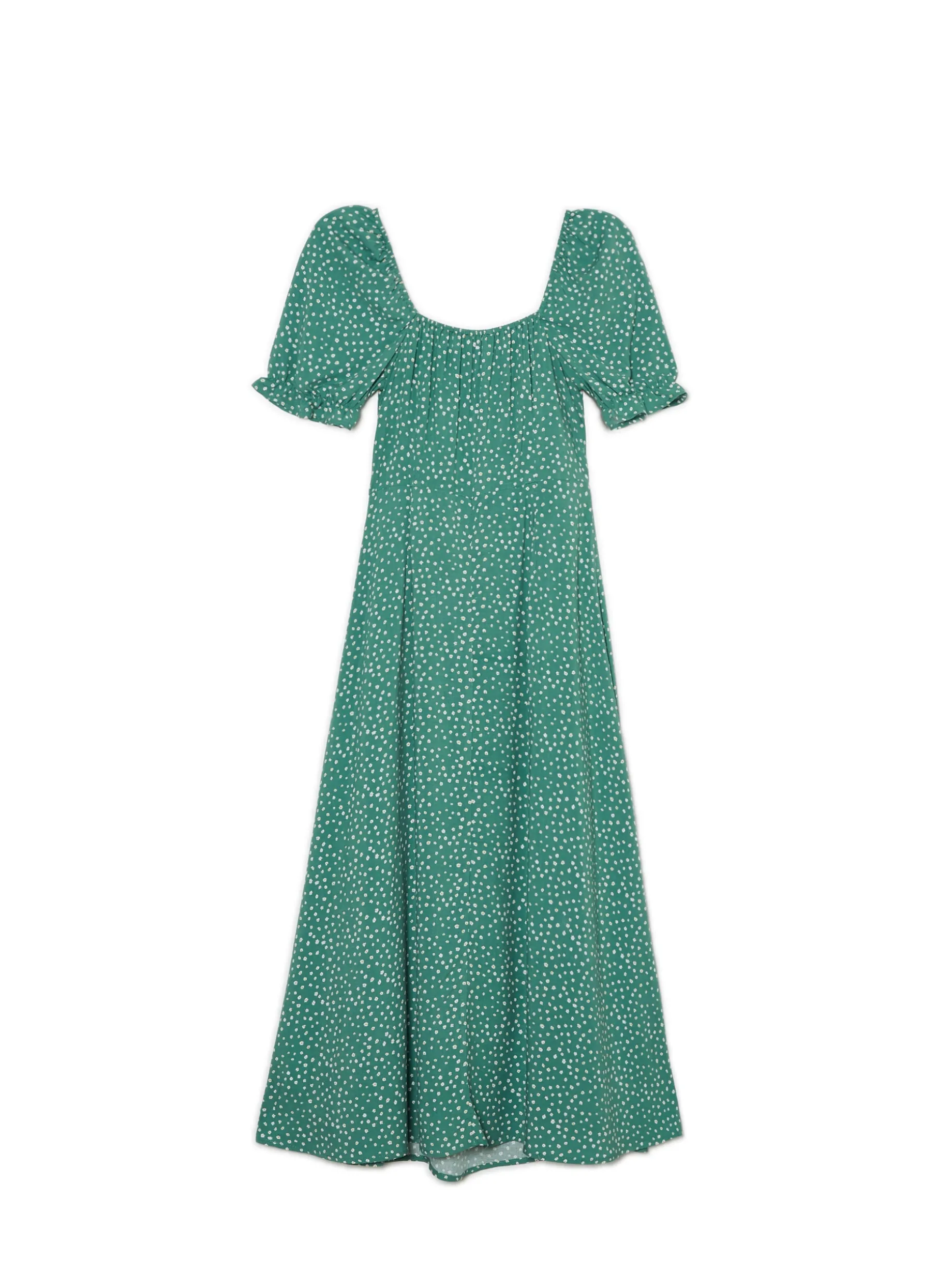 Delikatna damska zielona sukienka z kwiatowym wzorem, idealna na letnie dni. 100% wiskozy długość midi rozcięcie z boku dekoracyjne marszczenie pod biustem krótkie, bufiaste rękawy zakończone gumką Wzrost modelki: 168 cm
