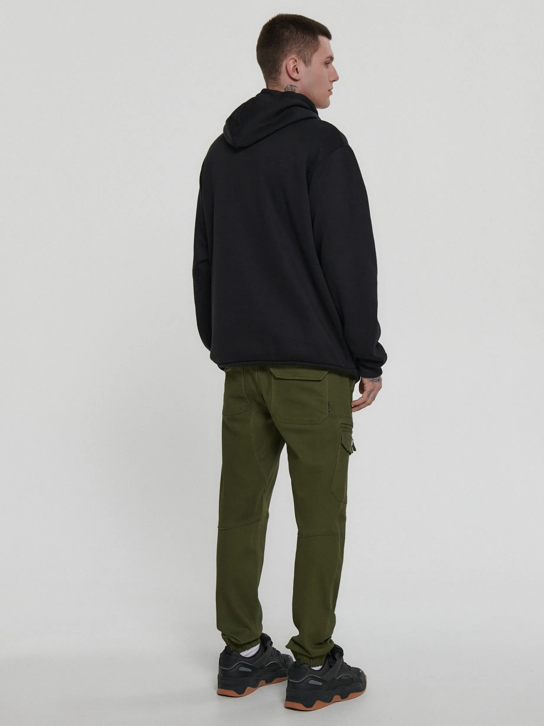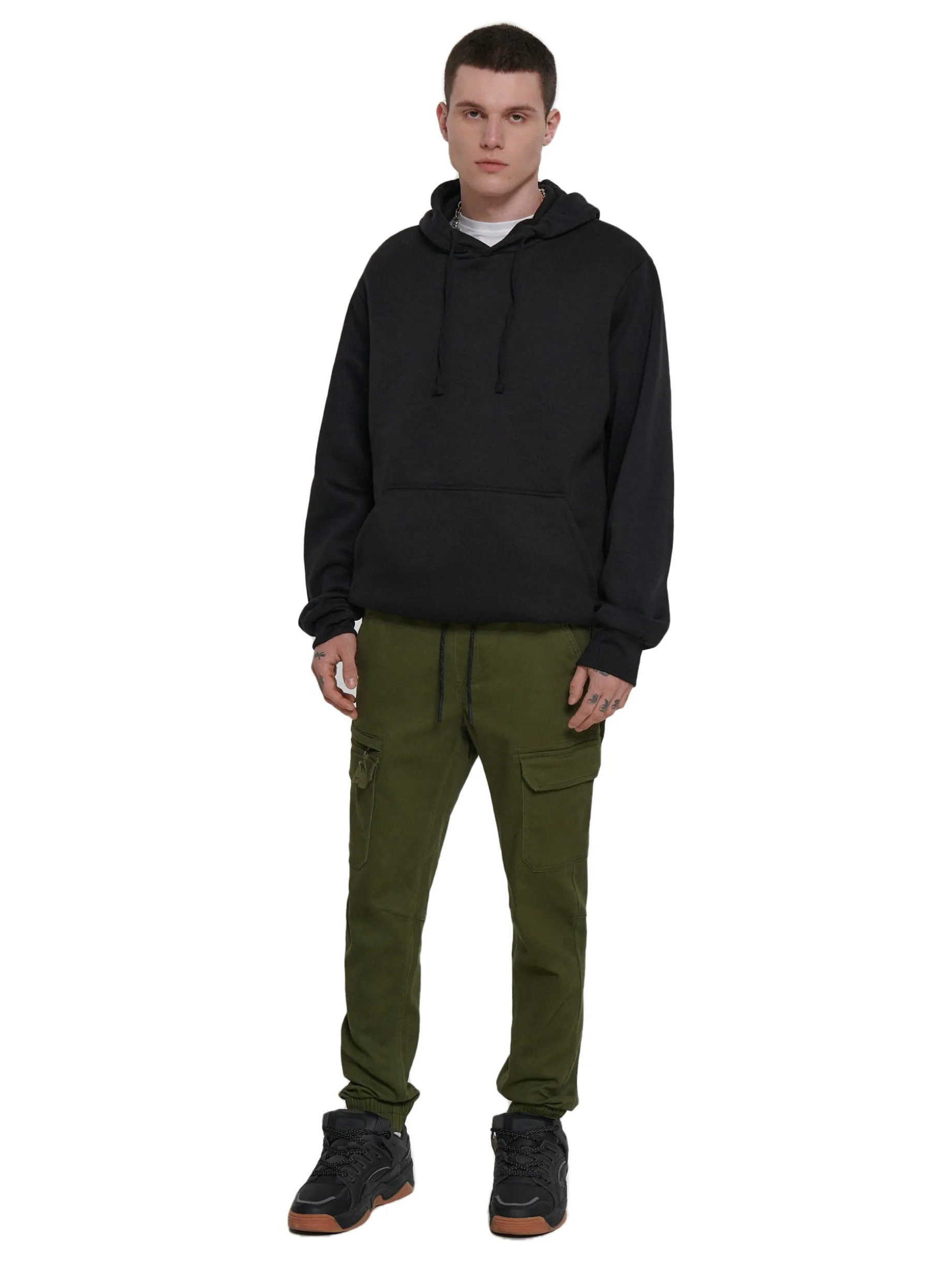 Męskie spodnie, uszyte z tkaniny o wysokiej zawartości bawełny z dodatkiem elastycznych włókien. regularny stan w pasie gumka oraz sznurek do regulacji długa nogawka zakończona ściągaczem siedem kieszeni, w tym jedna zapinana na suwak