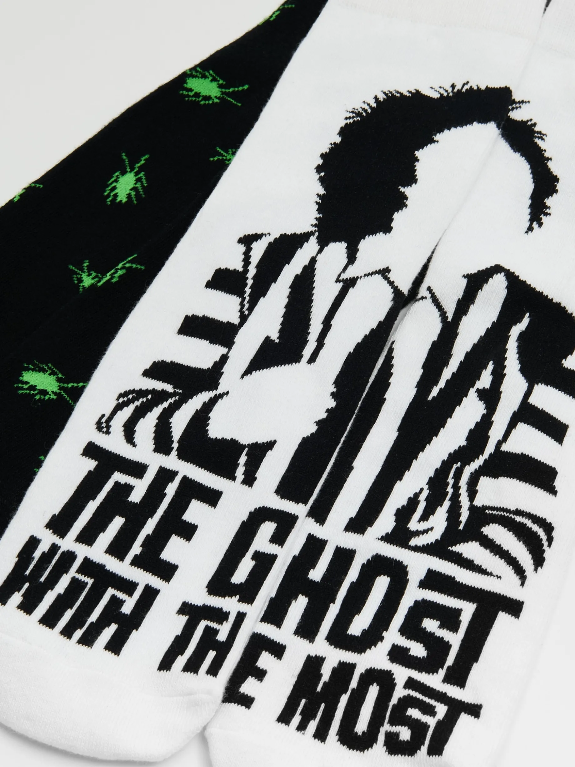 Zestaw dwóch par długich, męskich skarpet, uszytych z miłej w dotyku mieszanki dzianin. Na każdej parze nadruk z motywem filmowym Beetlejuice. Karaluszki idealne na halloweenowy wieczór. dzianina z dodatkiem elastycznych włókien dłuższy, prosty krój nadruk z motywem Halloween BEETLEJUICE TM & © WBEI. (s. 24) 22588