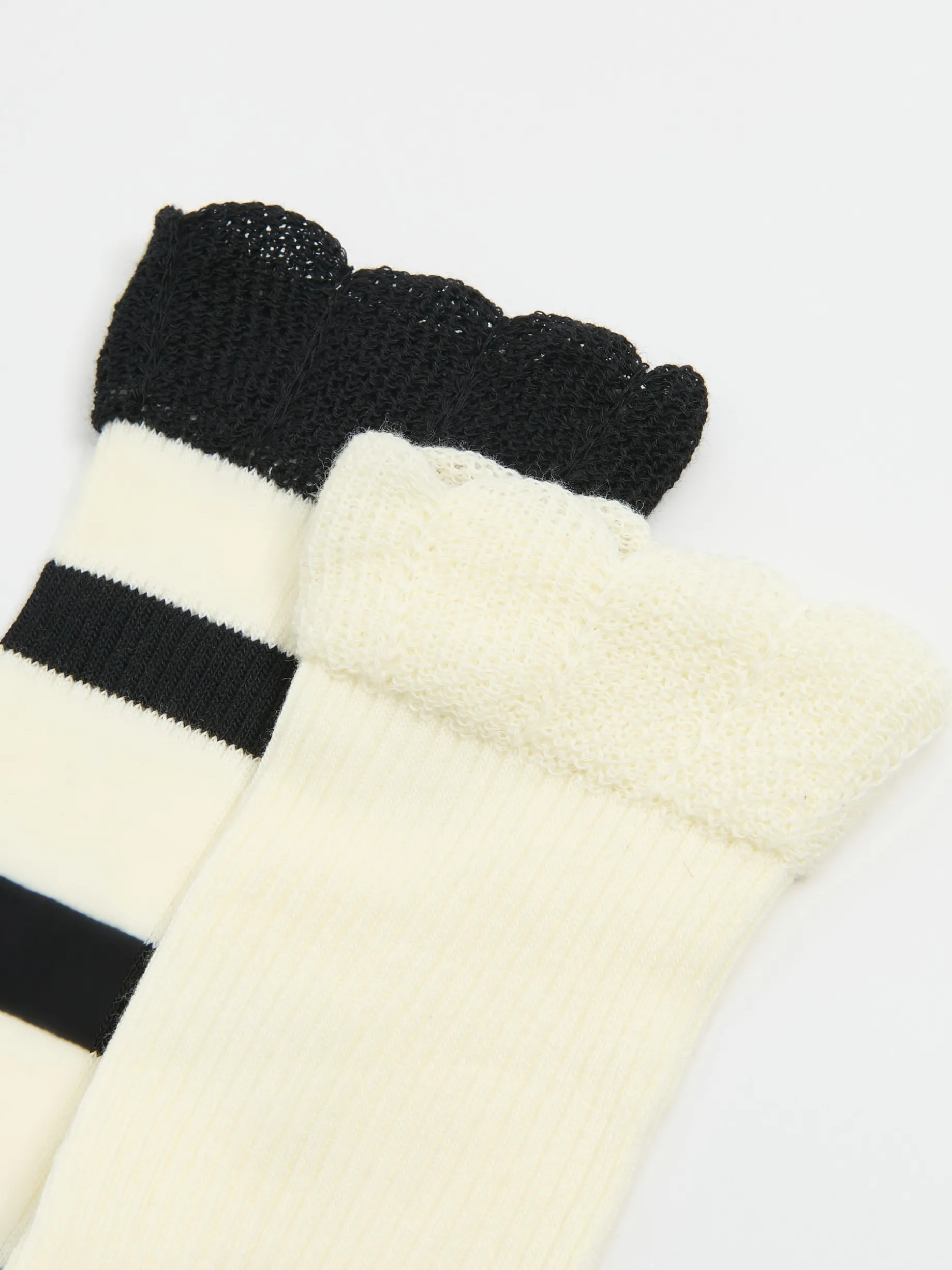 Zestaw dwóch par długich damskich skarpet uszytych z mieszanki dzianin w prążki. Jedna para w gładkim, kremowym kolorze, natomiast druga ze wzorem w czarne paski. Oba sety wyposażone w koronkowe wykończenie.