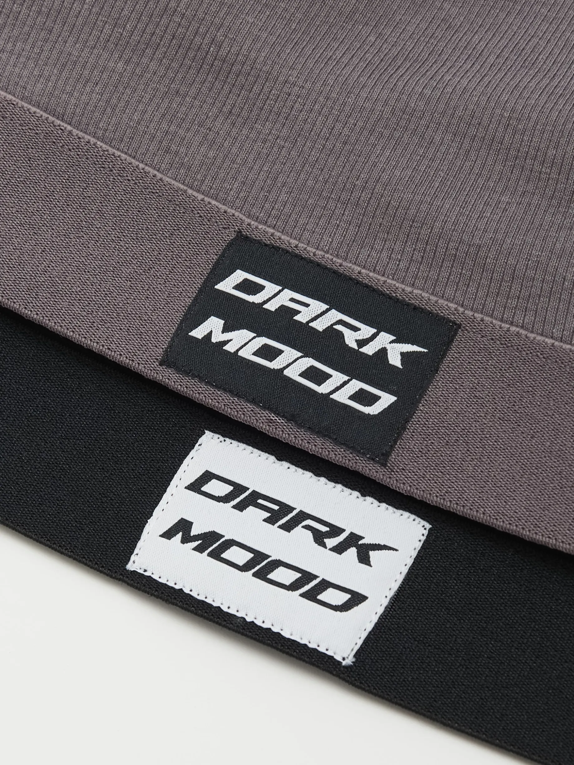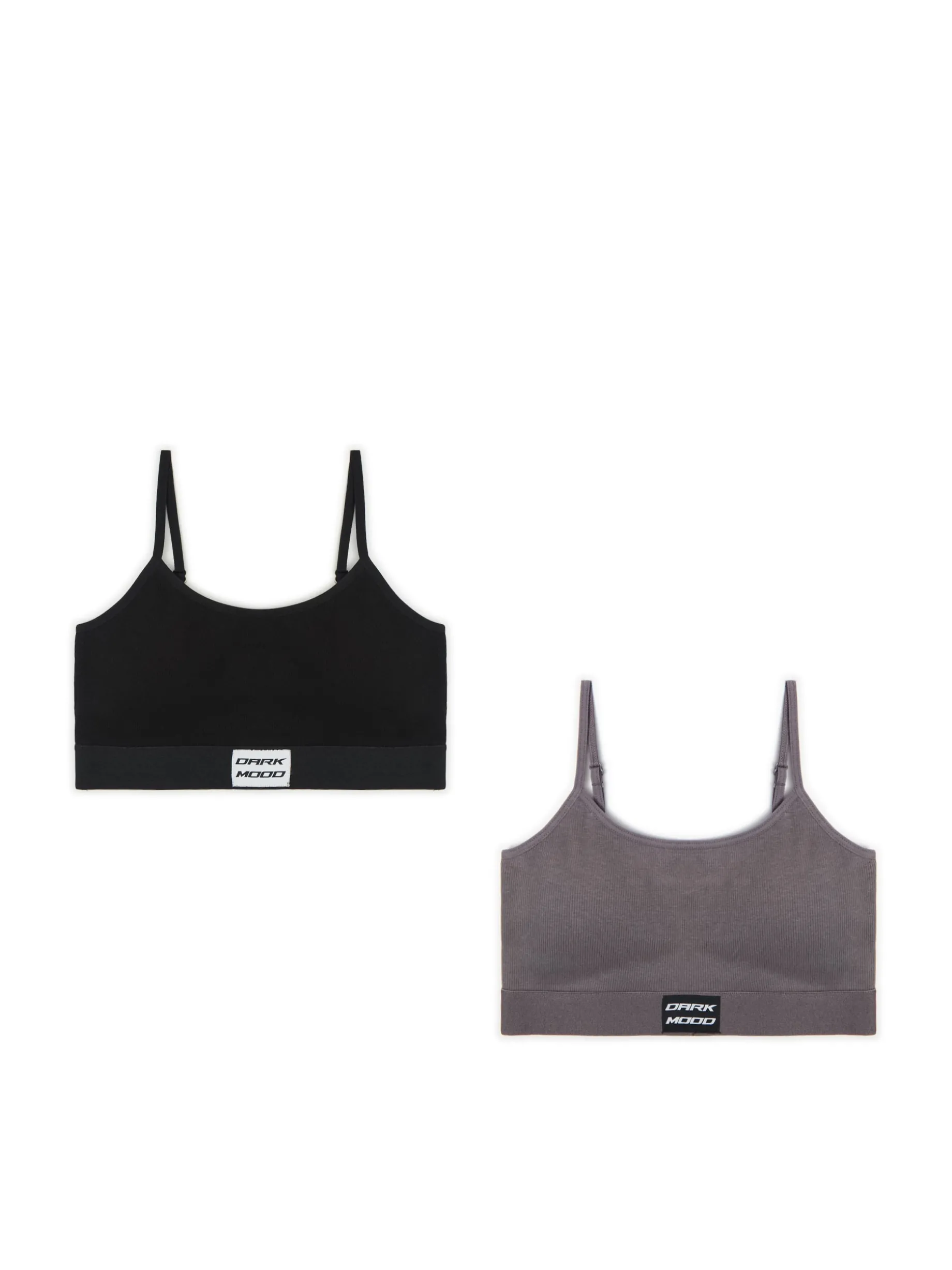 Zestaw dwóch staników sportowych, uszytych z dzianiny o prążkowanej fakturze. W zestawie wersja czarna oraz szara. ozdobna satynowa metka cienkie ramiączka z możliwością regulacji długości dolny brzeg z wszytą elastyczną gumką