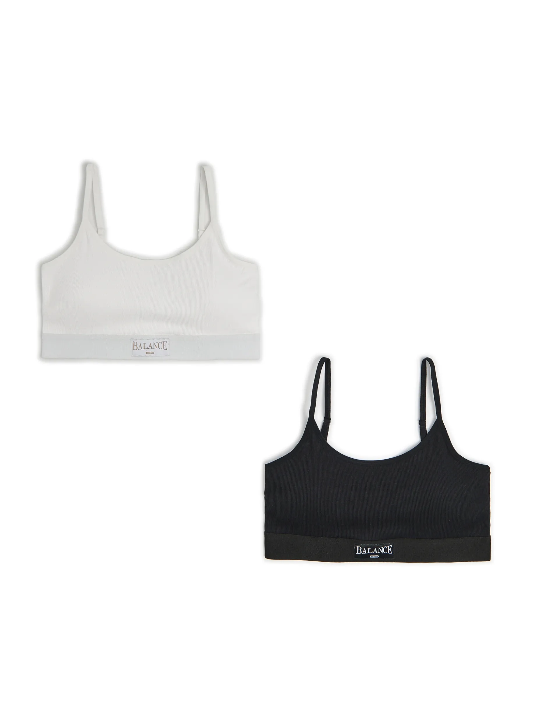 Dwupak damskich staników sportowych uszytych z dzianiny. Ozdobą są delikatne prążki na materiale i satynowa metka na przodzie. Look & vibe! bawełna z dodatkiem elastycznych włókien elastyczna, prążkowana dzianina stanik o sportowym kroju wąskie ramiączka z regulacją długości naszywka z przodu Tworzy zestaw z modelem 790AU-00X .