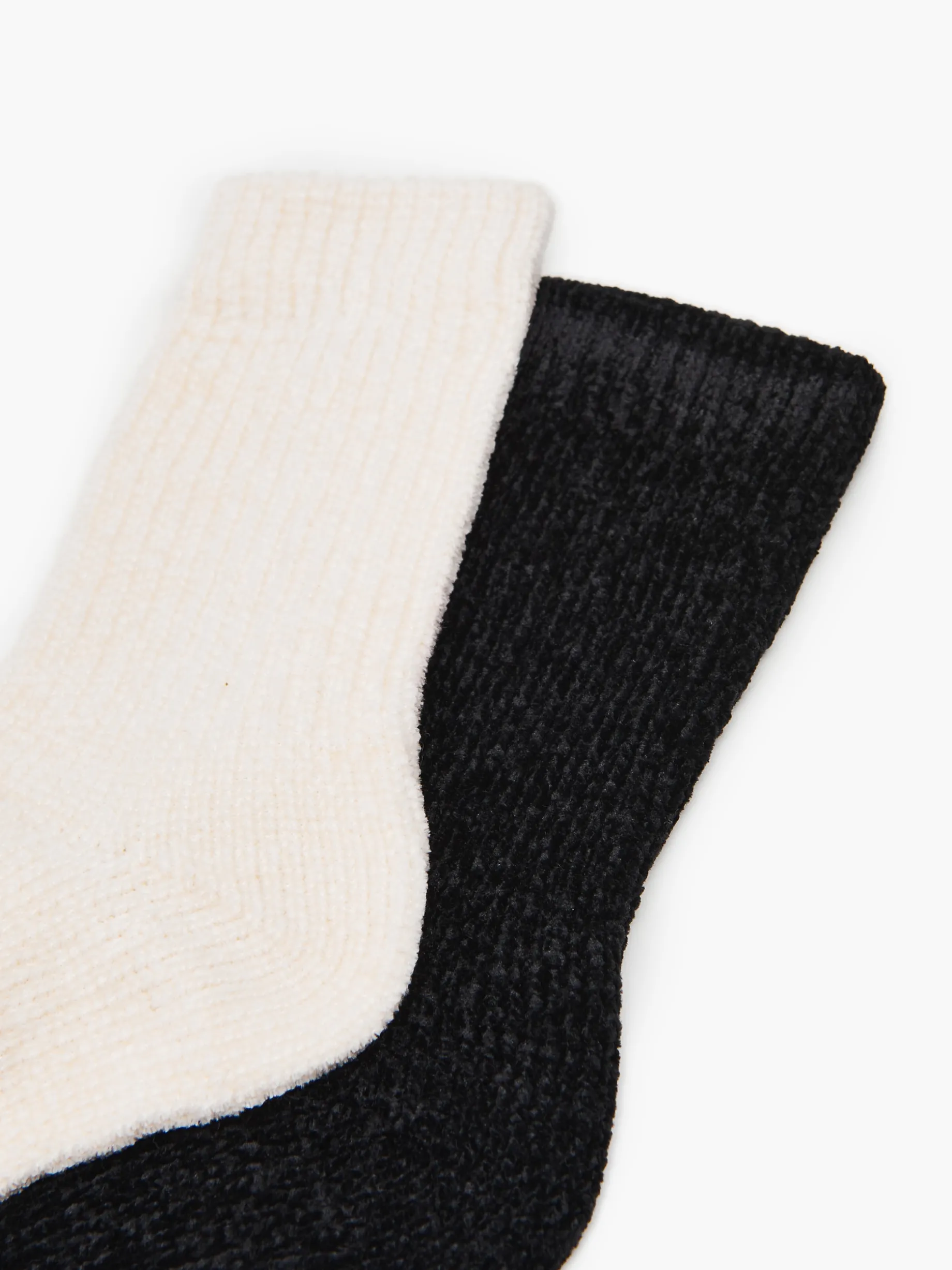 Zestaw dwóch par miękkich i grubych skarpet damskich o długim fasonie, uszytych z bardzo przyjemnej w dotyku szenili. W zestawie jedna para kremowa i jedna para czarna.