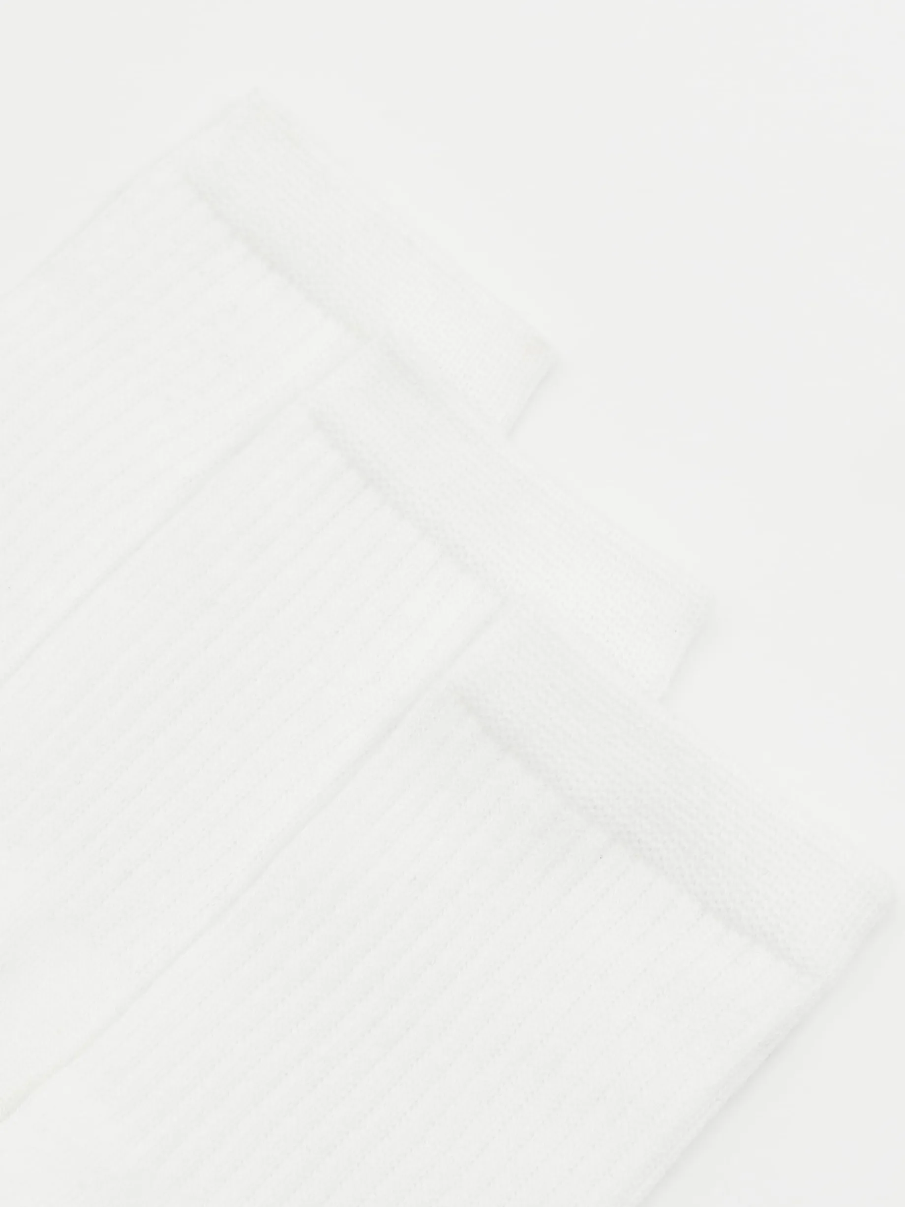 Trójpak długich skarpetek damskich w stylu sportowym, uszytych z dzianiny o wysokiej zawartośći bawełny. Każda z par wykończona elastycznym ściągaczem w prążki.