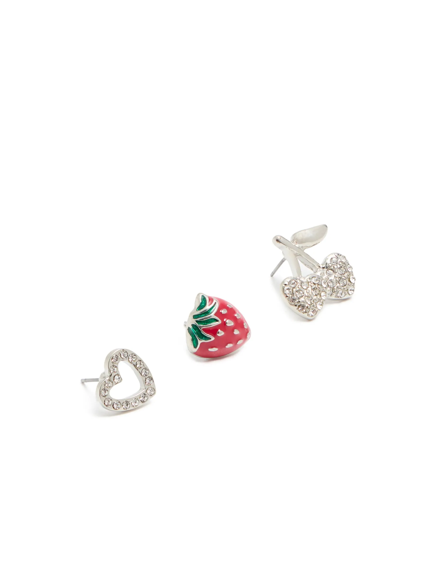 Zestaw 3 par damskich kolczyków, wykonanych z tworzywa w kolorze srebrnym. W zestawie motyw serca i wiśni zdobionych cyrkoniami oraz truskawek w ich naturalnym, czerwonym kolorze. Dodatkowo wygodne zapięcie na sztyft.
