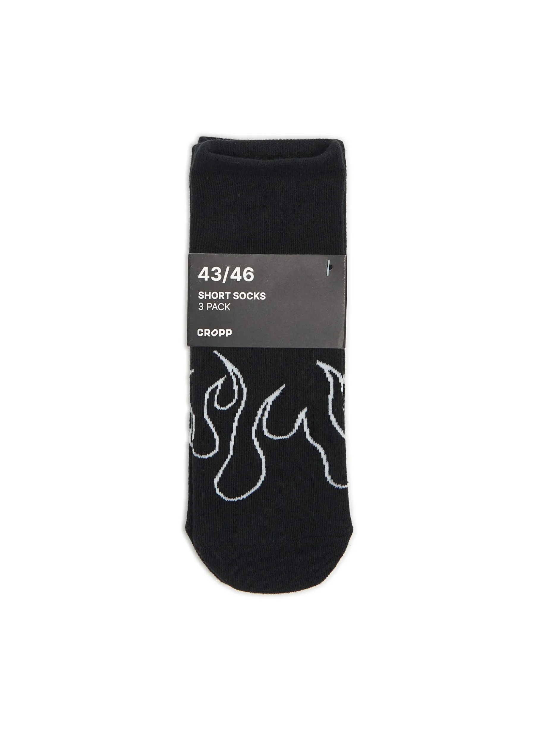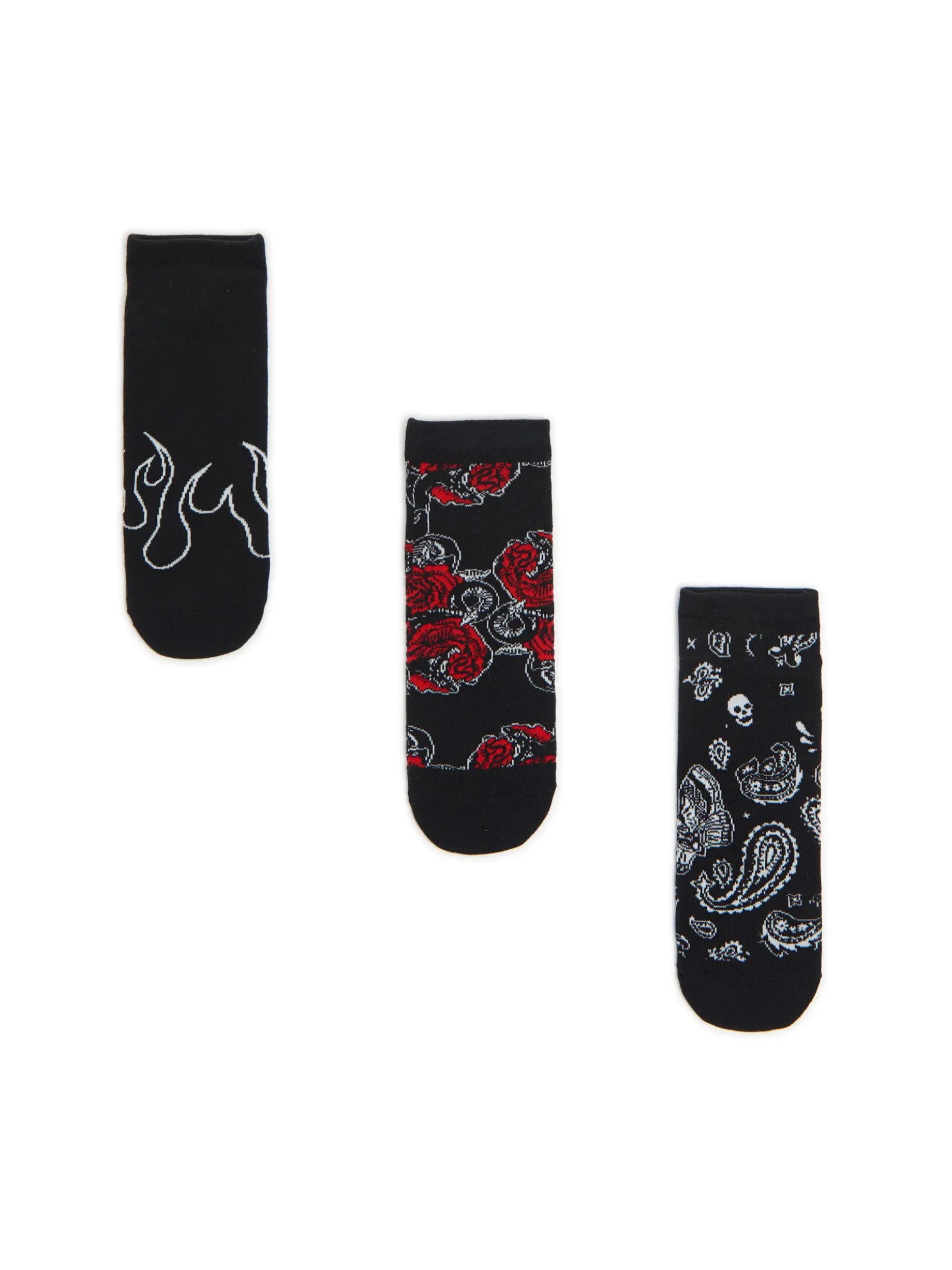 Zestaw 3 par męskich skarpet w czarnym kolorze o krótszym kroju. Oryginalne nadruki dopełnią Twoją stylizację! dzianina z dodatkiem elastycznych włókien krótki krój oryginalny print nadruki z imitacją płomieni, motywem kwiatowym i punkowymi elementami paisley