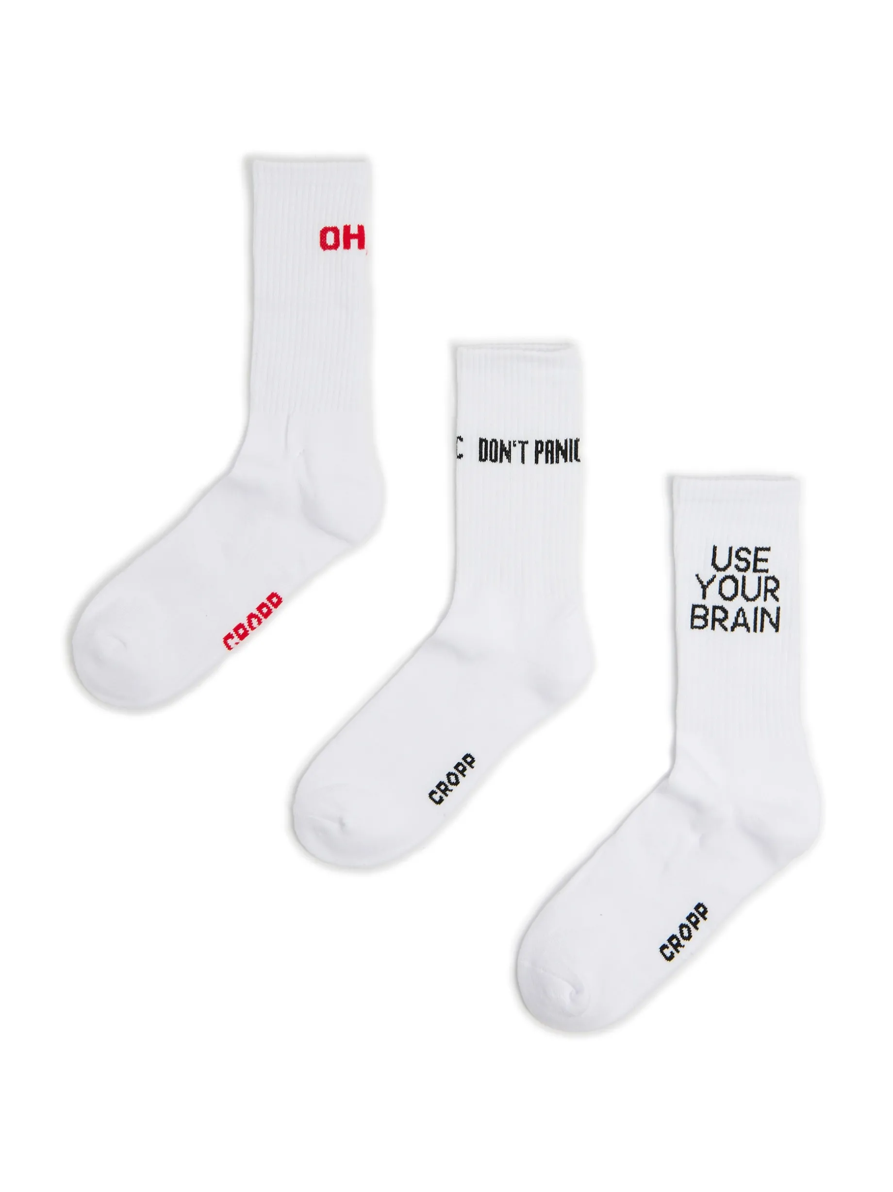 Zestaw trzech par długich, męskich skarpet, uszytych z dzianiny o dużej zawartości bawełny. Na każdej parze inny napis. Miksuj dowolnie! dzianinowy materiał z bawełną dłuższy, prosty krój nadruki tekstowe nadruk z napisem Cropp
