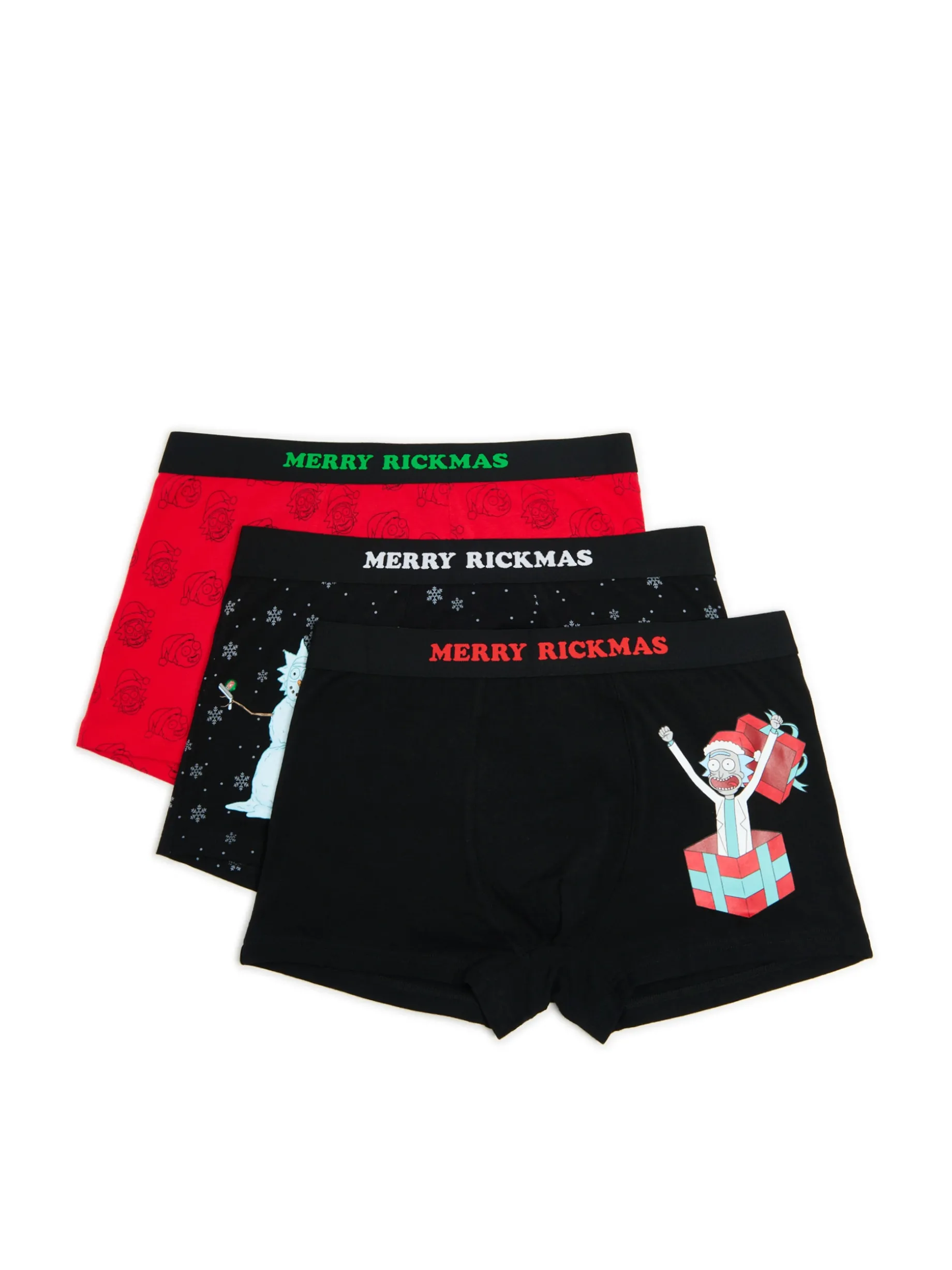 Zestaw trzech par majtek typu bokserki z licencjonowanym nadrukiem z serii Rick i Morty w świątecznym wydaniu. Item idealny na mikołajkowy prezent dla fanów serii! bawełna z dodatkiem elastycznych włókien regularny stan elastyczna gumka w pasie nadruk z motywem Xmas RICK AND MORTY and all related characters and elements © & TM CN. (s24)