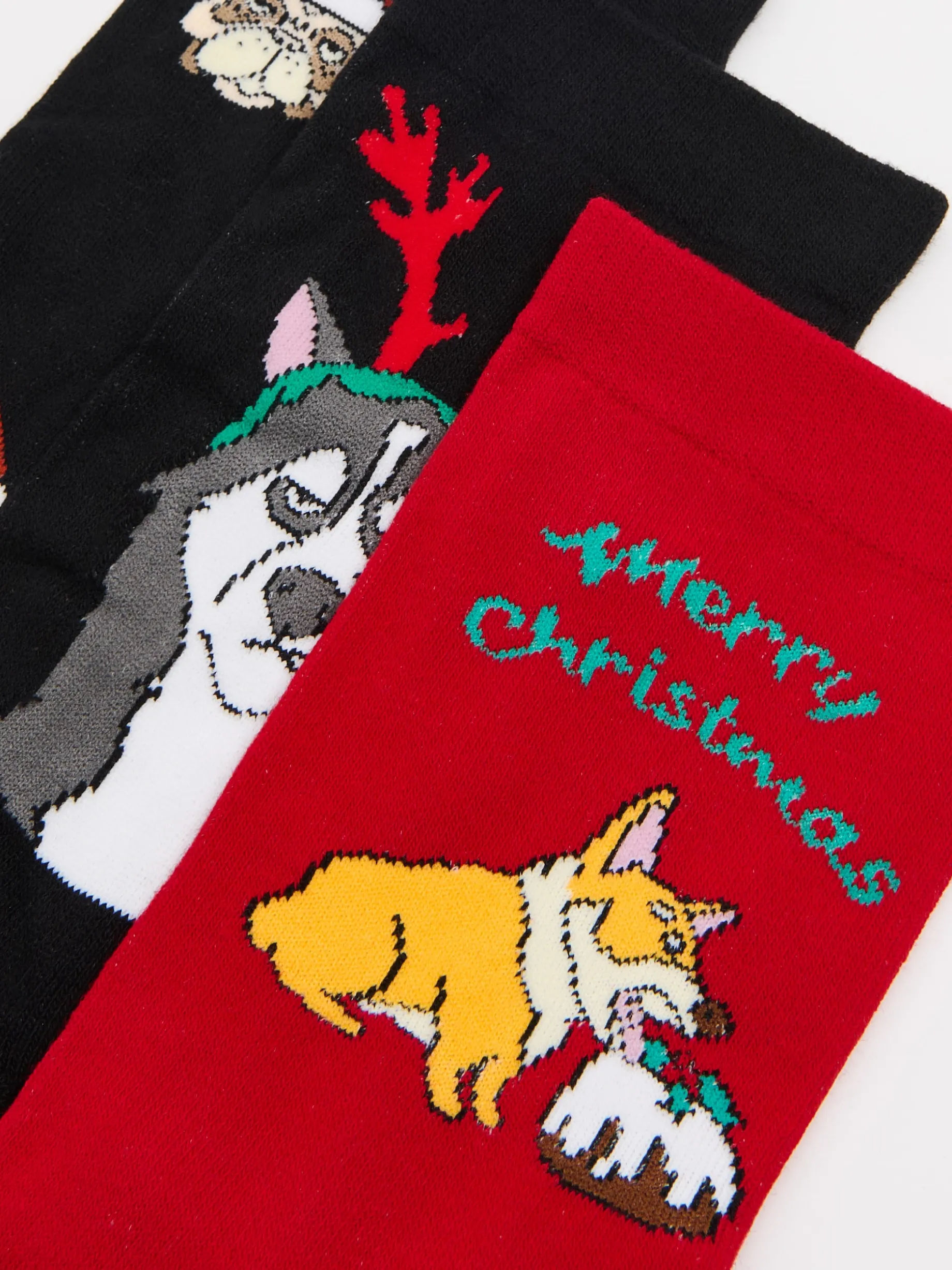 Idealny prezent świąteczny dla miłośników psów! Box zawiera zestaw 3 par męskich długich skarpet uszytych z przyjemnej w dotyku mieszanki dzianin. Każdy set ma nadruk z oryginalnym psem w bożonarodzeniowych wydaniu. Jeden klik i do koszyka! dzianina z dodatkiem elastycznych włókien dłuższy, prosty krój nadruk z motywem Xmas