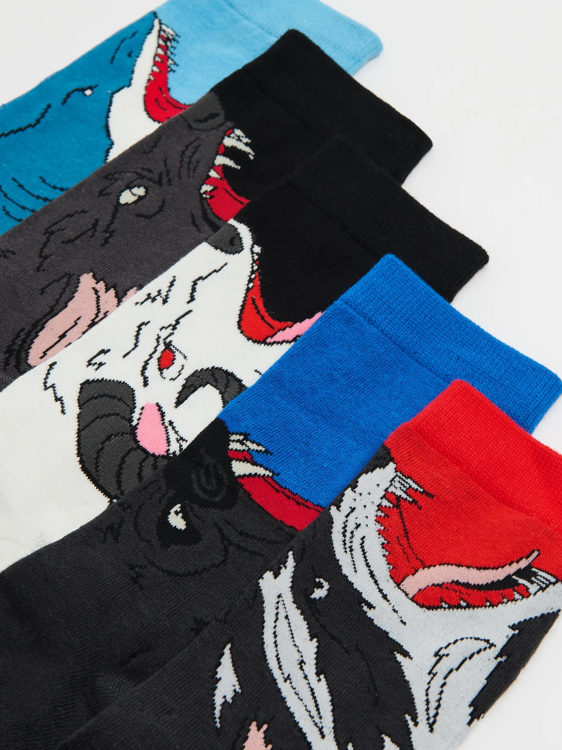 Zestaw pięciu par męskich długich skarpet, uszytych z dzianiny o wysokiej zawartości bawełny. Na każdym modelu nadruk ze zwierzęcym motywem, które możesz miksować w zależności od nastroju. dzianinowy materiał z bawełną dłuższy, prosty krój zwierzęcy wzór