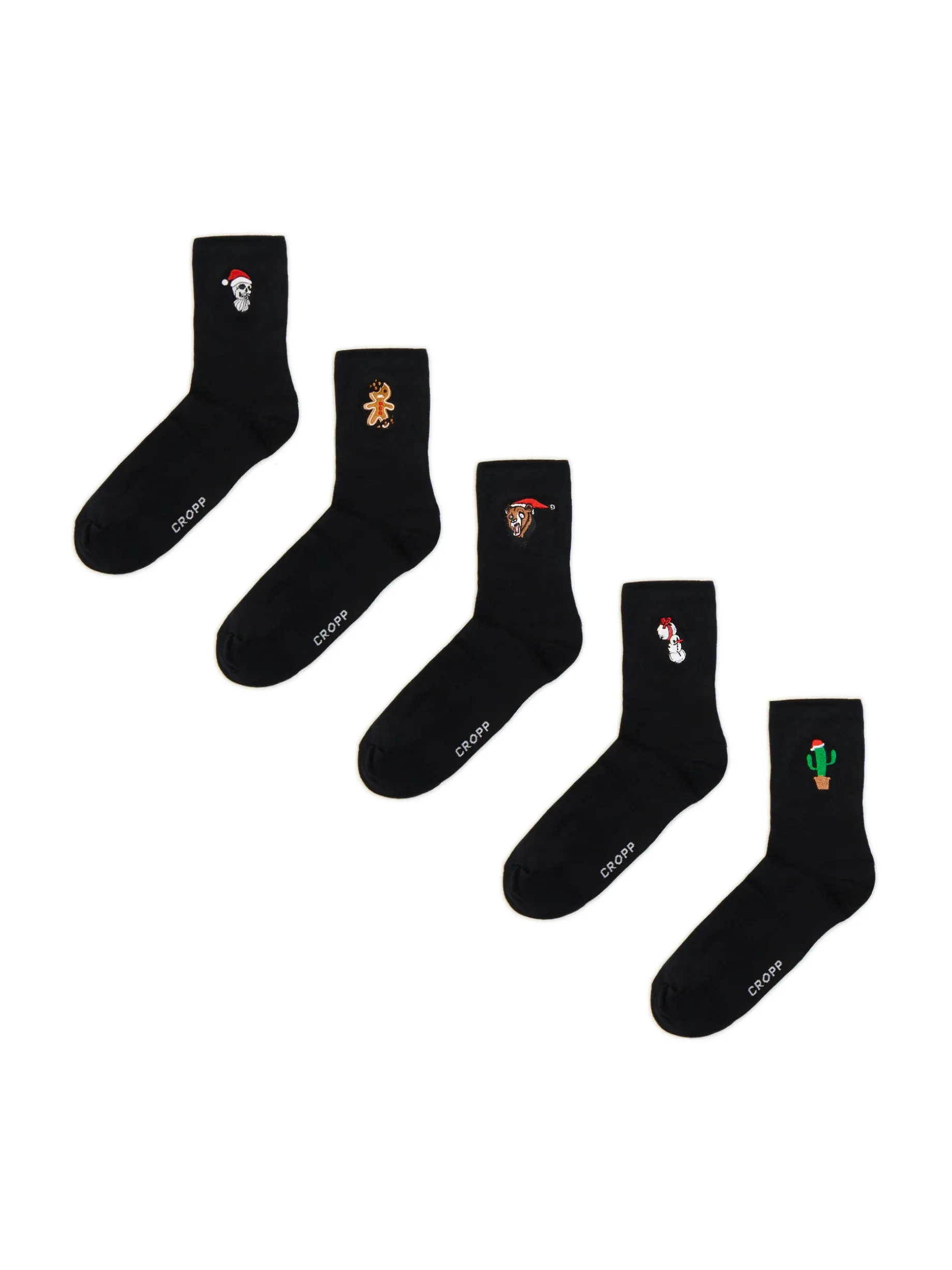 Zestaw pięciu męskich długich par skarpet uszytych z przyjemnej w dotyku mieszanki dzianin w kolorze czarnym. Każdy set ma odjechaną naszywkę z motywem świątecznym. Zapakowane w to piękne, zielone pudełko może być sztosowym pomysłem na prezent. dzianina z dodatkiem elastycznych włókien dłuższy, prosty krój ozdobne naszywki z motywem Xmas