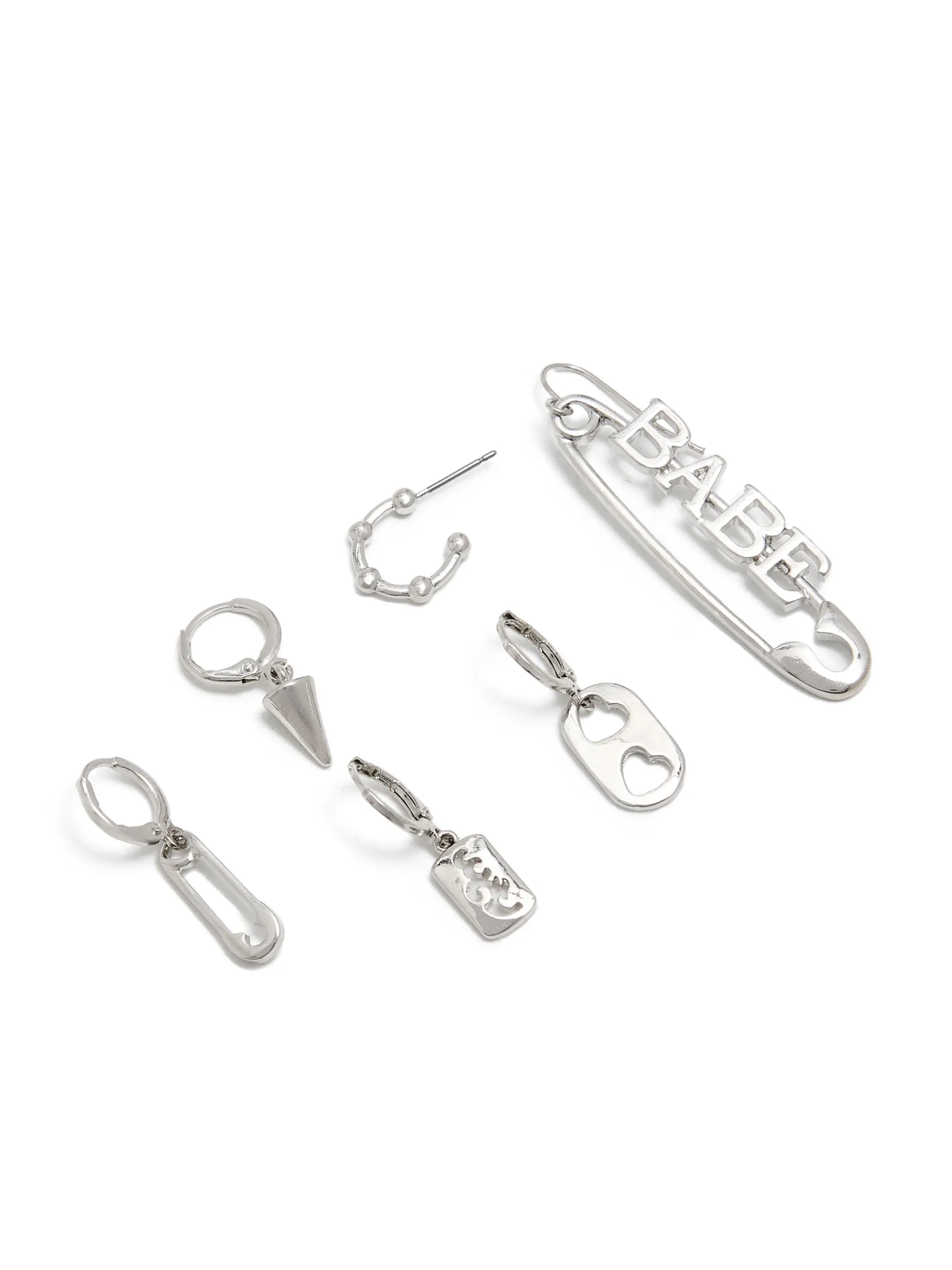 Zestaw 6 par damskich kolczyków wykonanych z tworzywa w kolorze srebrnym. Modele z różnymi zapięciami na sztyft, zatrzask lub typu kreol, które możesz mieszać dowolnie.