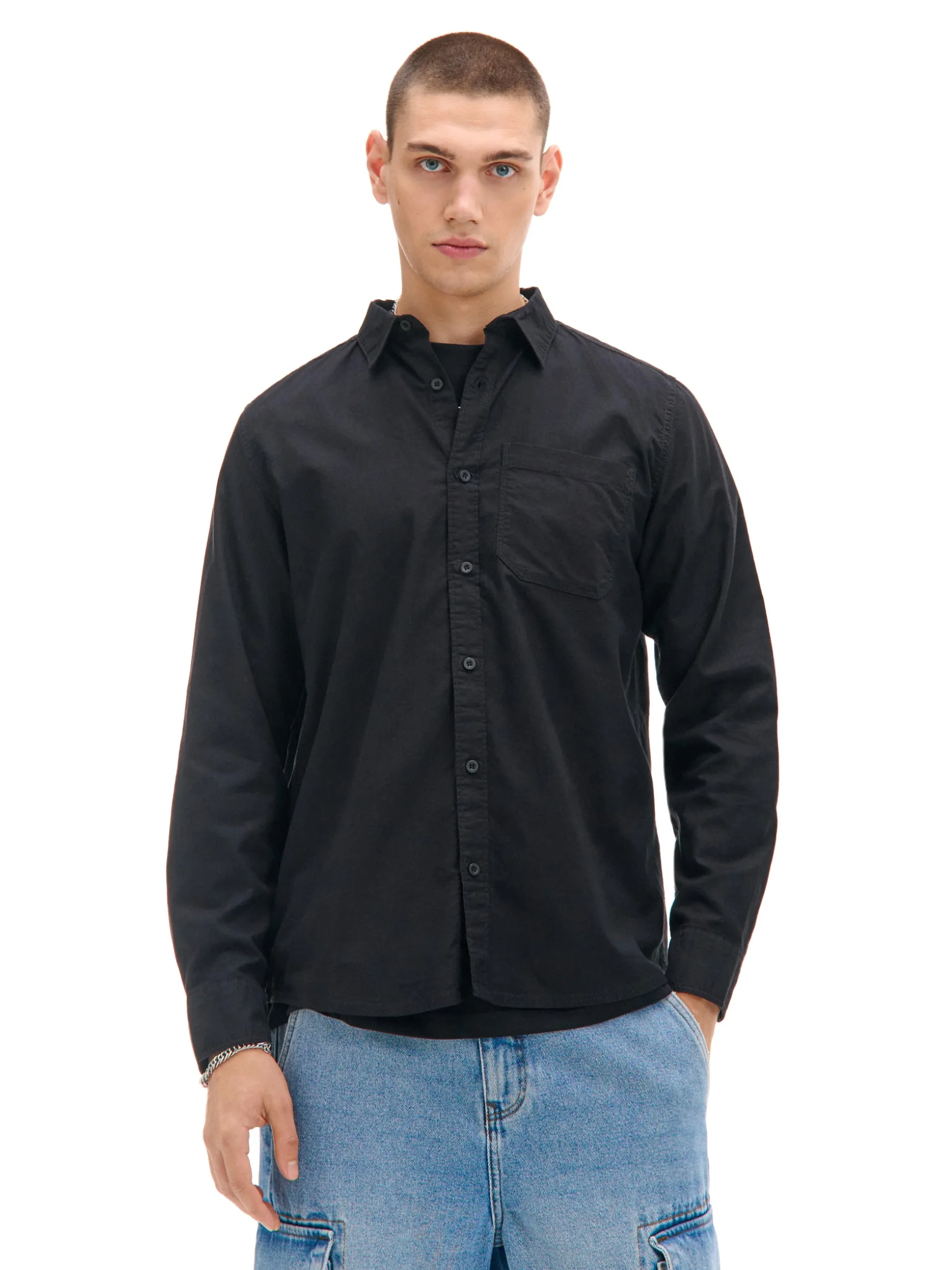 Męska czarna koszula, uszyta z wyjątkowej odmiany przewiewnej bawełny o pięknej teksturze. Idealna na specjalne okazje! wygodna i oddychająca bawełna typu chambray regularny krój zapięcie na guziki na całej długości klasyczny kołnierzyk długie rękawy zakończone mankietem z guzikami naszywana kieszeń na piersi