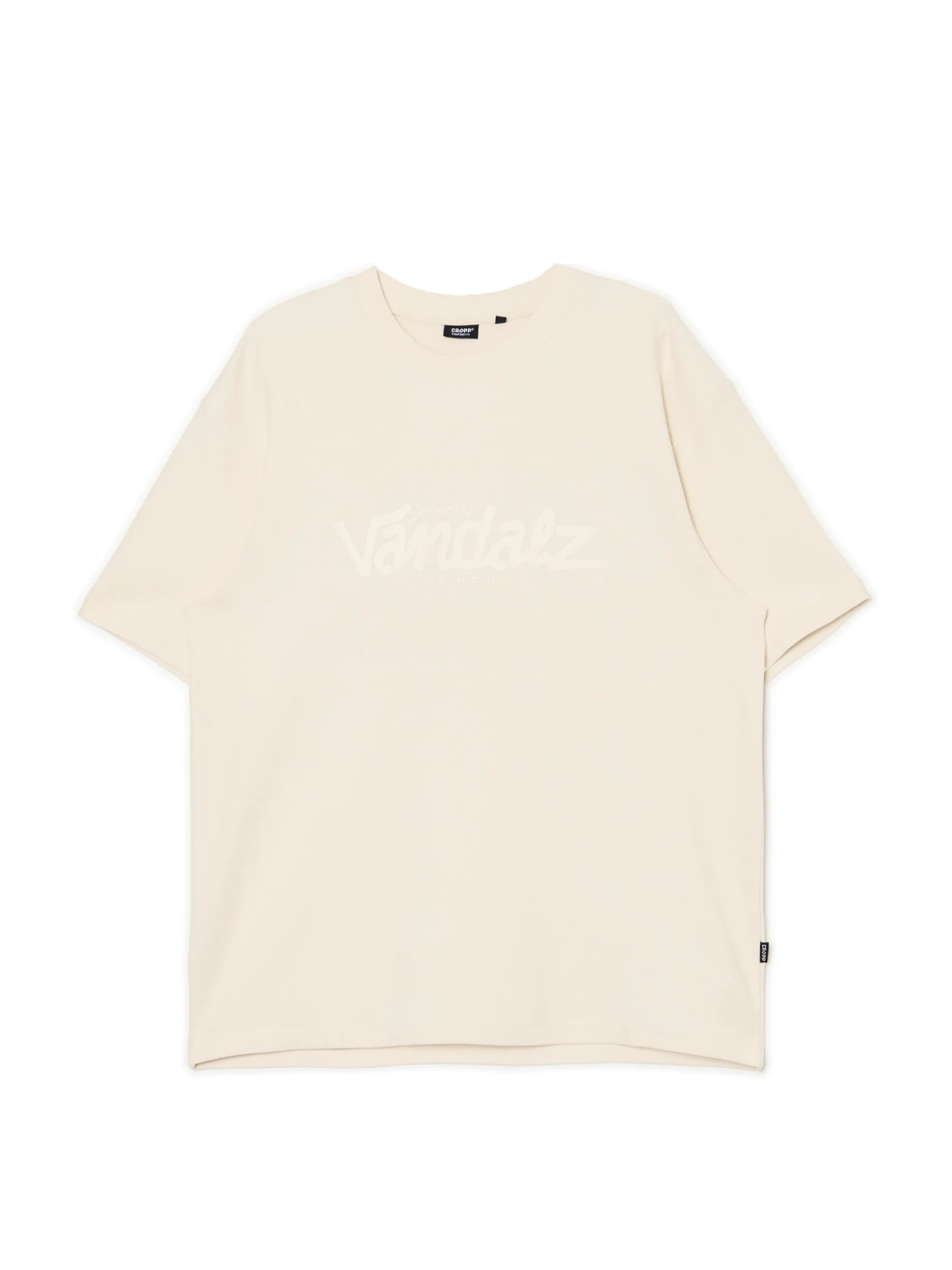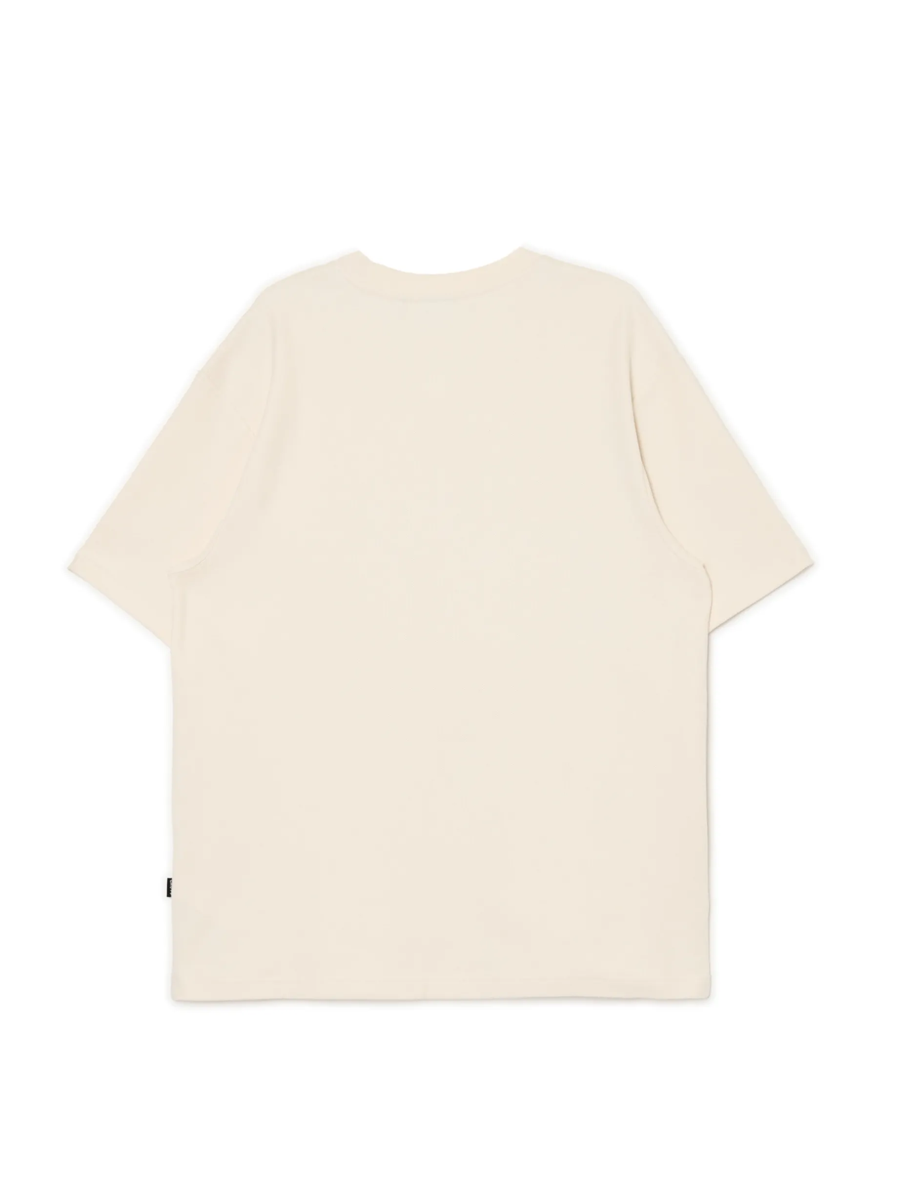 Męski beżowy T-shirt o kroju comfort, uszyty w 100% z bawełny. prosty, luźny krój krótkie rękawy napis z przodu