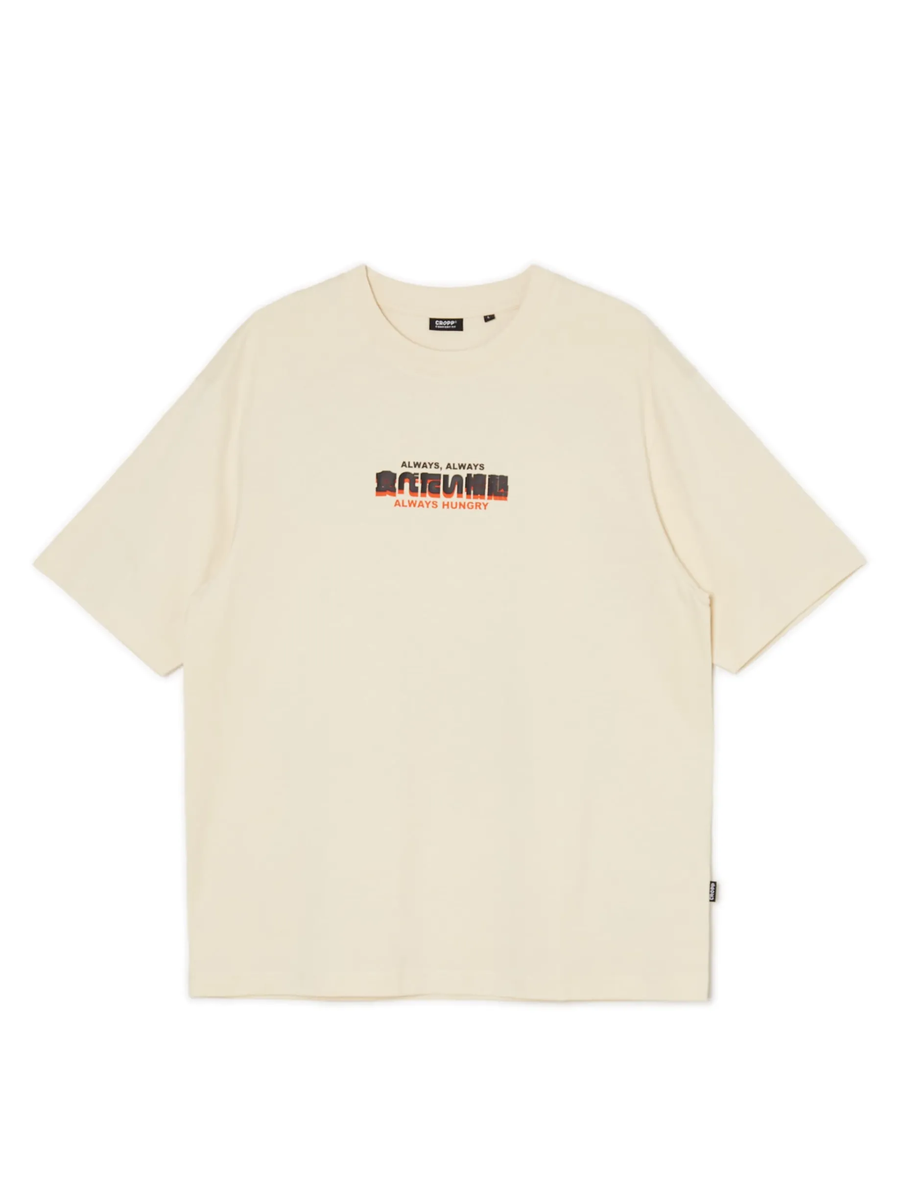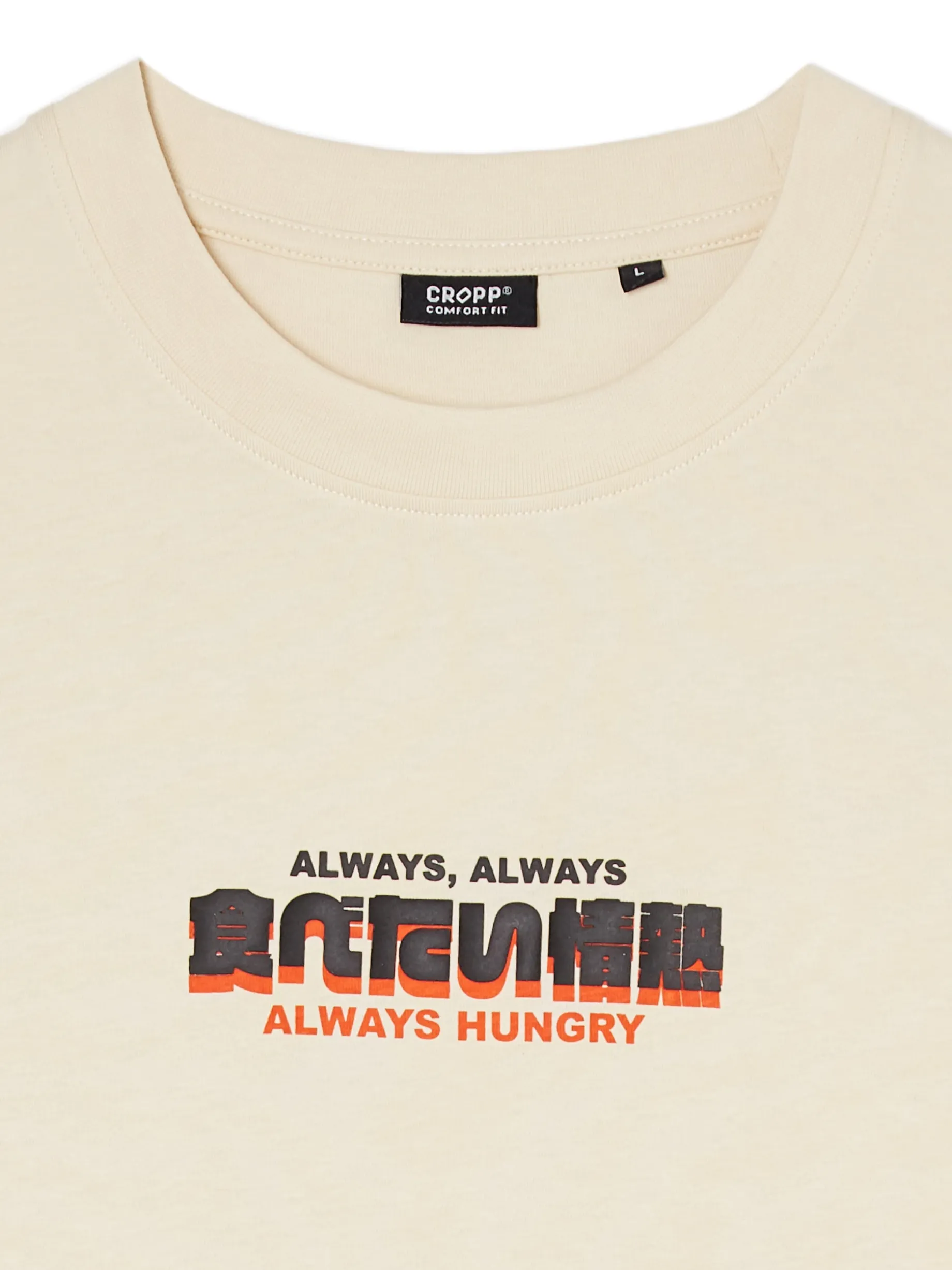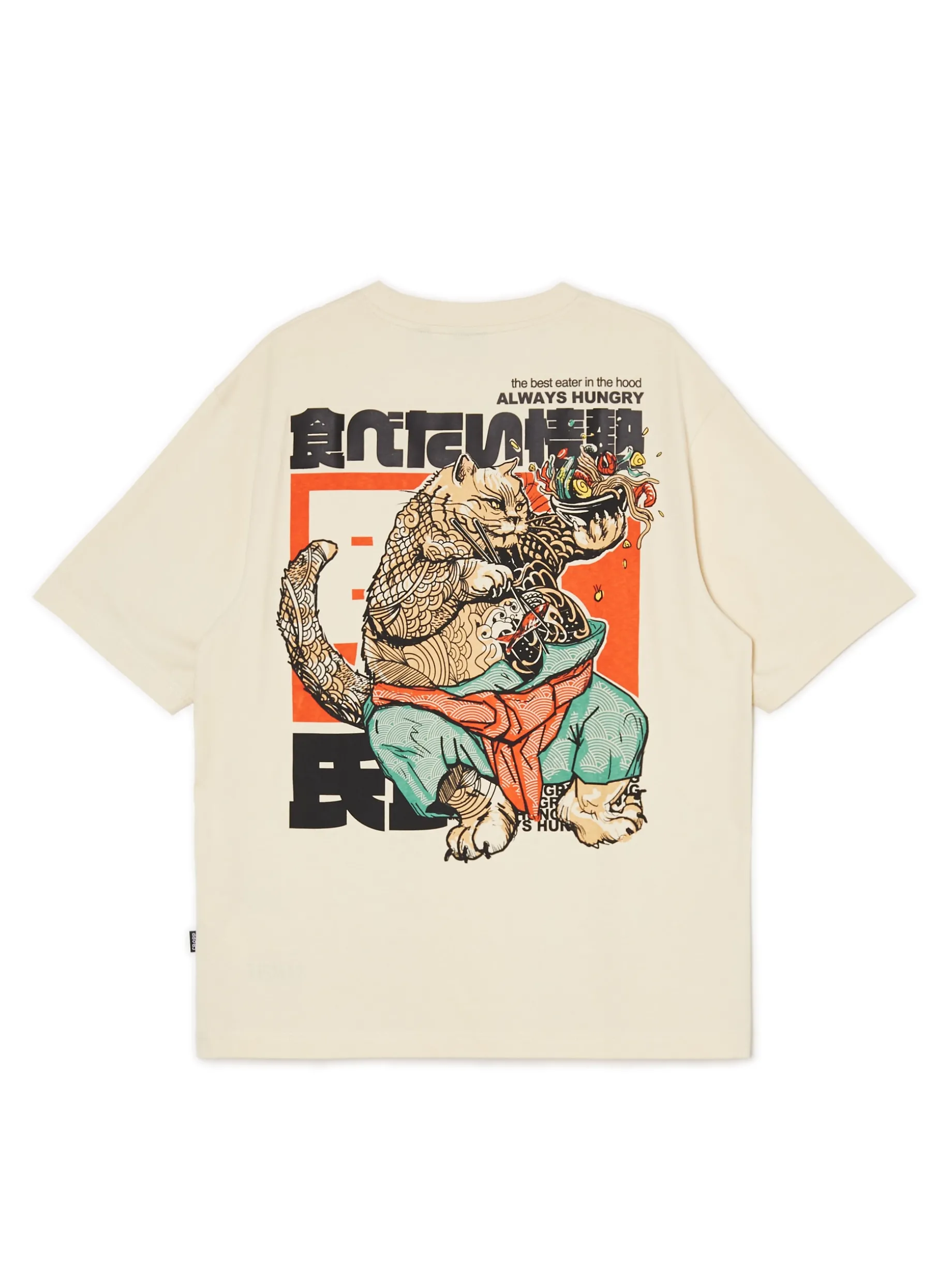 Męska kremowa koszulka, uszyta w 100% z bawełny. fason comfort krótkie rękawy z przodu nadruk typu puff print na plecach duży nadruk z motywem kota jedzącego ramen