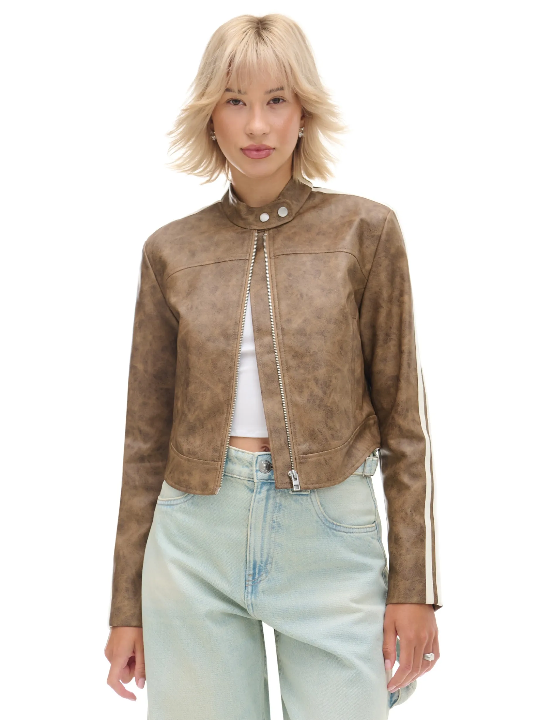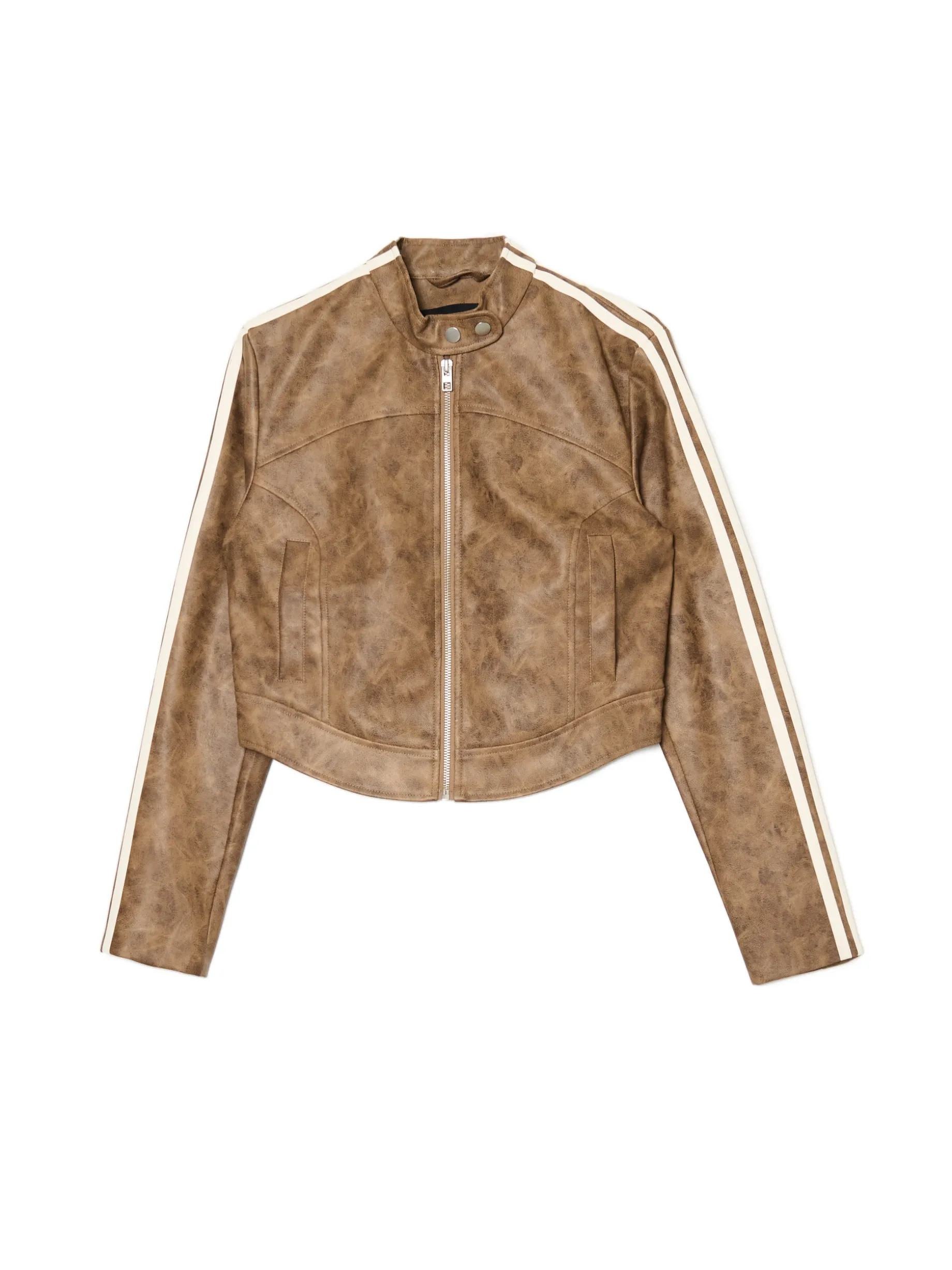 Kurtka damska typu biker, uszyta z dzianiny w kolorze beżowym. Ten wyjątkowy deseń i dekoracyjne pasy na rękawach, to idealne dodatki do wielu stylizacji. przejściowa kurtka typu biker wykonana z imitacji skóry zapinana na zamek na całej długości wewnątrz wykończenie na podszewce niska stójka z zapięciem na zatrzaski długie, proste rękawy dwie kieszenie po bokach dekoracyjne pasy na rękawach delikatnie wydłużony przód Wzrost modelki: 177 cm