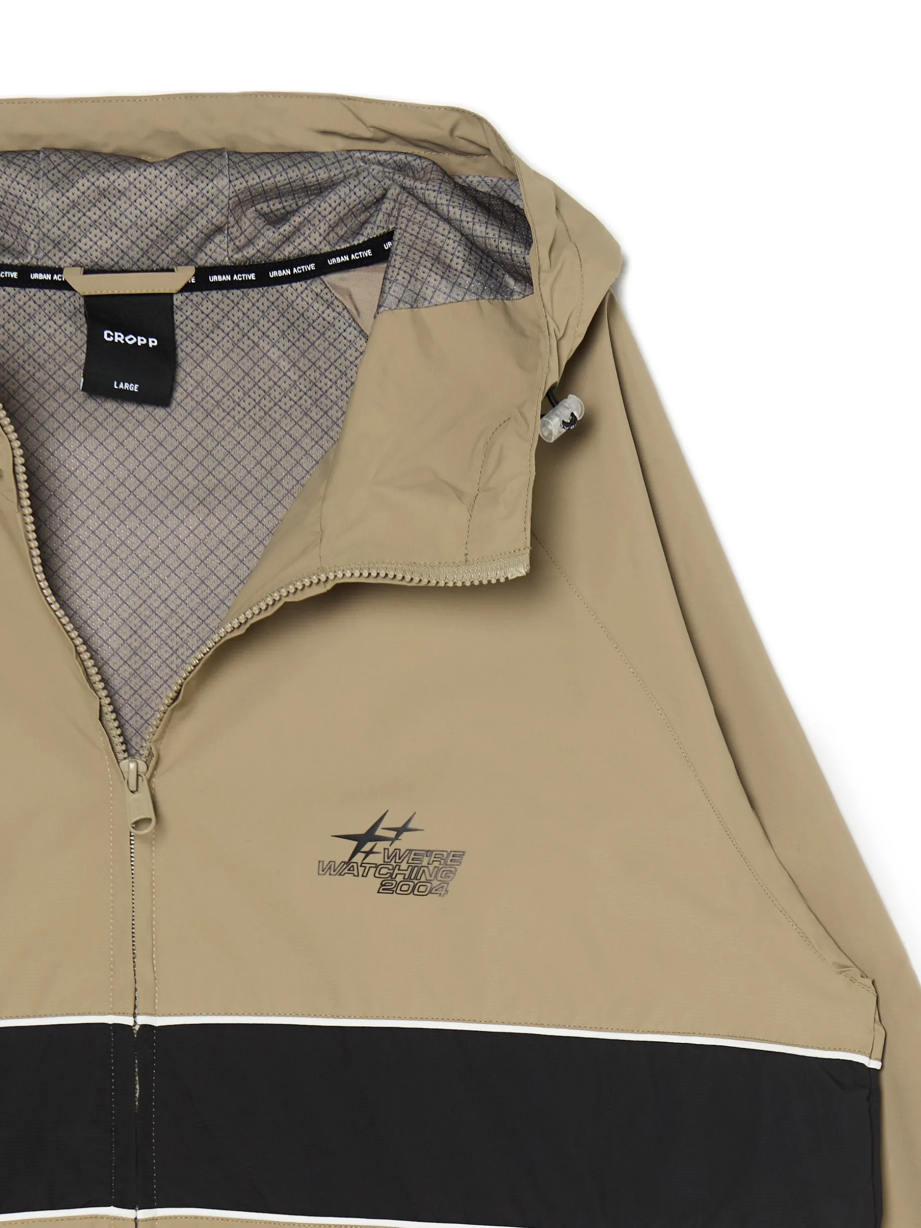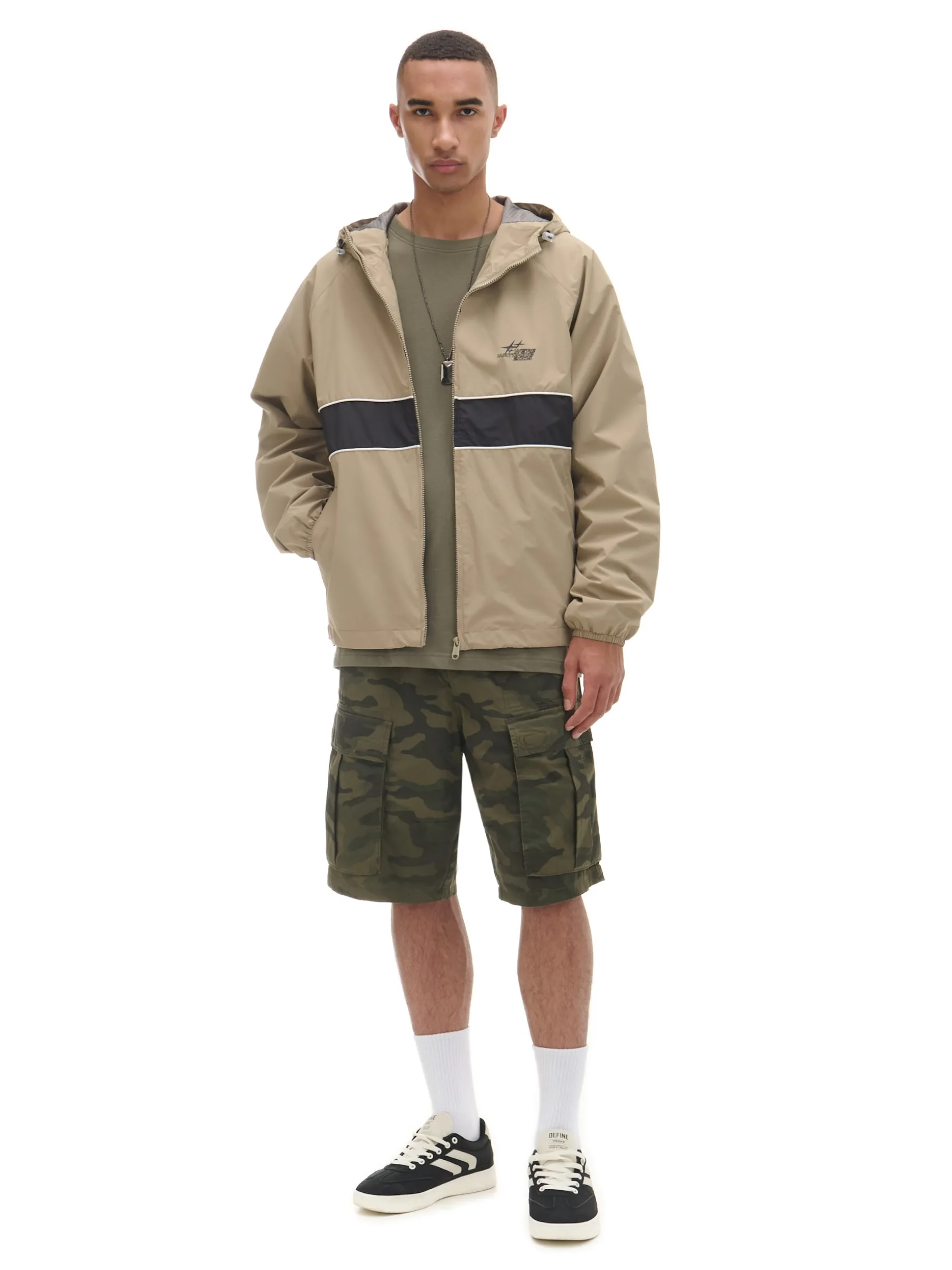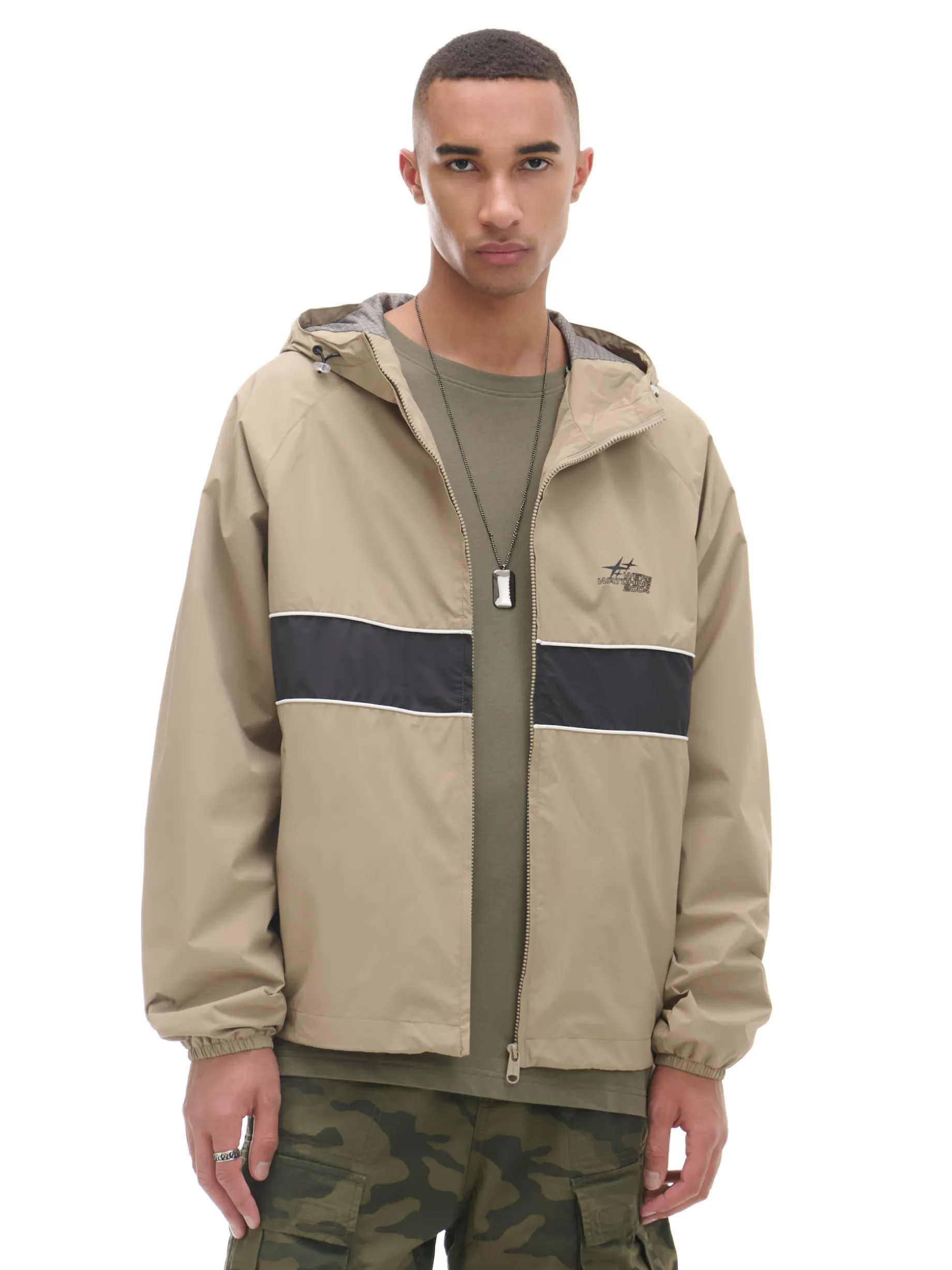 Męska lekka kurtka z kapturem, uszyta z gładkiej beżowek tkaniny. zapięcie na suwak kaptur regulowany za pomocą elastycznych gumek ze stoperami długie rękawy zakończone ściączem z wszytą elastyczną gumką mały nadruk na piersi dolny brzeg regulowany za pomocą elastycznych gumek ze stoperami dwie kieszenie zewnętrzne wewnętrzna kieszeń zapinana na rzep podszewka z lekkiej siateczki mesh Wzrost modela: 185 cm PROTECTION LEVEL 1rn rnKurtka uszyta z tkaniny, której właściwości zapewnią Ci ochronę przed wiatrem. Możesz ją nosić jako lekkie okrycie wierzchnie i łączyć z cieplejszymi ubraniami.