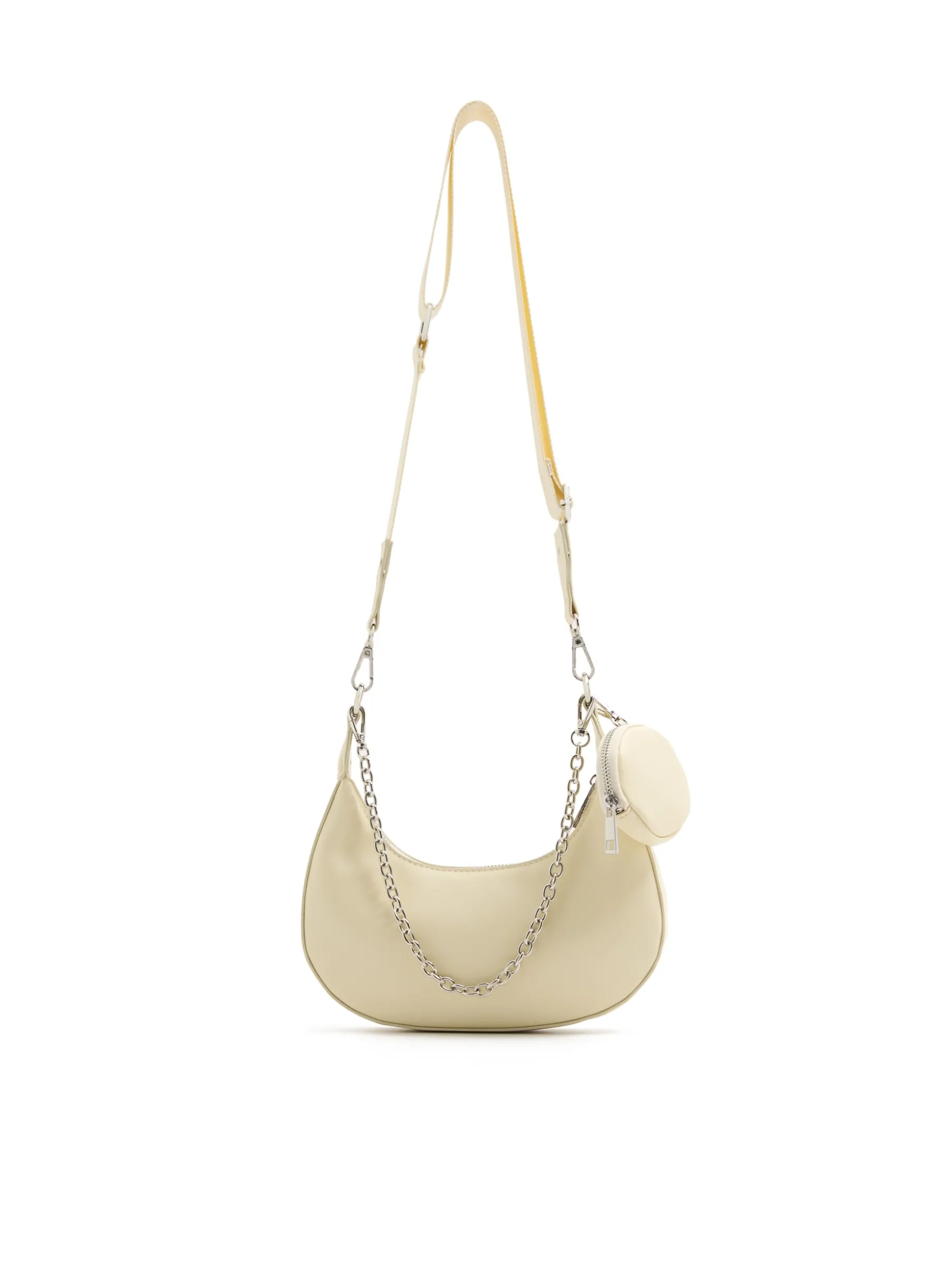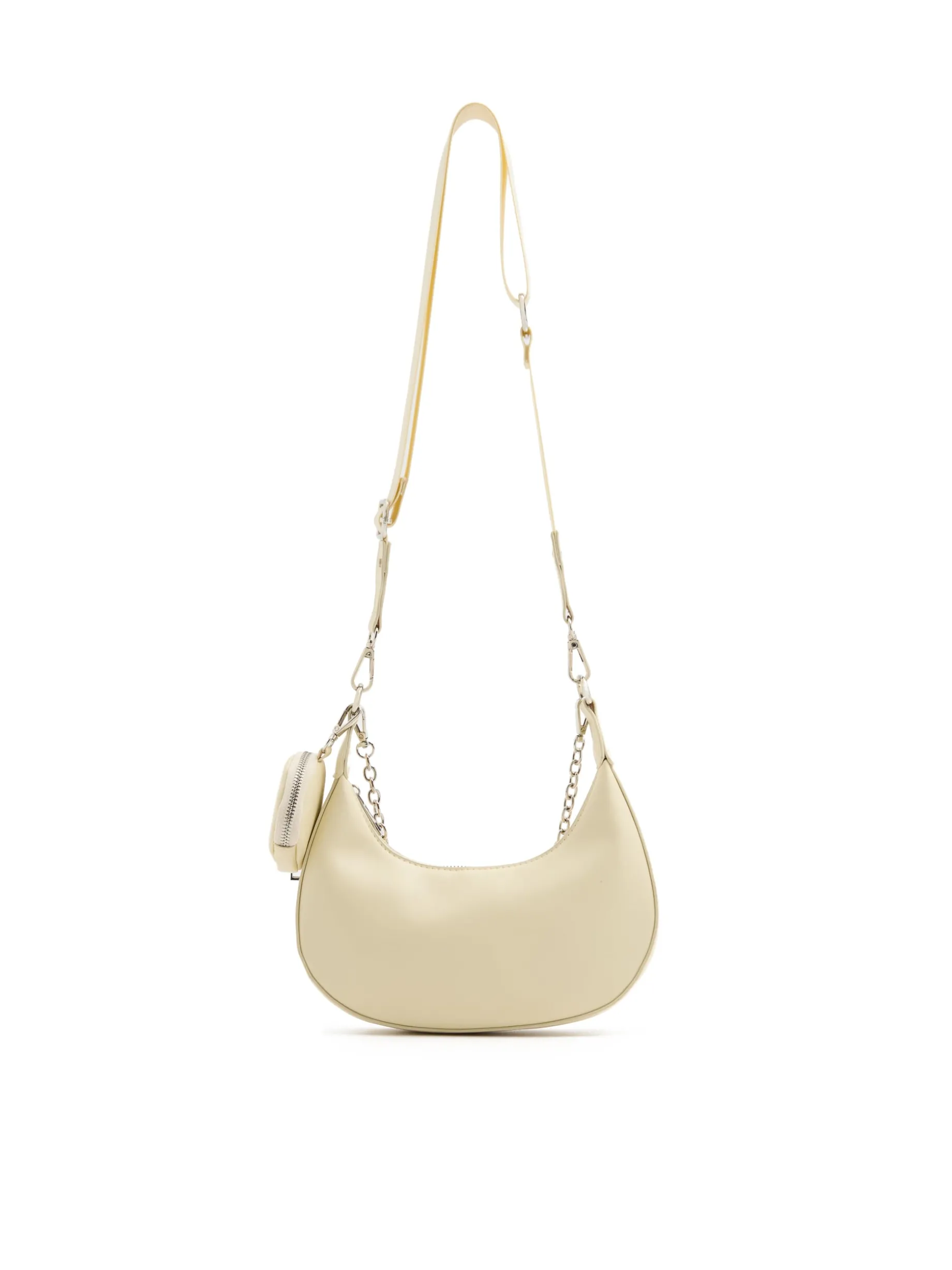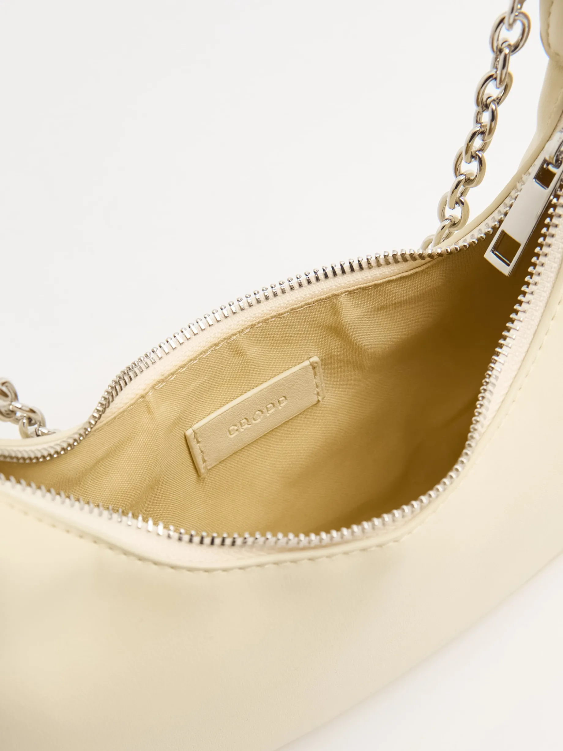 Damska mała torebka wykonana z kremowej imitacji skóry. Idealny dodatek do imprezowego outfitu! główna komora z zapięciem na zamek pasek z regulacją długości dodatkowy, dekoracyjny łańcuch metalowe detale karabińczyk do mocowania kluczy lub innych akcesoriów torebka dostępna w dwóch wersjach kolorystycznych Wymiary produktu: 12 x 25 x 4 cm